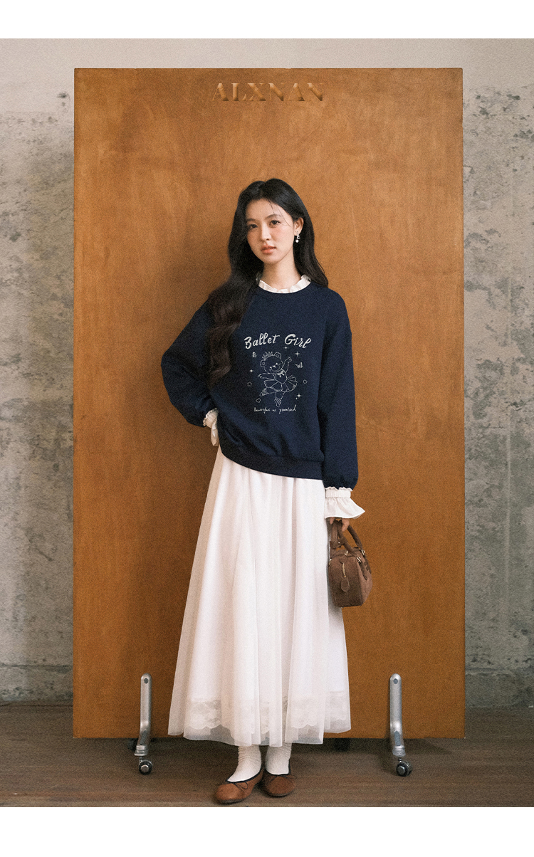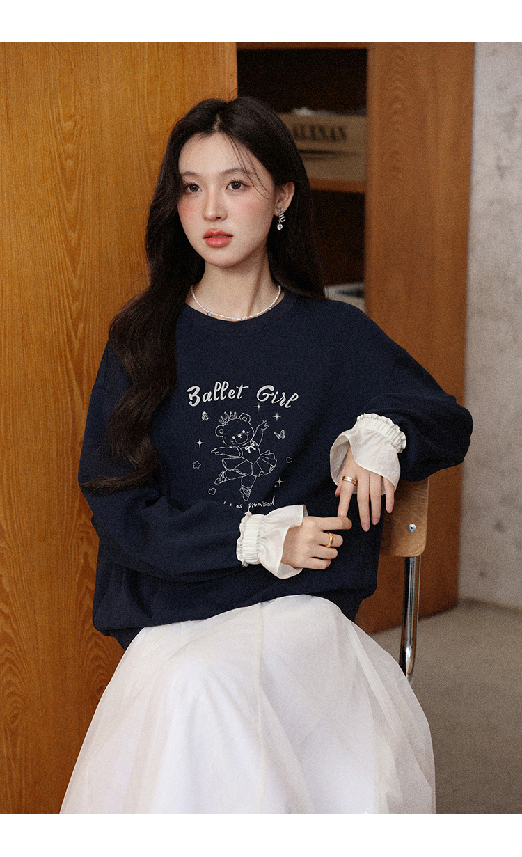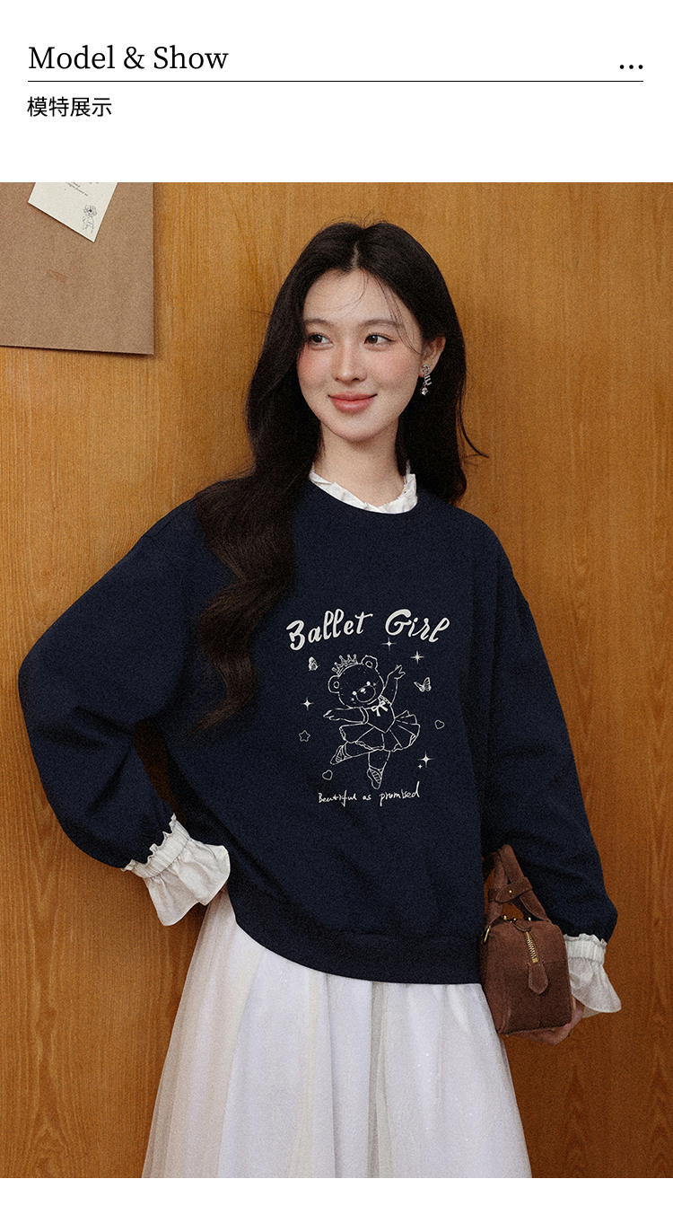 鹿向南「布朗茶茶」藏青色小熊芭蕾圆领套头卫衣宽松显瘦上衣女秋