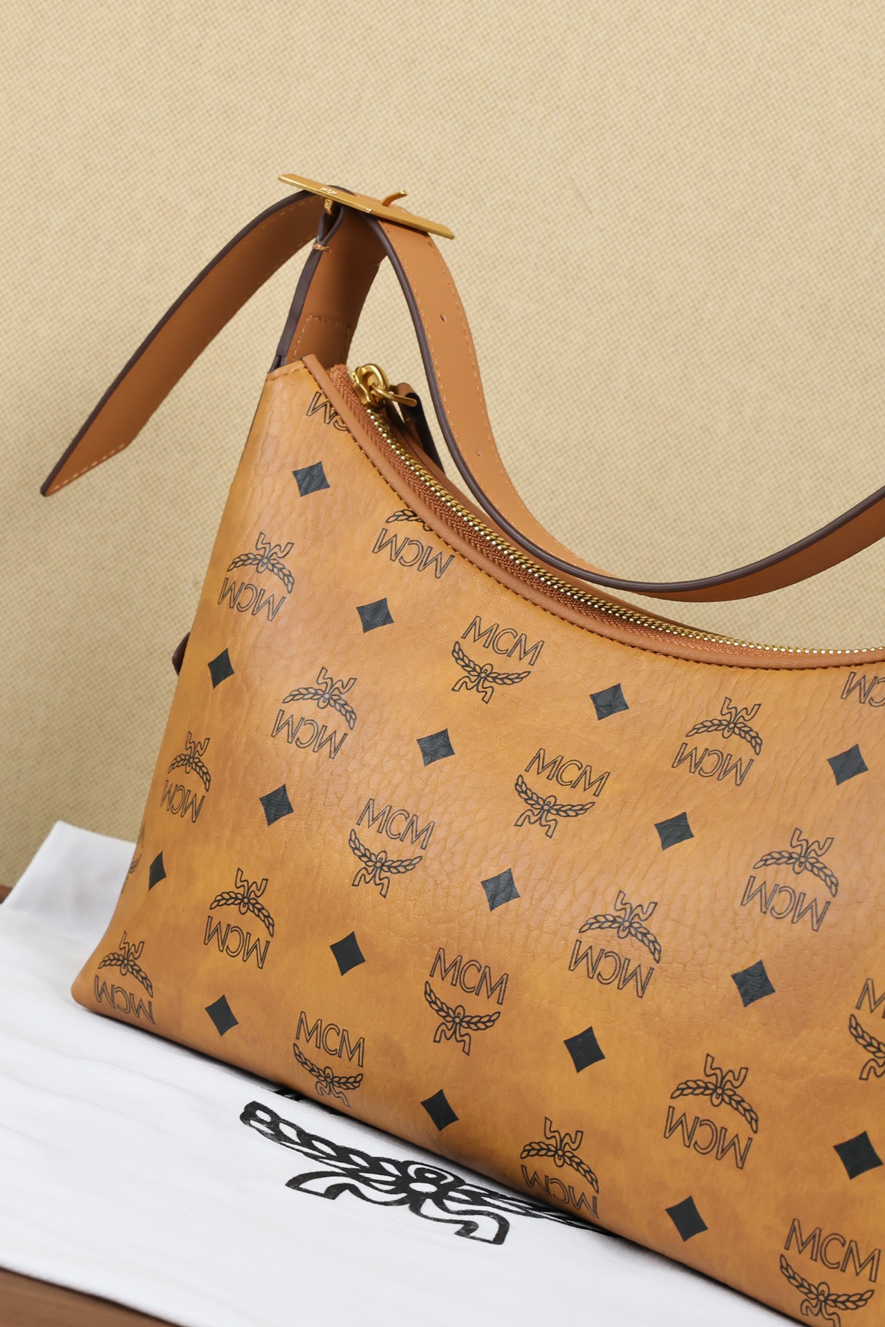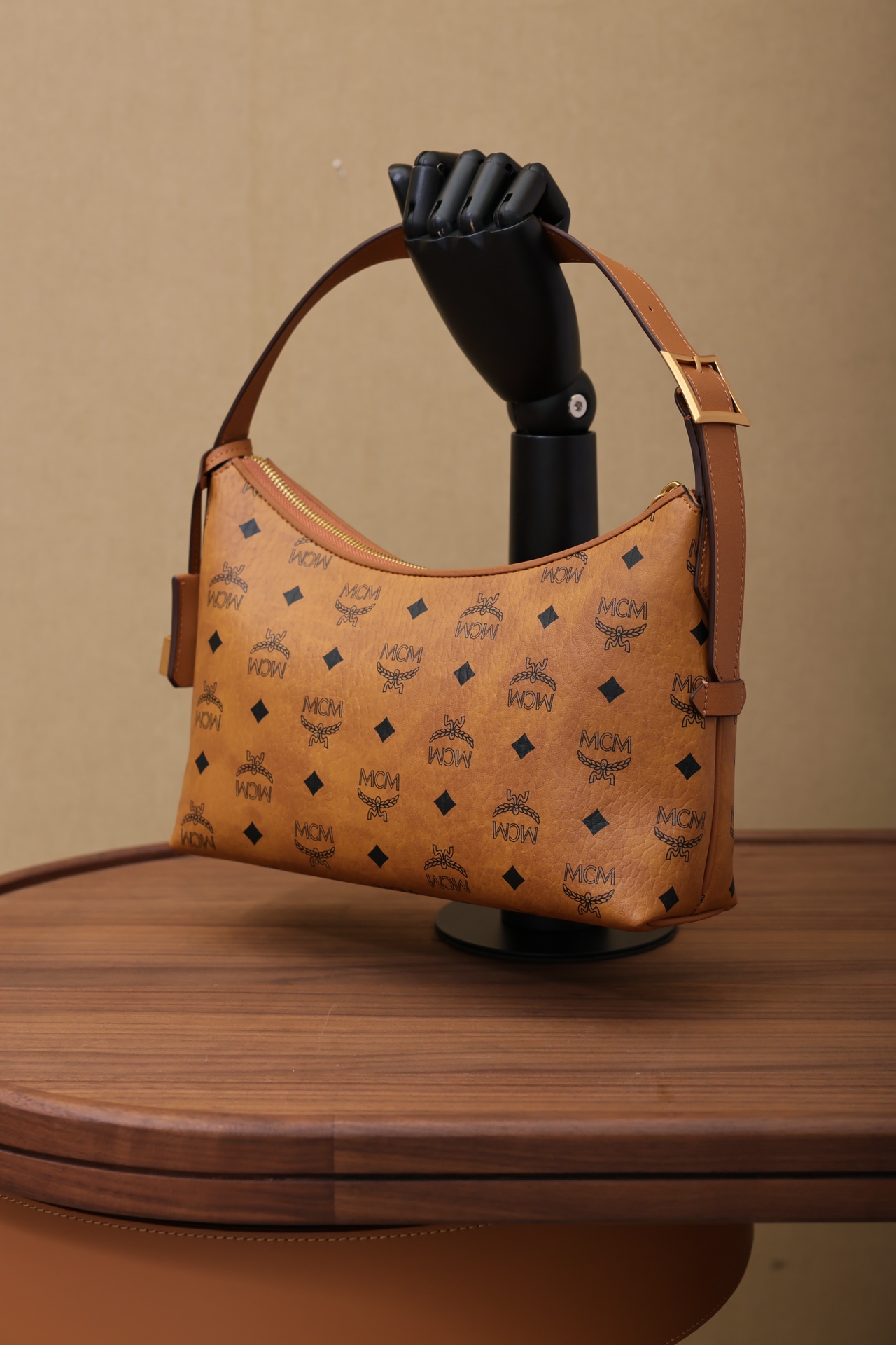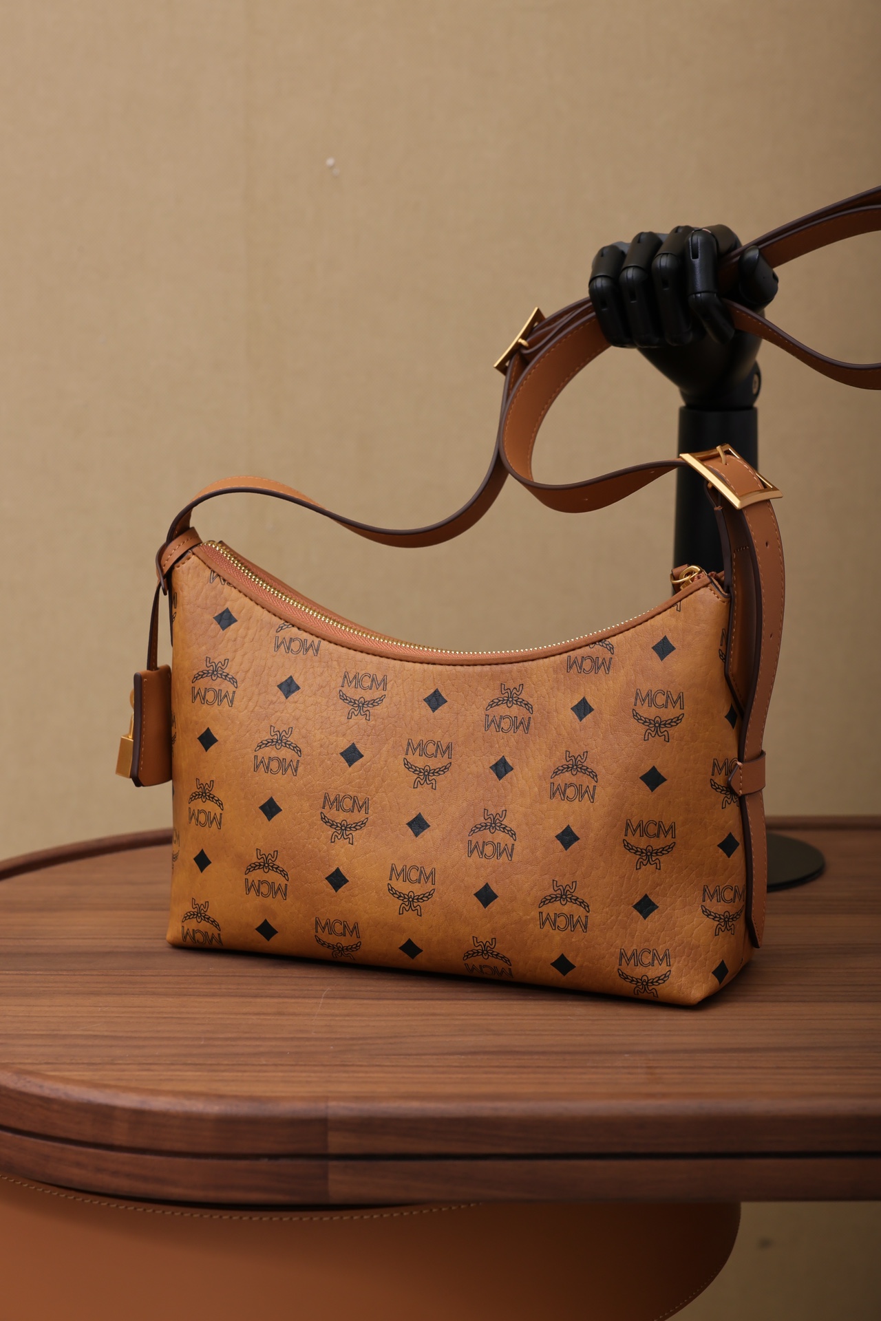 这款单品对经典的休闲款式进行了现代风的全新演绎,在柔软与挺阔之间取得了理想的平衡。这款小号Aren Hobo肩背包采用了传统MCM行李箱的设计元素,包括一个可拆卸皮革吊牌及雕花Logo挂锁,达到锦上添花的效果。