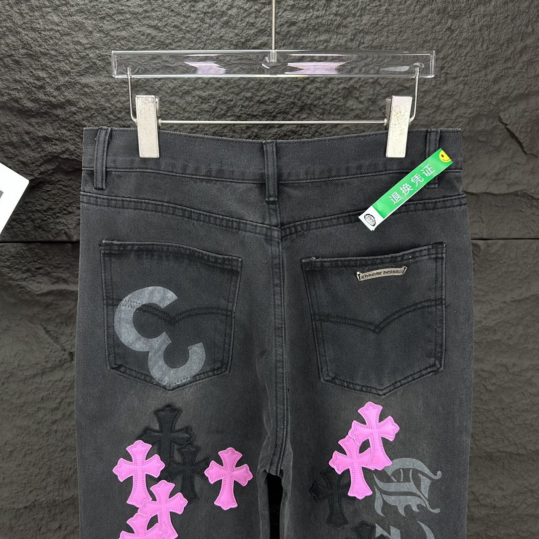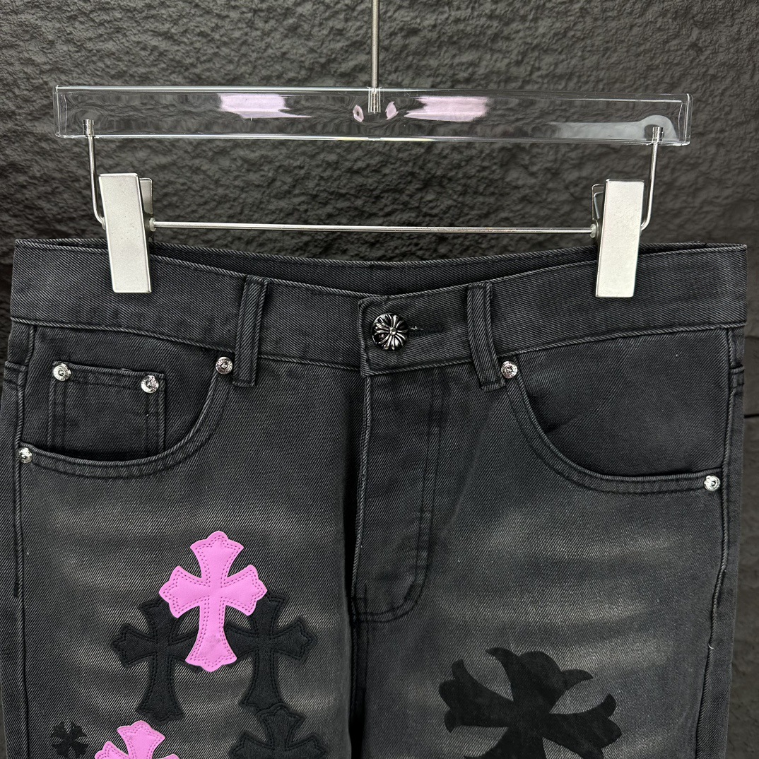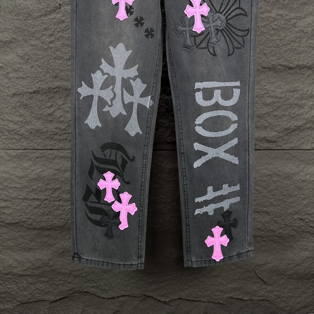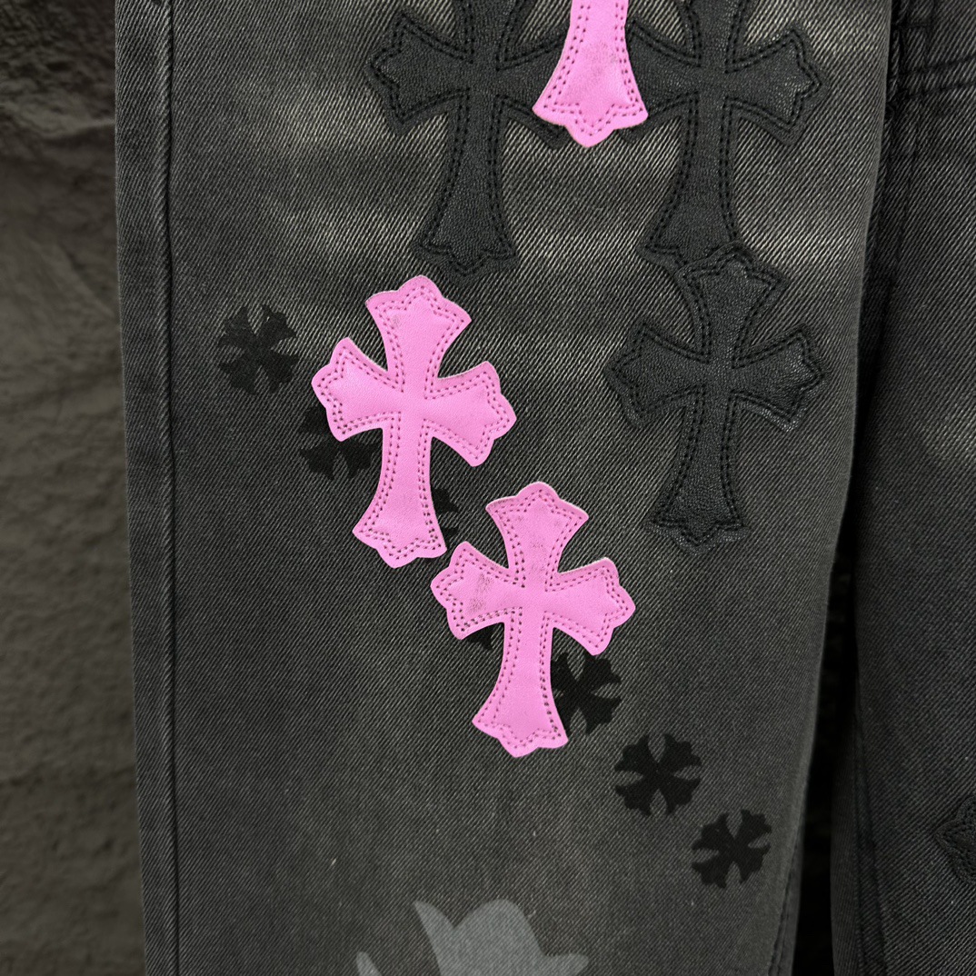 CH克罗伈2025 新款重工粉色十字架贴皮 情侣款水洗牛仔裤潮牌长裤