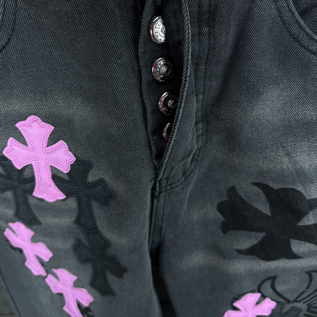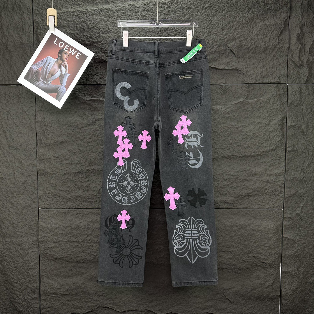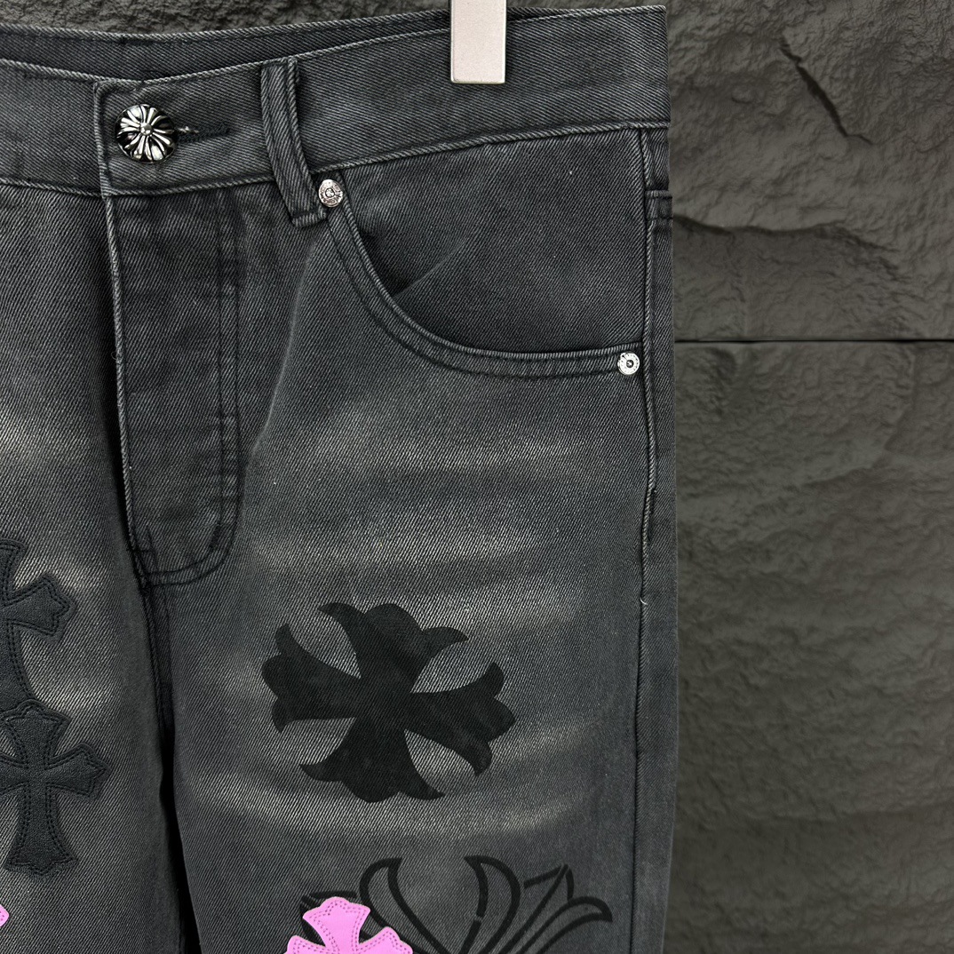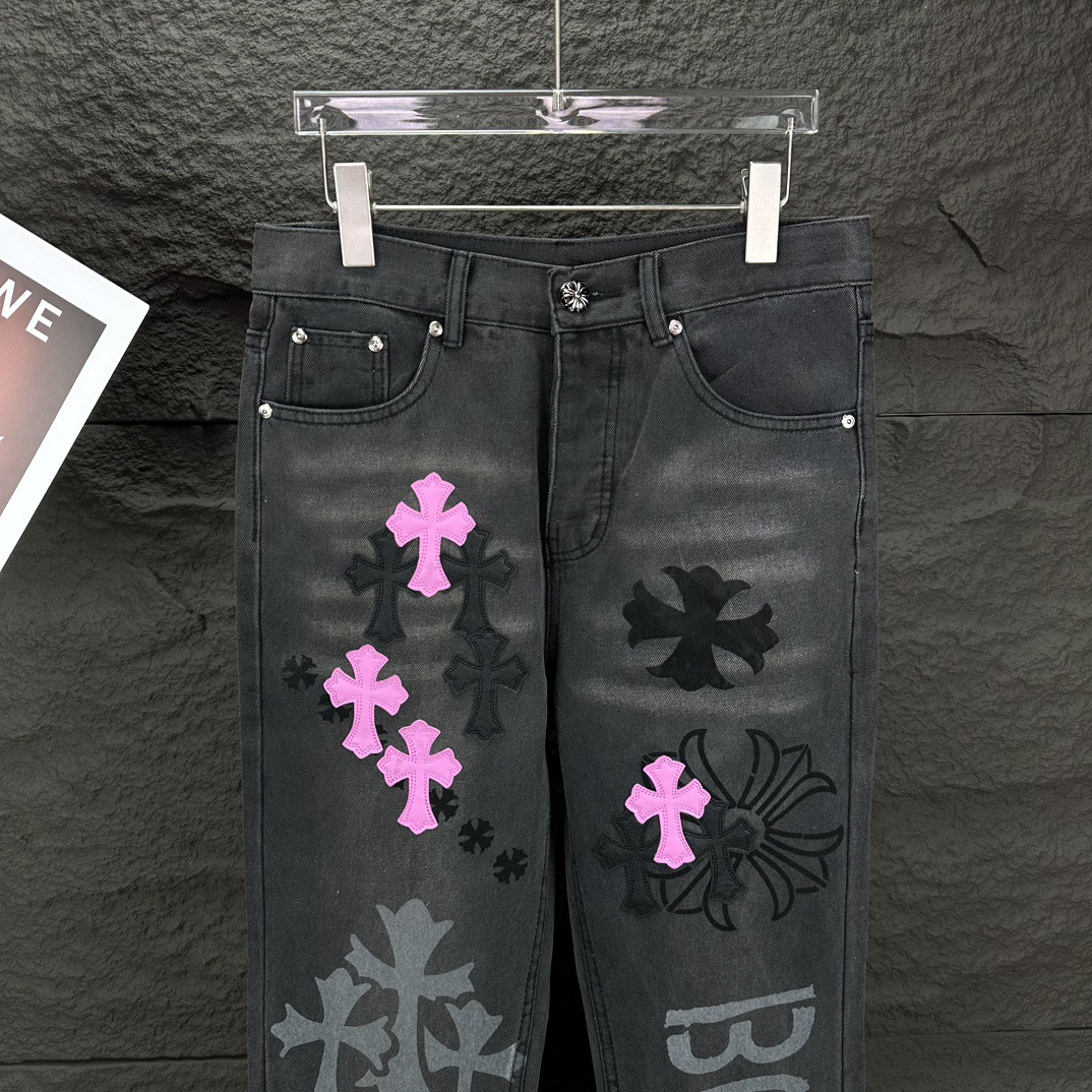 CH克罗伈2025 新款重工粉色十字架贴皮 情侣款水洗牛仔裤潮牌长裤