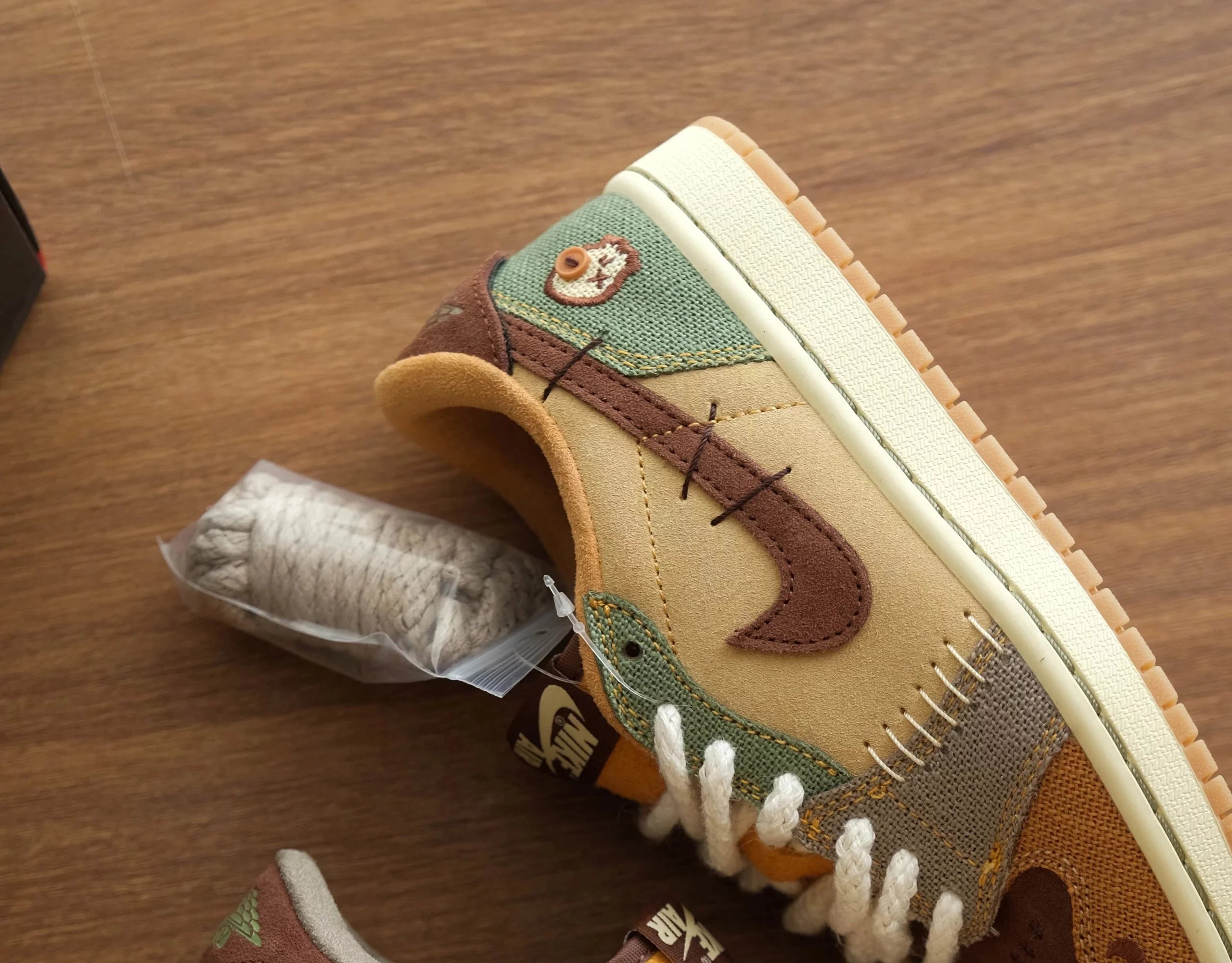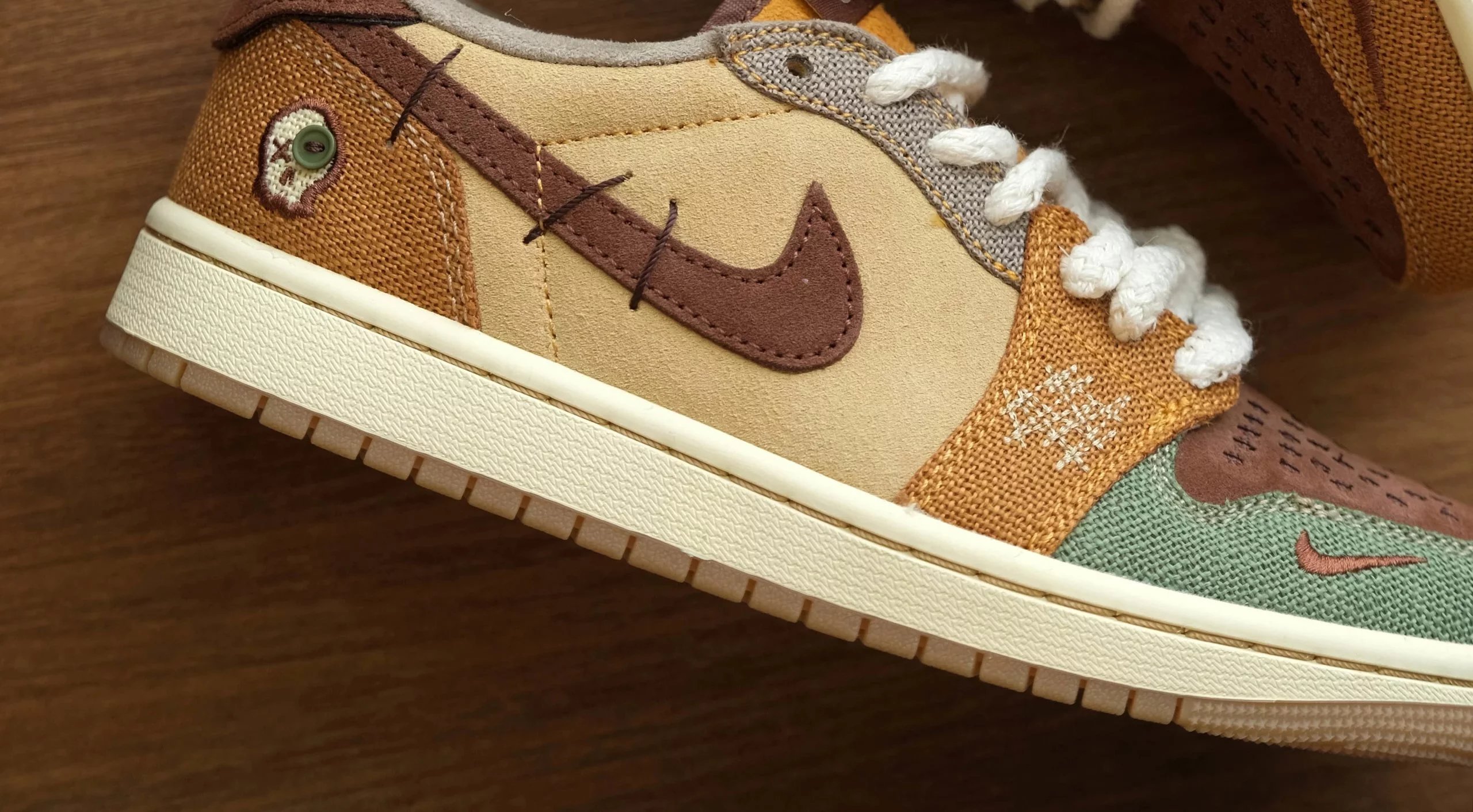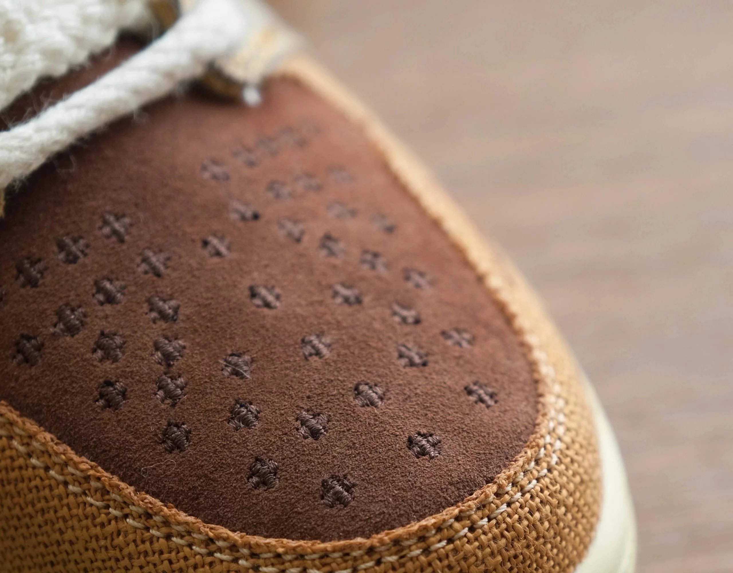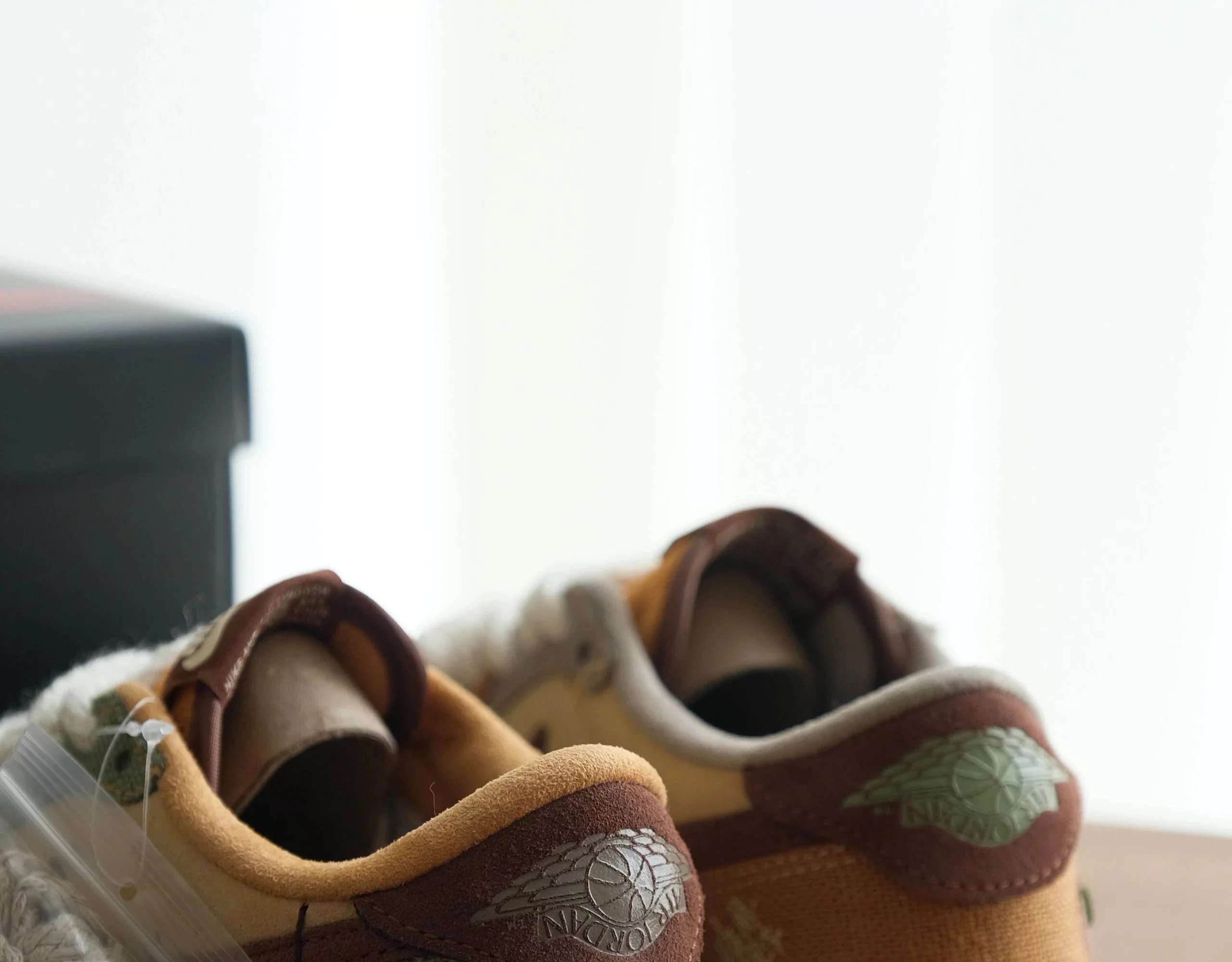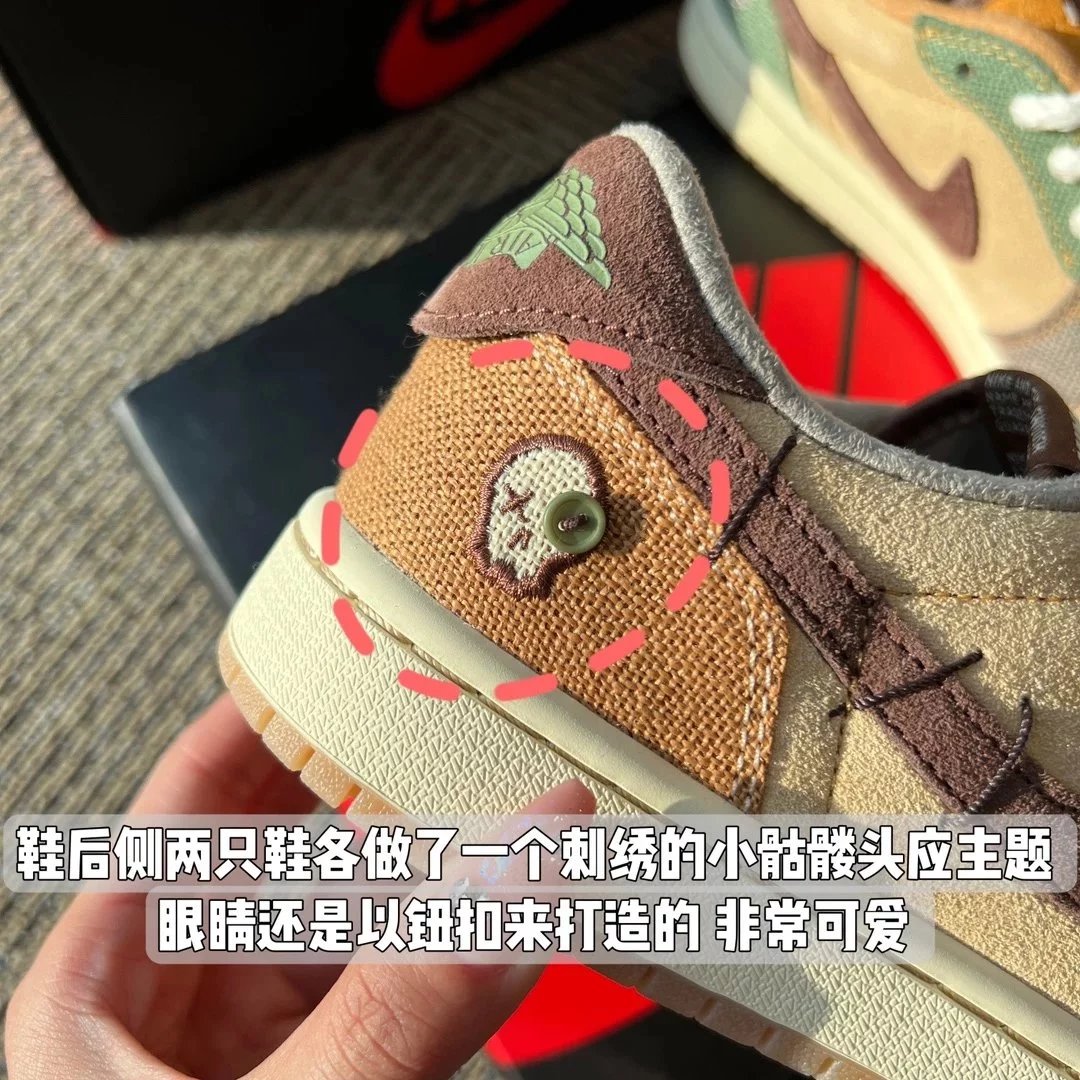 倒勾棕色鸳鸯,整双鞋面采用鹰皮,左右鸳鸯设计,搭配粗布材质打造,多种颜色拼接出层次感,呈现出酷似手工制作巫毒娃娃的视觉效果,后跟外侧还有骼髅头造型贴片以及纽扣眼点缀,进一步彰显巫毒娃娃主题,鞋头是以十字缝线布局,最后就是超多的细节设计,拼接的缝线、后跟处的鬼脸、后跟以及鞋舌处的LOGO均是反向,最后以米白中底搭配棕色外底完善设计