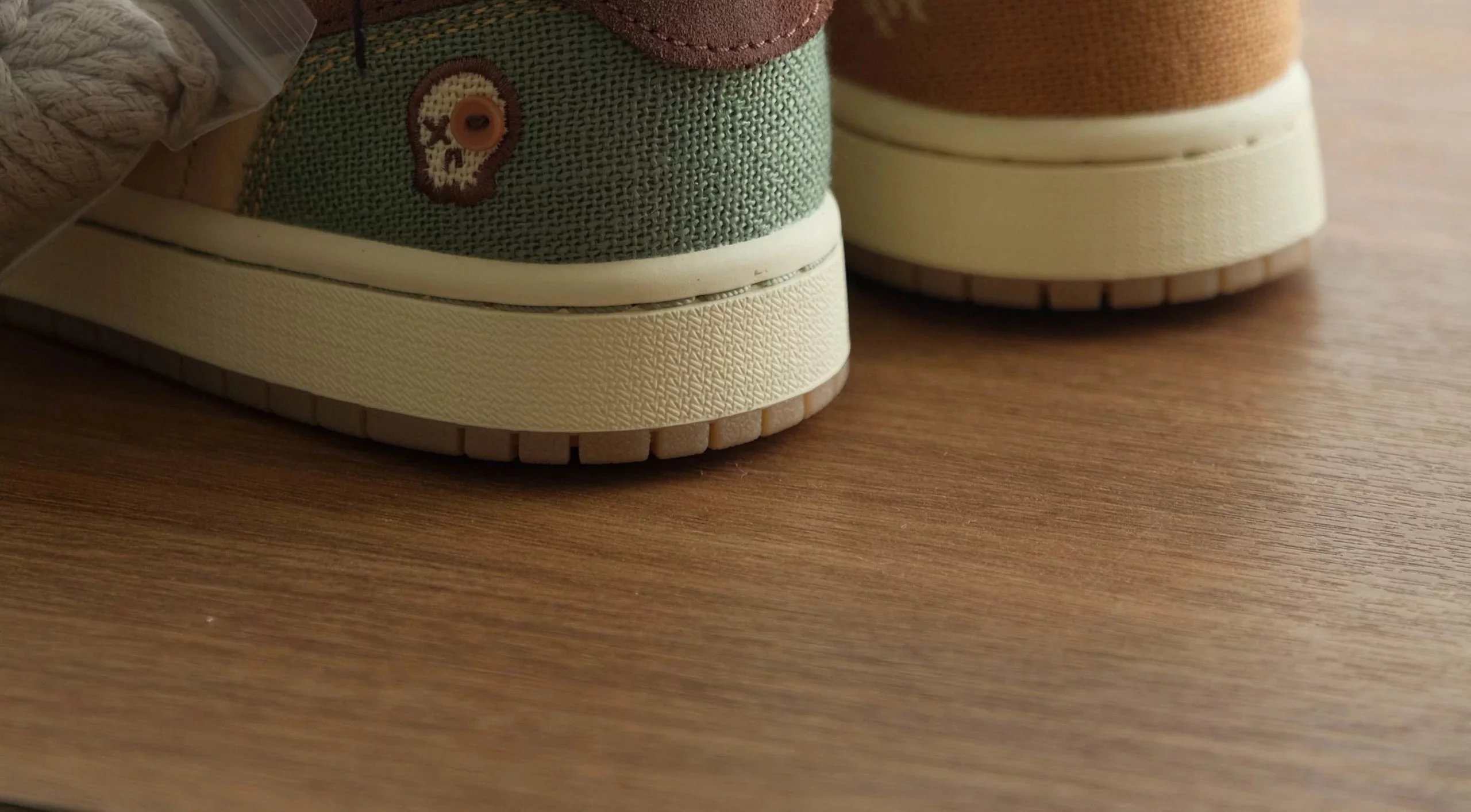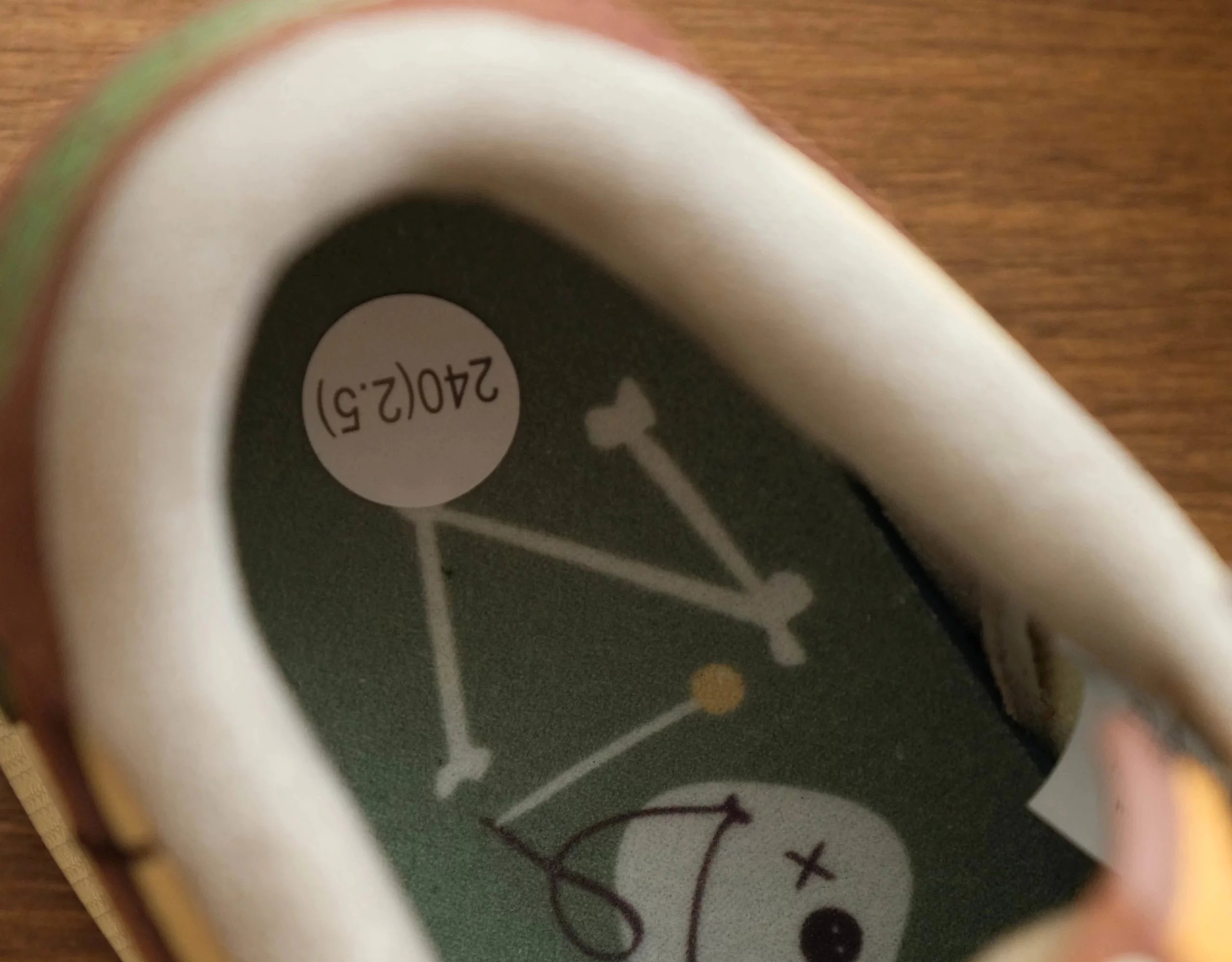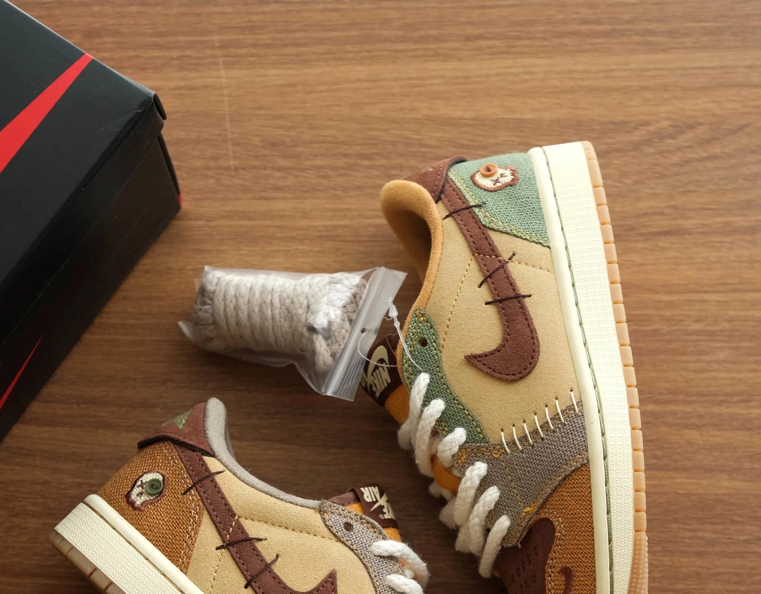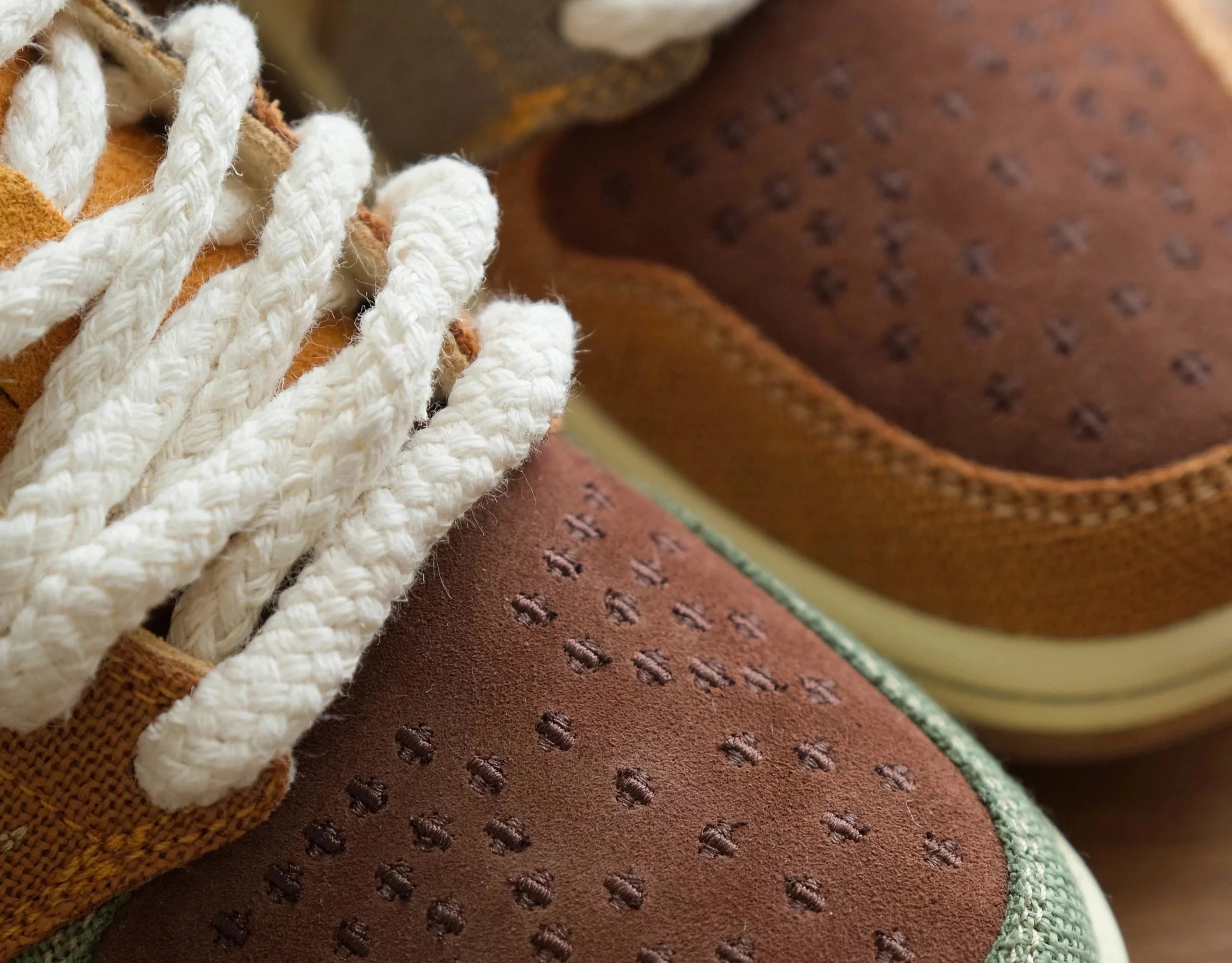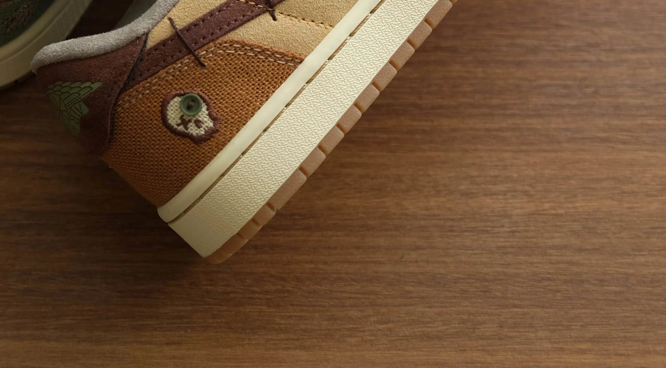 倒勾棕色鸳鸯,整双鞋面采用鹰皮,左右鸳鸯设计,搭配粗布材质打造,多种颜色拼接出层次感,呈现出酷似手工制作巫毒娃娃的视觉效果,后跟外侧还有骼髅头造型贴片以及纽扣眼点缀,进一步彰显巫毒娃娃主题,鞋头是以十字缝线布局,最后就是超多的细节设计,拼接的缝线、后跟处的鬼脸、后跟以及鞋舌处的LOGO均是反向,最后以米白中底搭配棕色外底完善设计