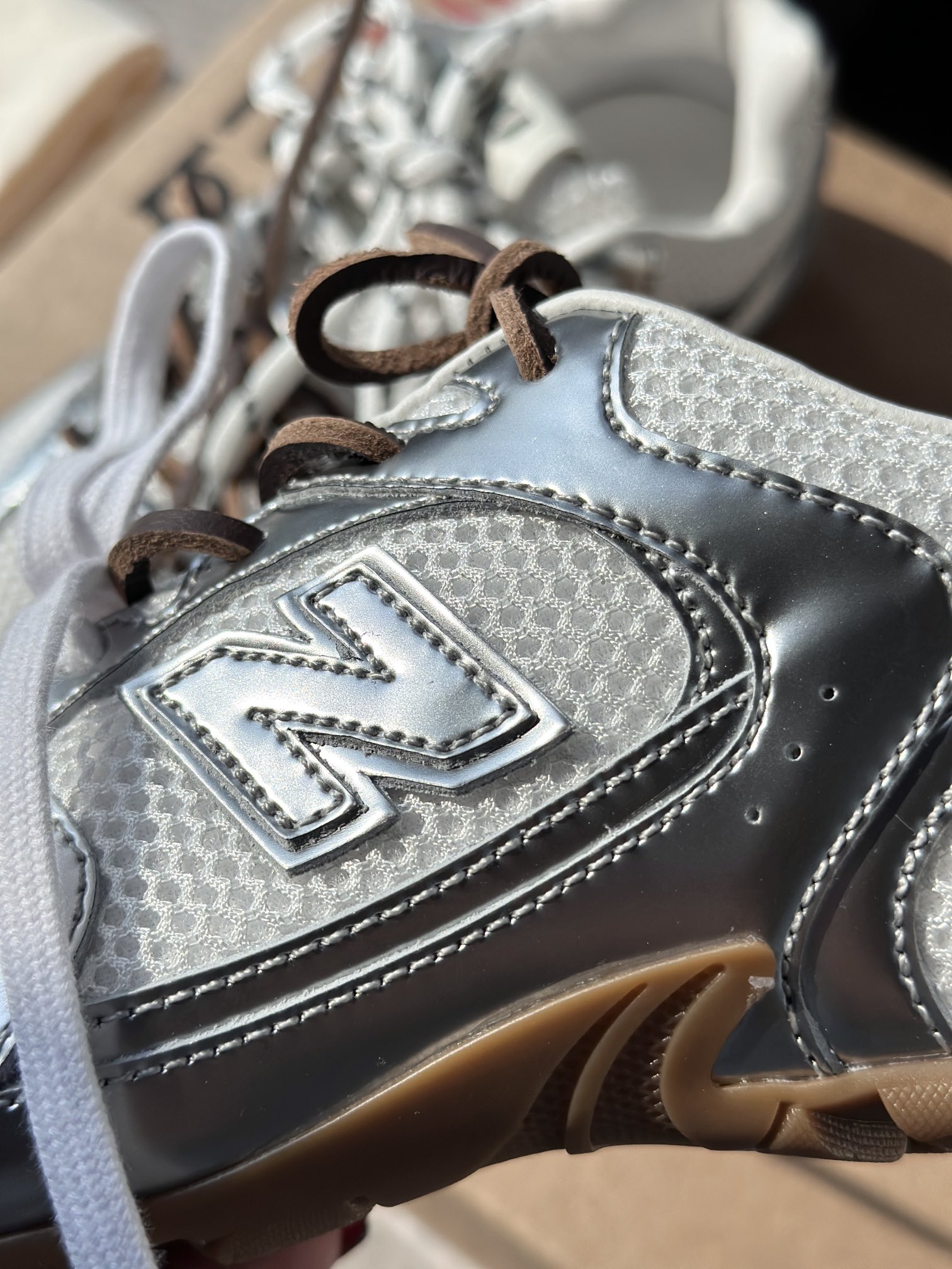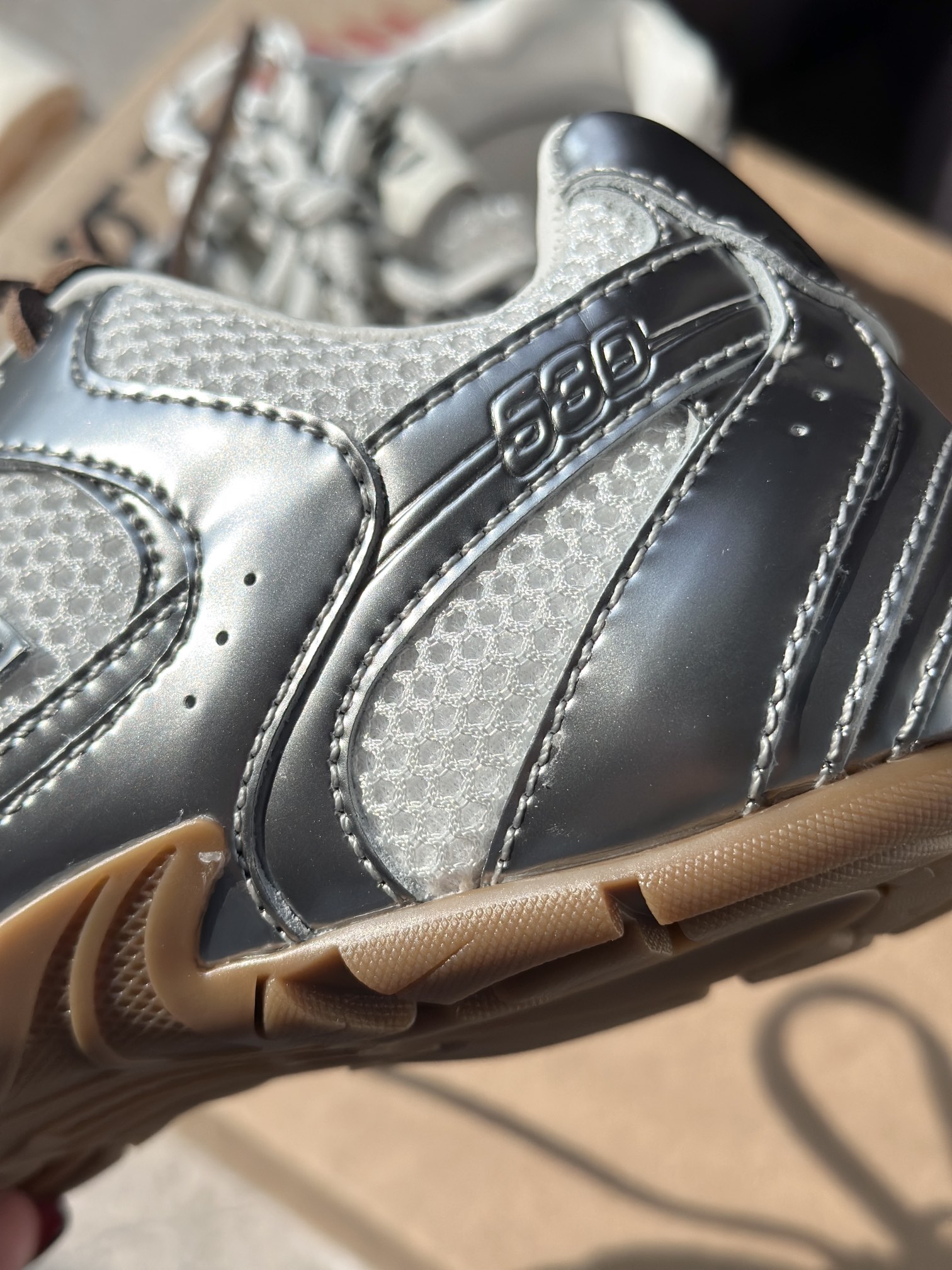 丝光镜面牛皮拼接原厂透气网 丝光镜面牛皮打造高光质感 自带高级冷调质感 网面透气性也很好!!上脚不闷汗不臭脚
