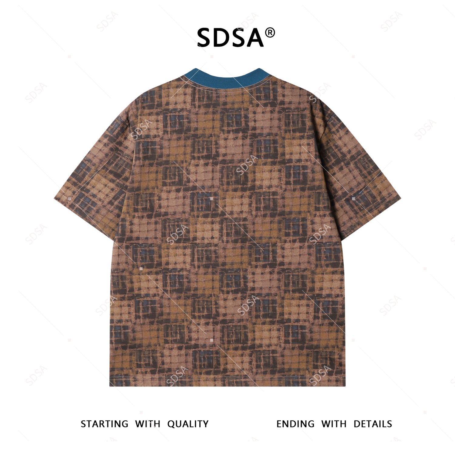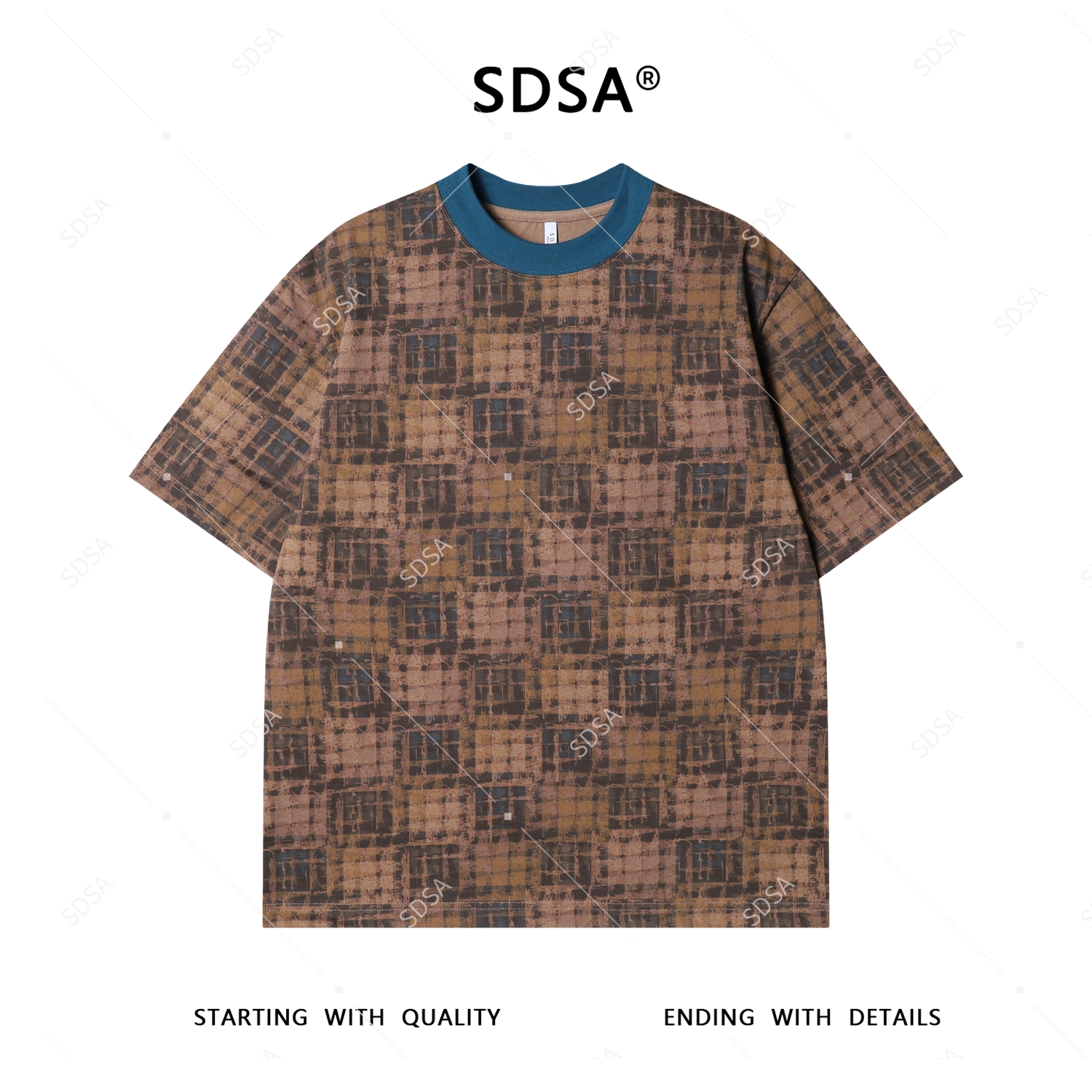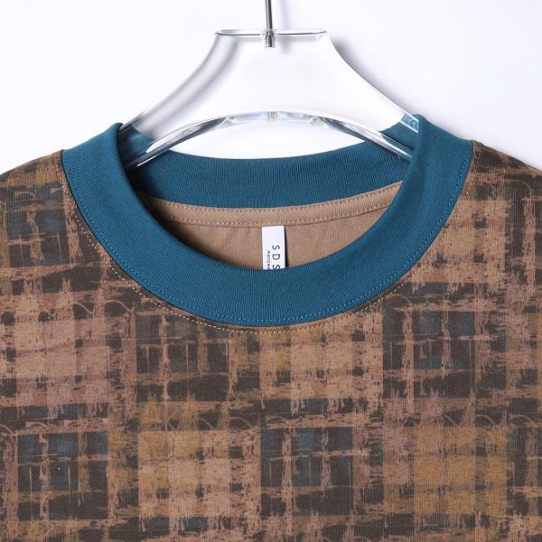 T3774夏季高级感新款男士美式多彩拼接T恤时尚格子短袖T恤圆领百搭上衣