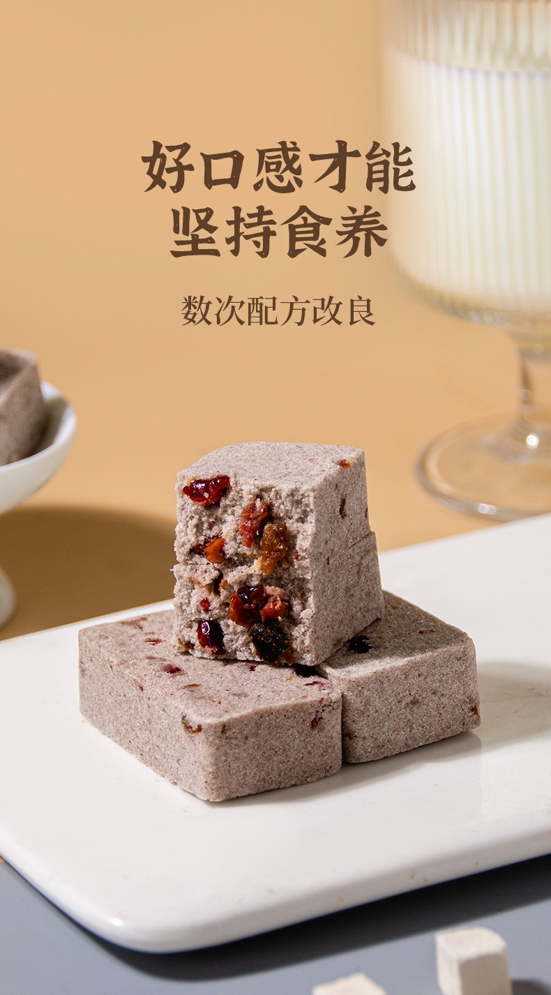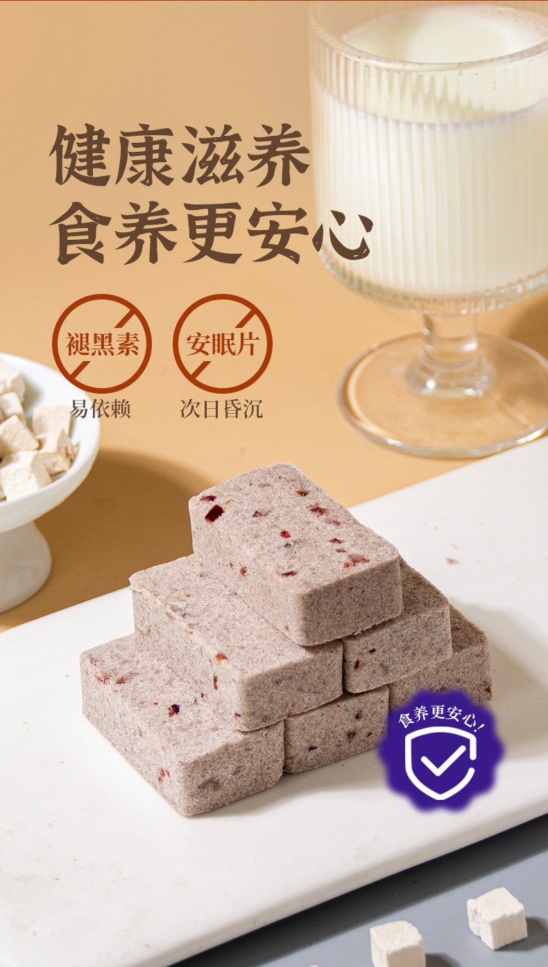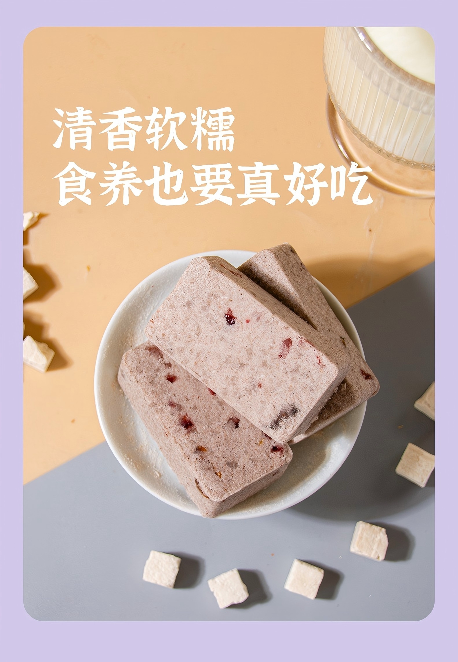 配料表:糯米粉、大米粉、麦芽糖醇液、海藻糖、黑米粉、红米粉、酸枣仁粉、龙眼丁(桂圆丁)、蔓越莓干、百合粉、茯苓粉、玉竹粉、山梨糖醇液、食用植物油、食用盐