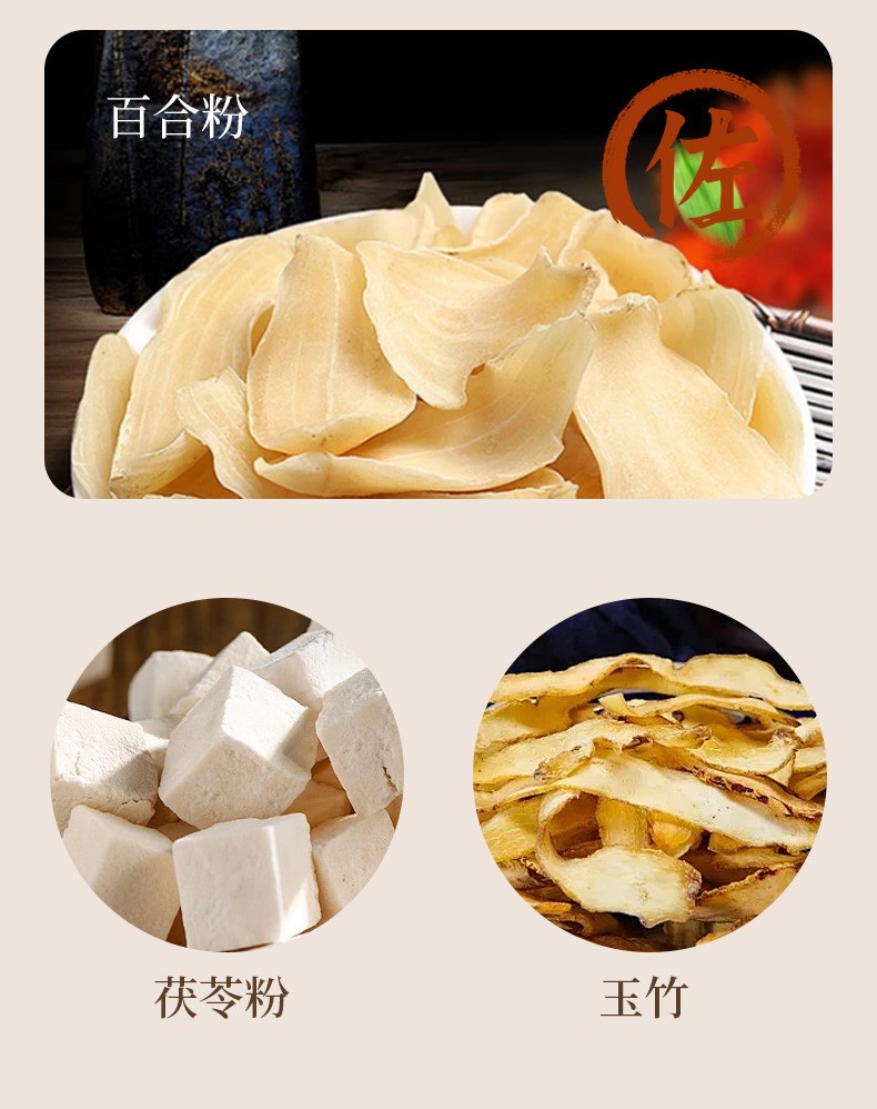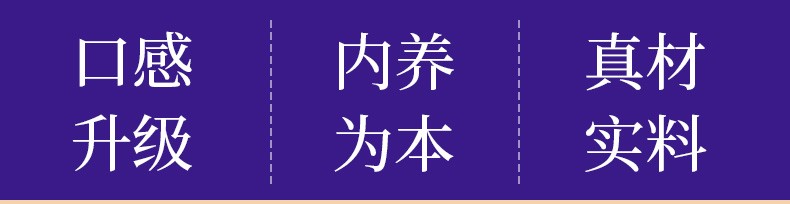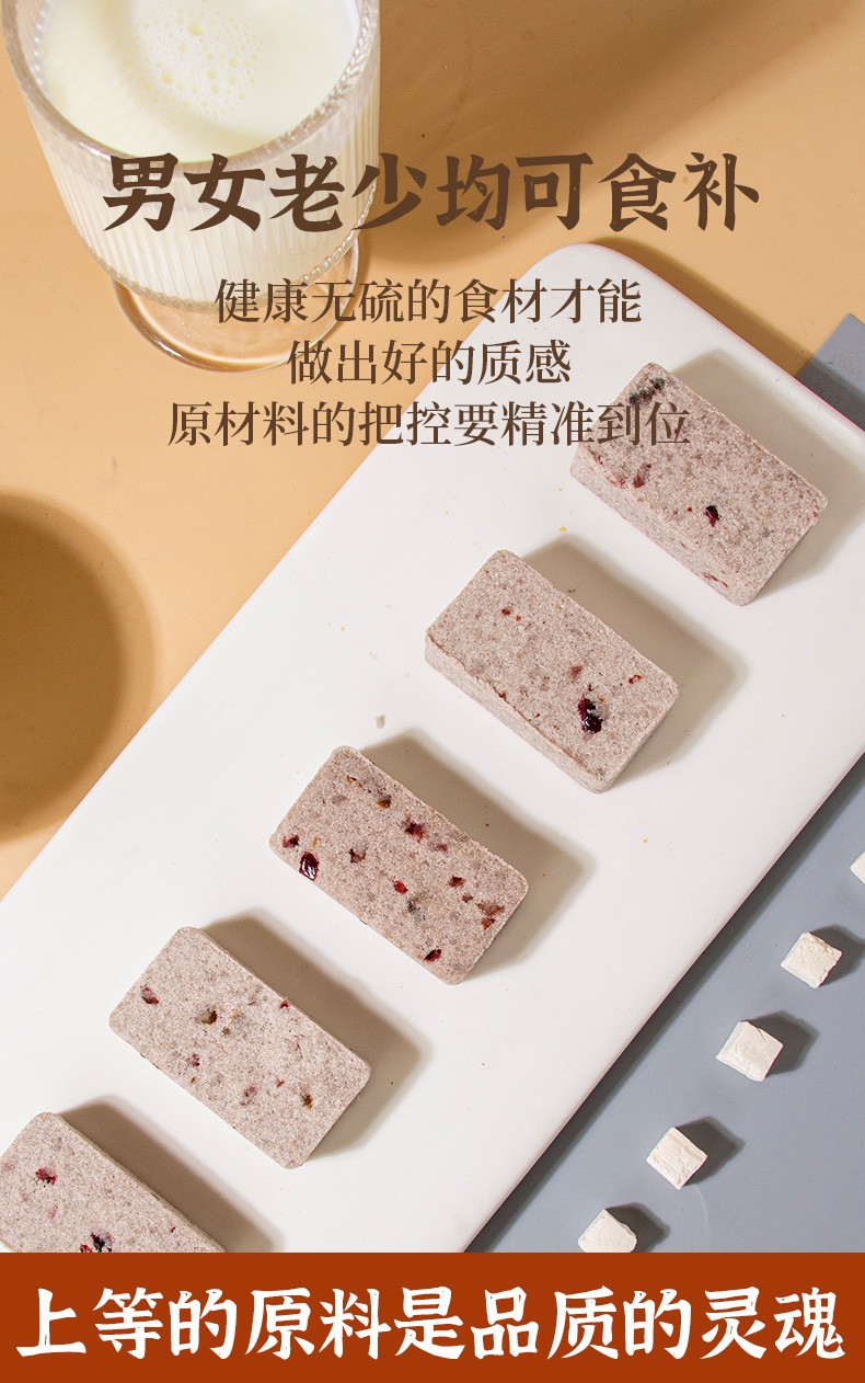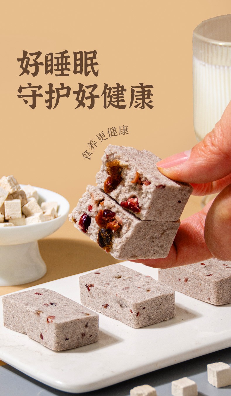 配料表:糯米粉、大米粉、麦芽糖醇液、海藻糖、黑米粉、红米粉、酸枣仁粉、龙眼丁(桂圆丁)、蔓越莓干、百合粉、茯苓粉、玉竹粉、山梨糖醇液、食用植物油、食用盐