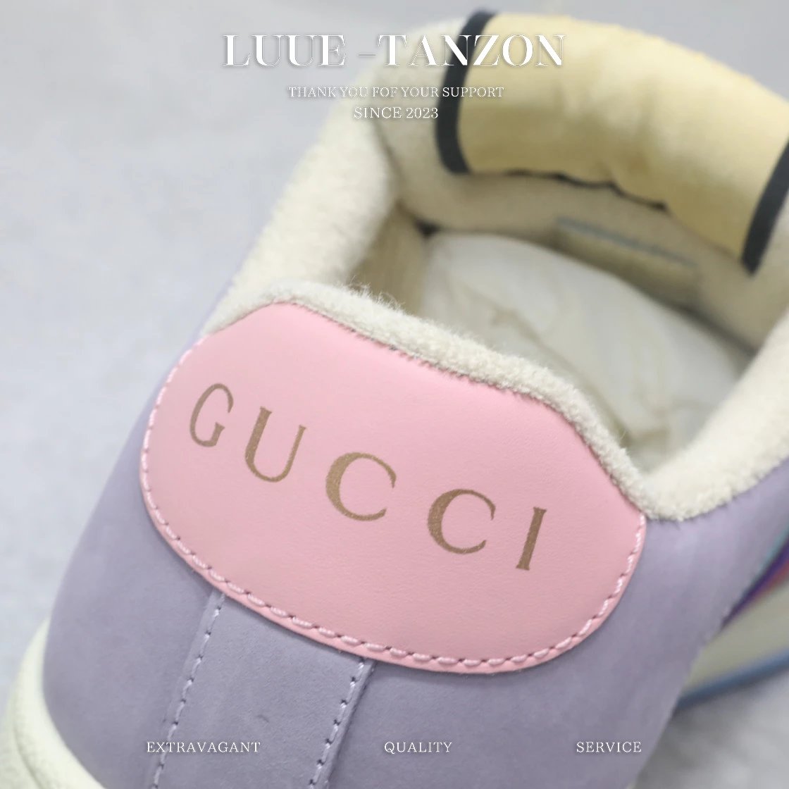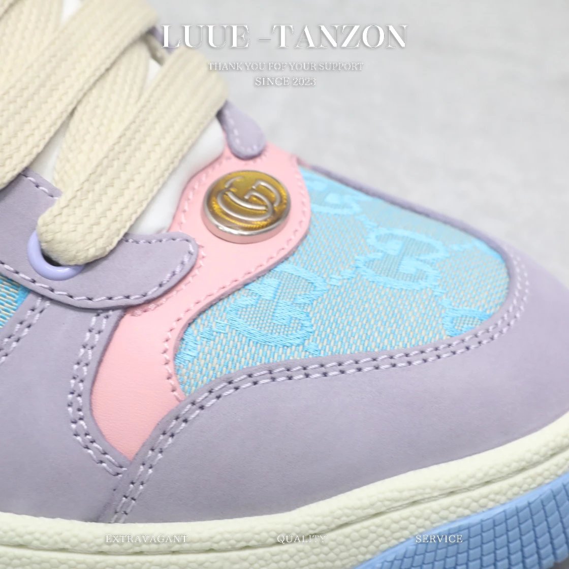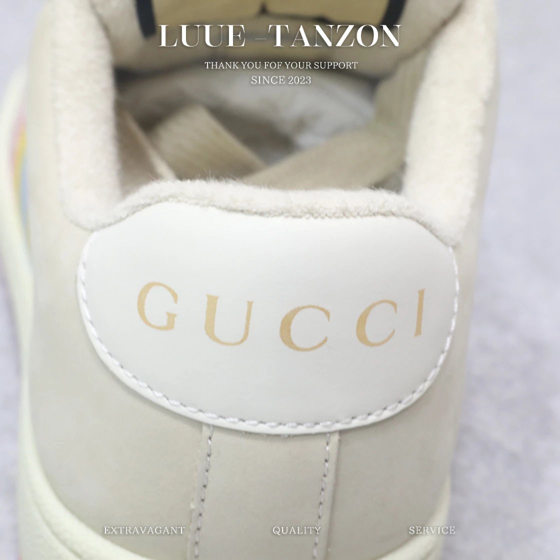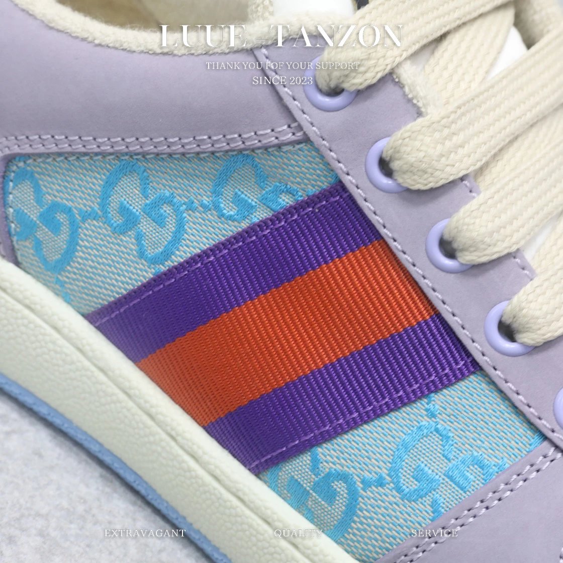 皮料和大底一次性做旧成型,而非市场货后期做旧,看上去非常廉价的颜色。內里是按照正品一致定制的棉纱混纺毛巾內里,厚度、透气性、手感都和正品一致。正品开模牛皮垫脚,冲压成型,而不是市场普通版本的手工开料。按原版开模的金属双G椭圆形珐琅五金,最新的大底相比之前的版本细节有所调整,我们同样做了升级,独家私模和正品一致的TPR大底无论是软硬度、纹路的线条和清晰度以及穿着舒适度上,都完美还原原版工艺。市场通货的橡胶底不但颜色、纹路、鞋底蜜蜂图案不对,而且完全没有质感。鞋底厚度约为2.5cm。一致全套包装