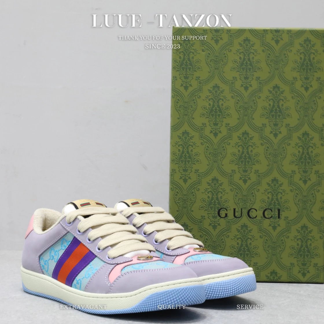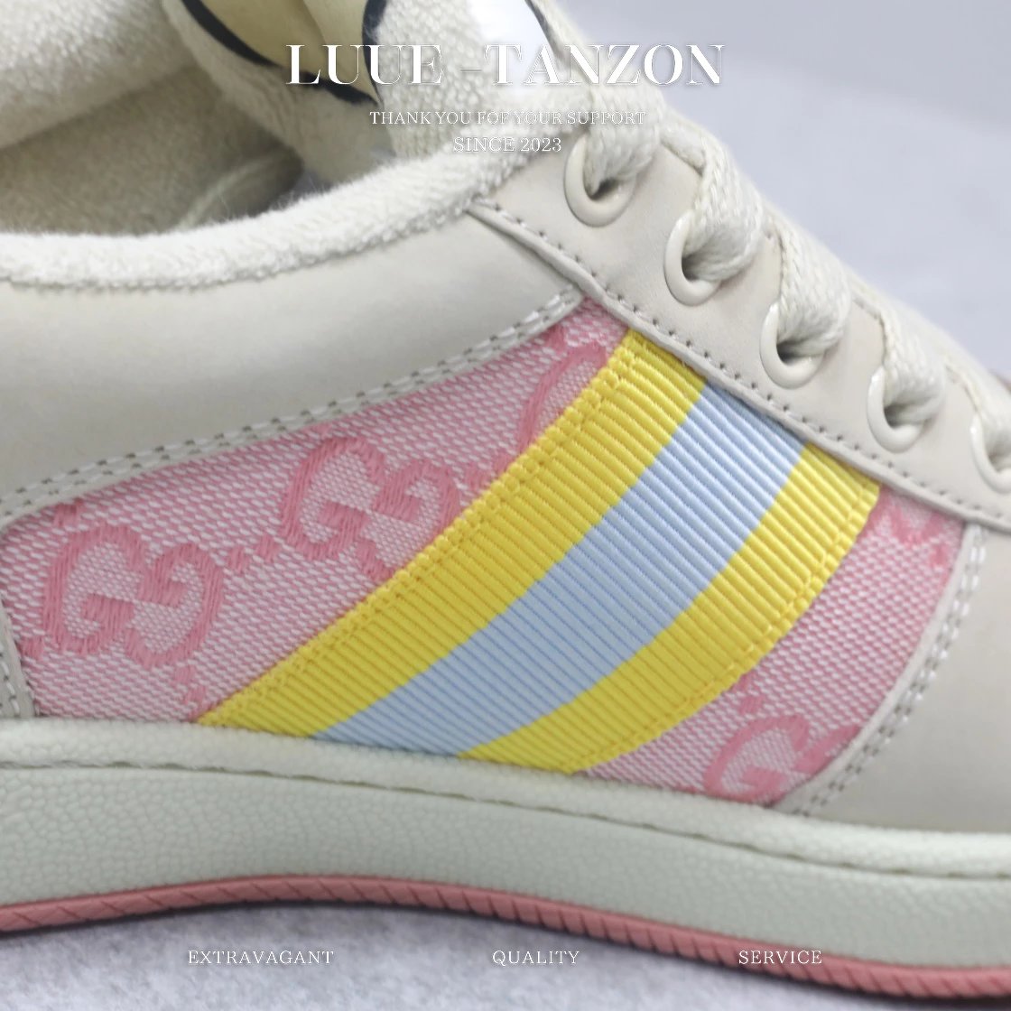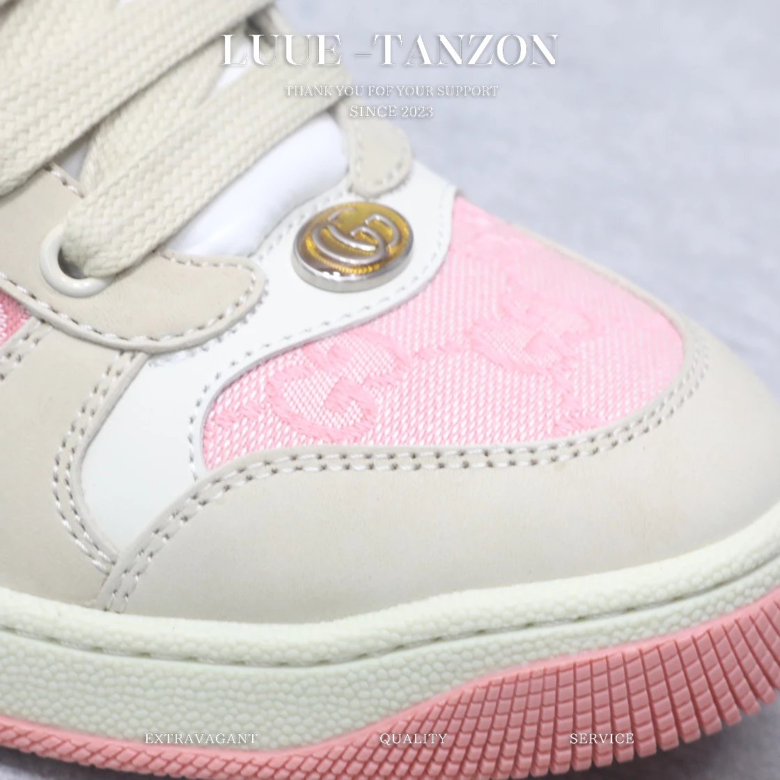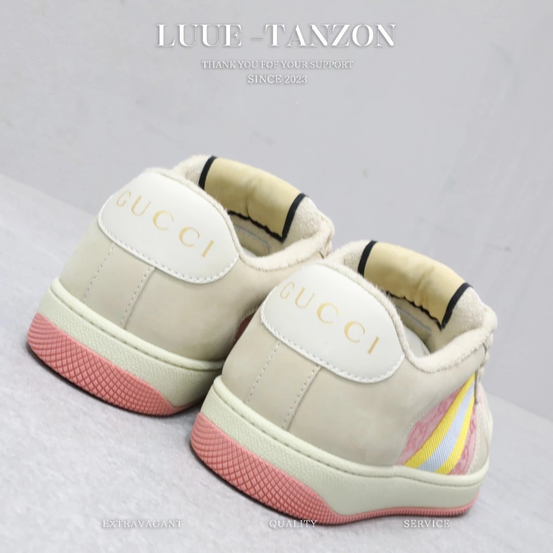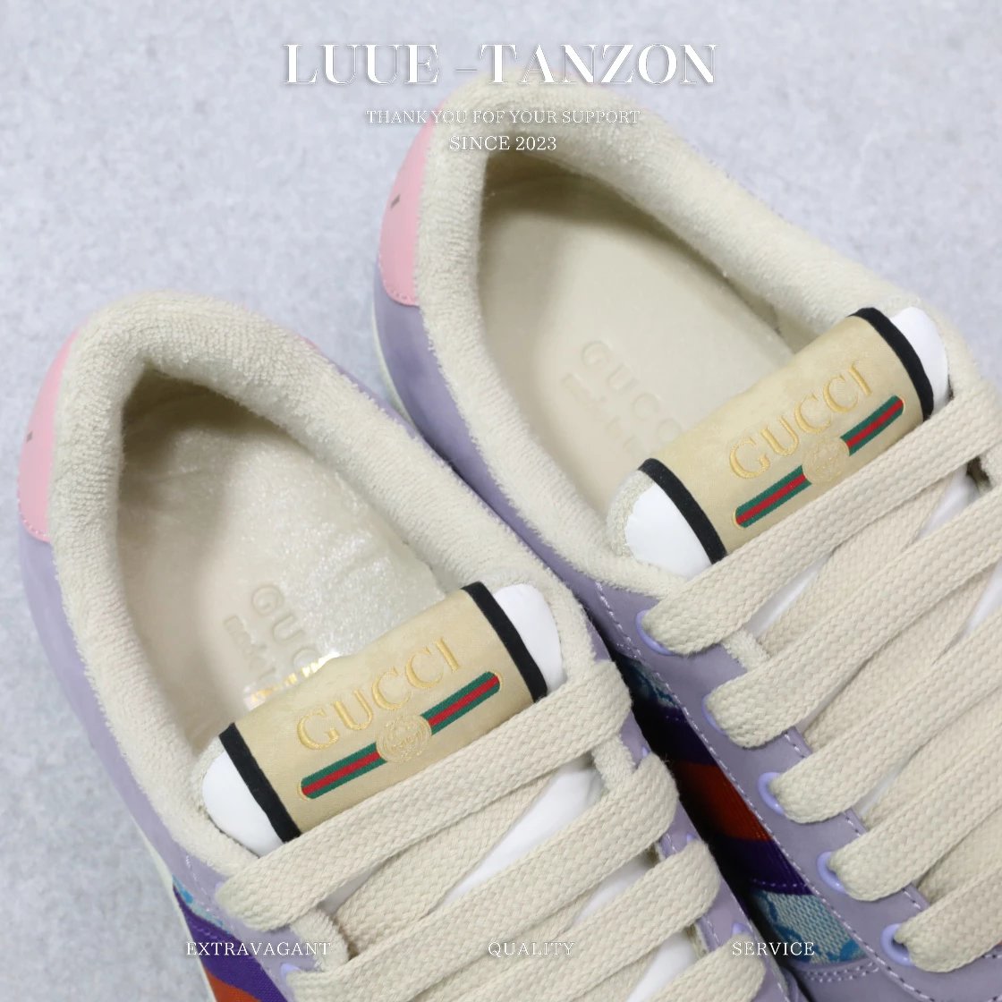 皮料和大底一次性做旧成型,而非市场货后期做旧,看上去非常廉价的颜色。內里是按照正品一致定制的棉纱混纺毛巾內里,厚度、透气性、手感都和正品一致。正品开模牛皮垫脚,冲压成型,而不是市场普通版本的手工开料。按原版开模的金属双G椭圆形珐琅五金,最新的大底相比之前的版本细节有所调整,我们同样做了升级,独家私模和正品一致的TPR大底无论是软硬度、纹路的线条和清晰度以及穿着舒适度上,都完美还原原版工艺。市场通货的橡胶底不但颜色、纹路、鞋底蜜蜂图案不对,而且完全没有质感。鞋底厚度约为2.5cm。一致全套包装