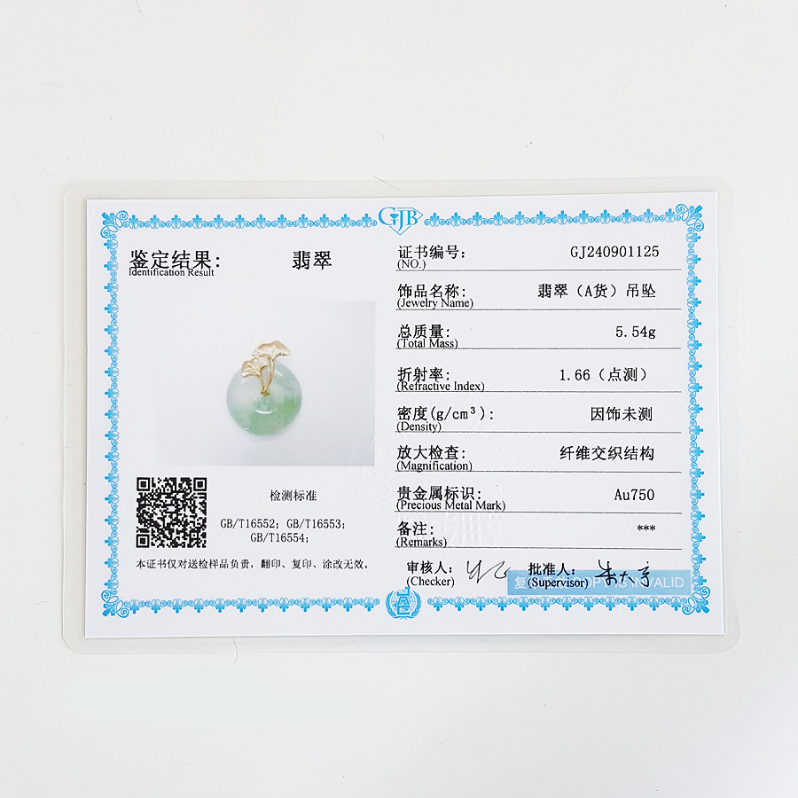 【天然正品】A货翡翠AU750精品黄金镶天然冰种飘花平安扣翡翠(吉祥、如意)吊坠项链中性现售价:7280!281024XY10