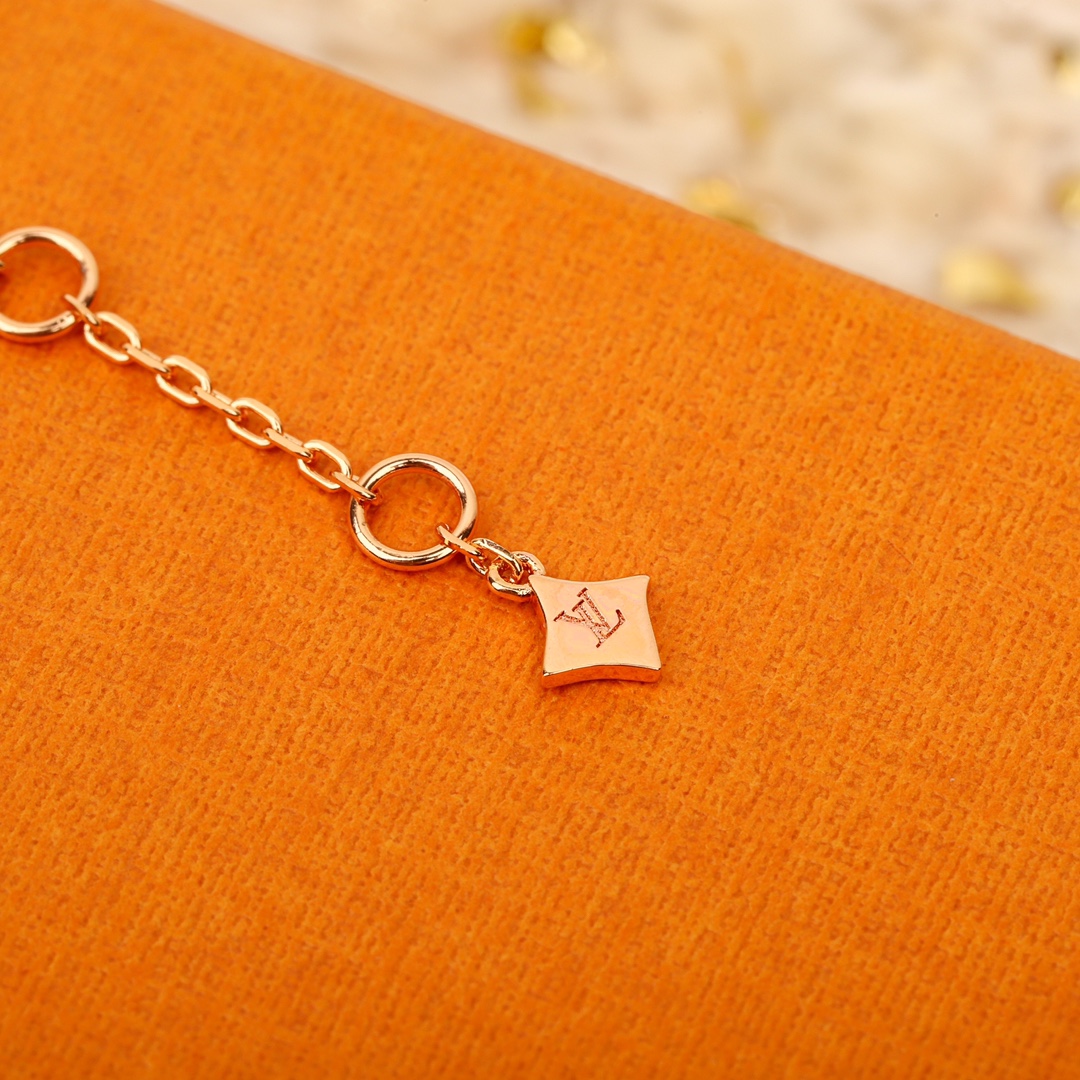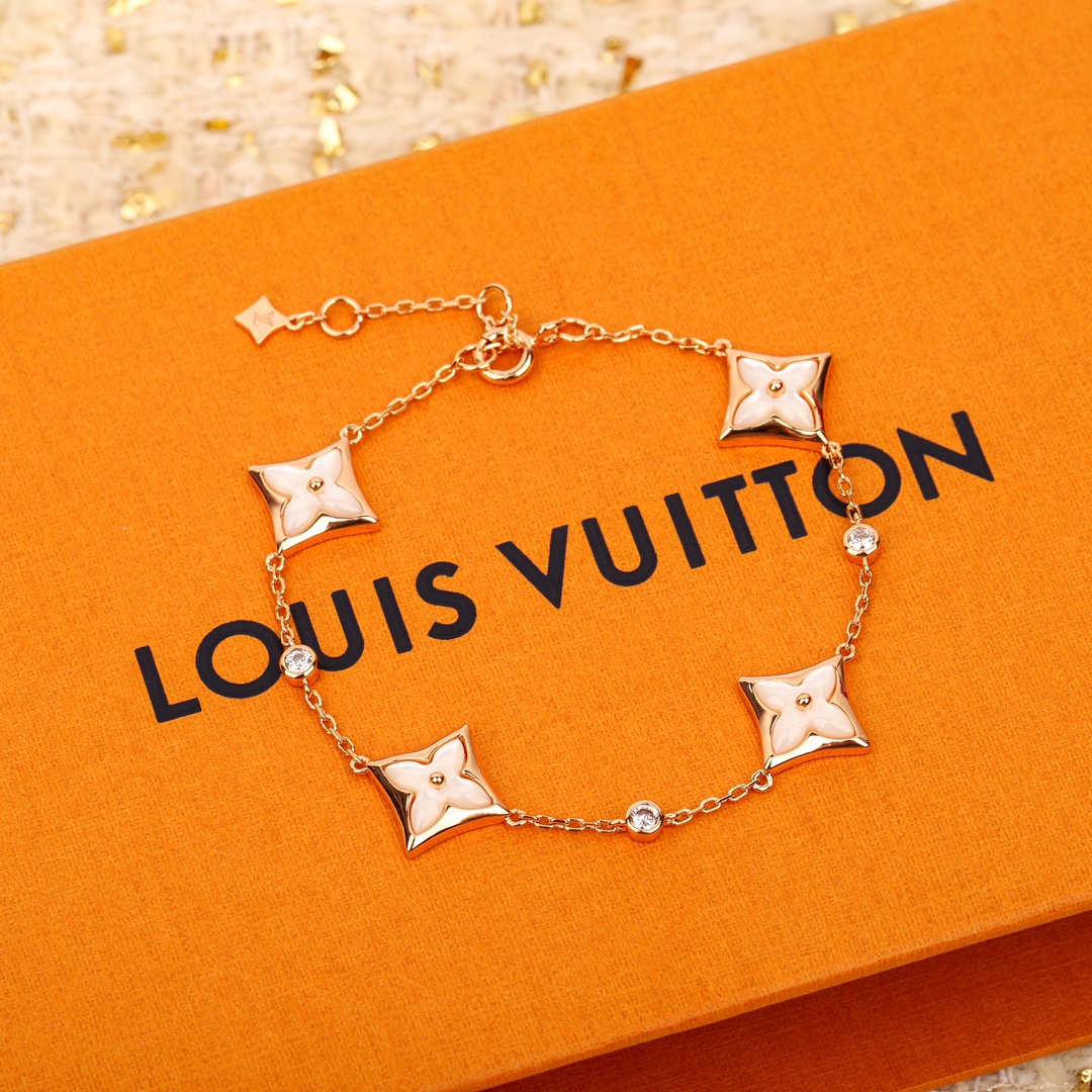 本款 Color Blossom BB 手链庆贺 Monogram 花卉的绽放,向这一于 1896 年诞生于路易威登创始人之子 Georges Vuitton 手中的经典元素致敬。莹润贝壳经过雕琢嵌入 18K 金,璀璨钻石点缀可调节链条,无论单独佩戴或与同系列其他单品搭配,均可展露温婉风姿通体采用925银,厚金电镀,保色程度更久。