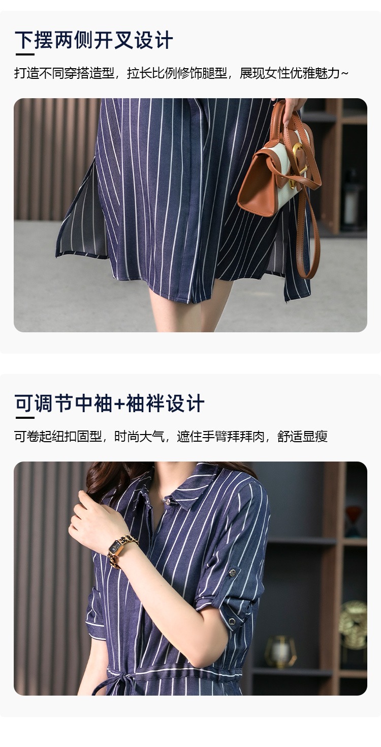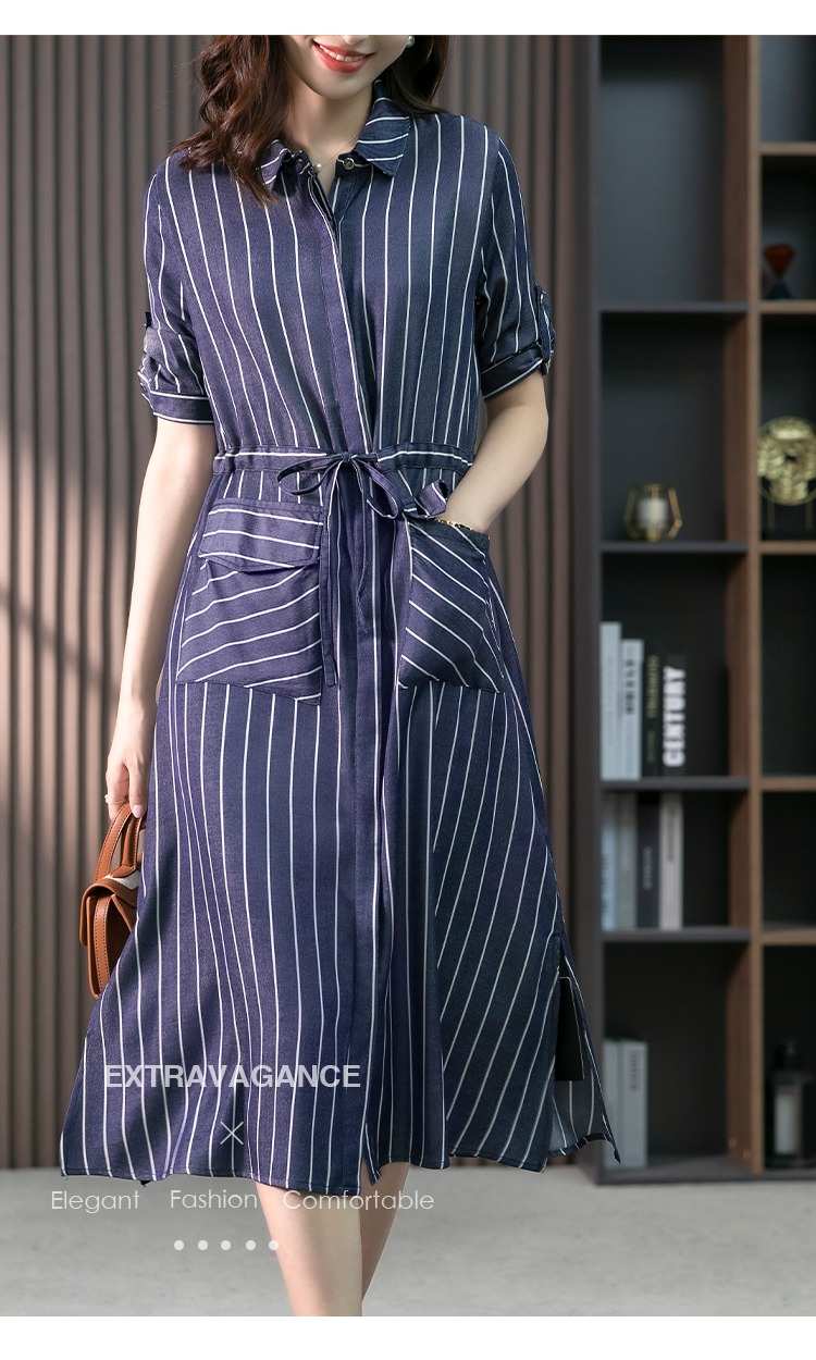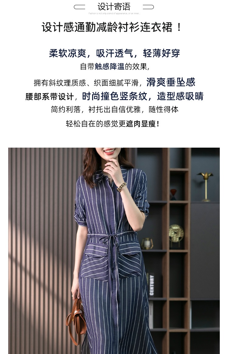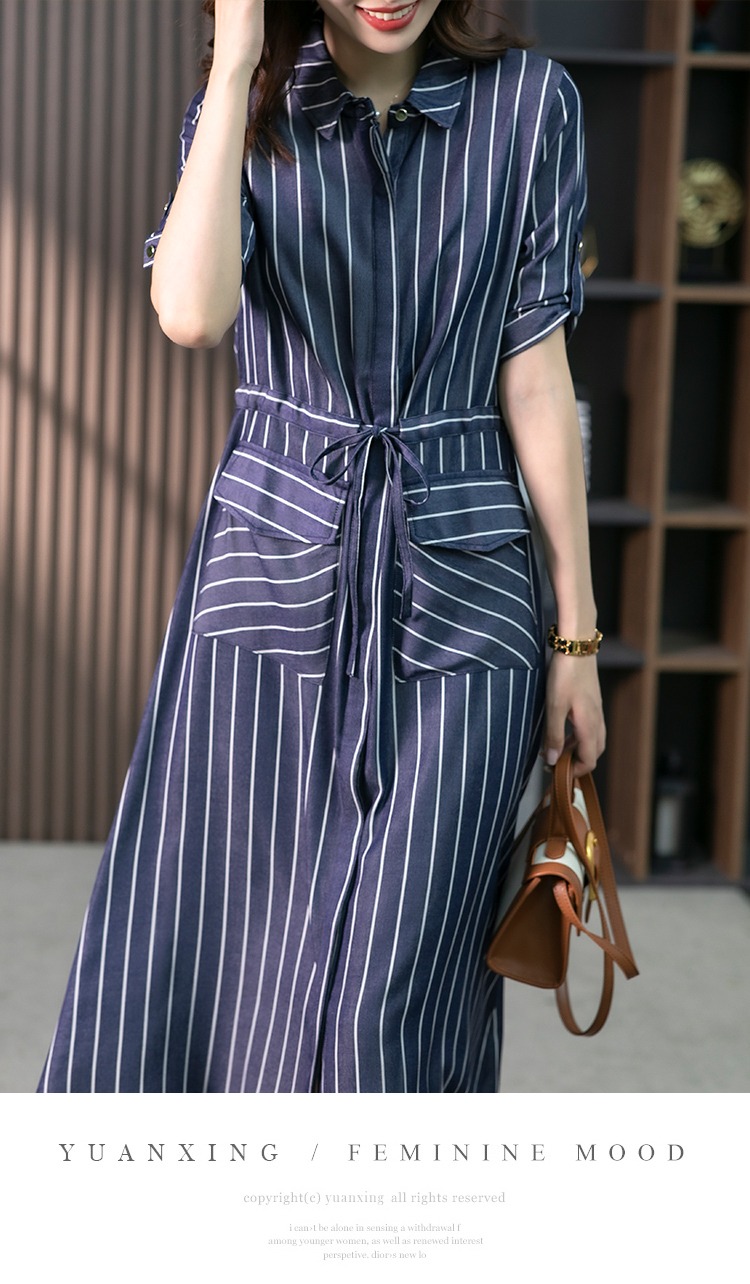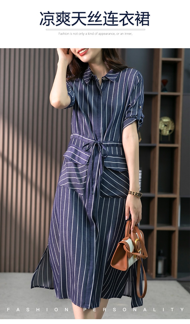 YX【现货7天】竖条纹天丝连衣裙女中长款2024夏季新款韩版通勤减龄衬衫裙子