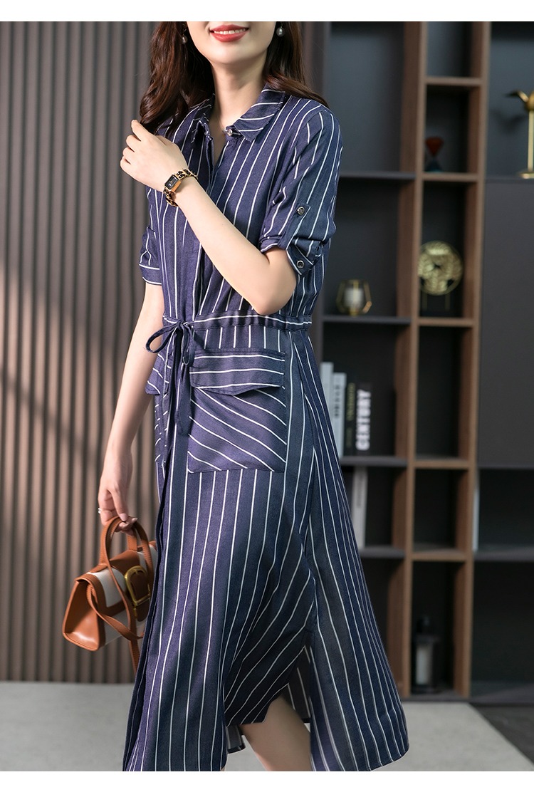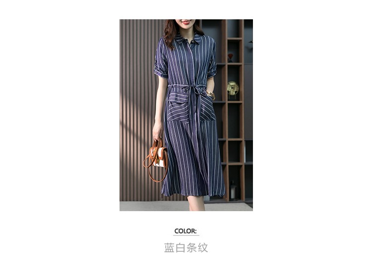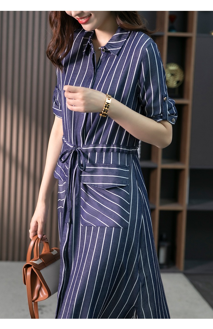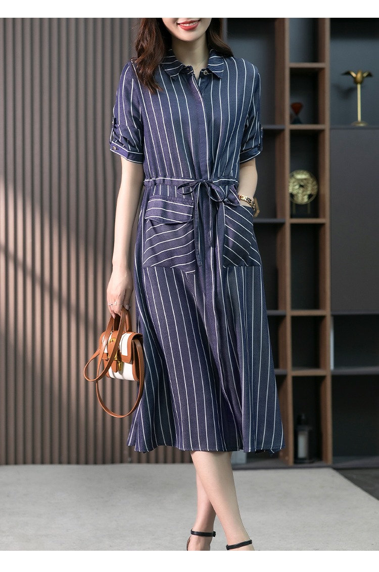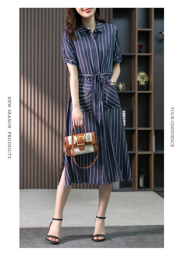 YX【现货7天】竖条纹天丝连衣裙女中长款2024夏季新款韩版通勤减龄衬衫裙子