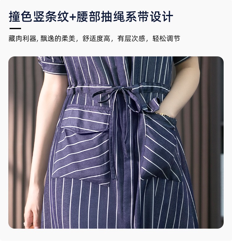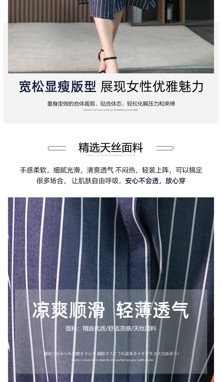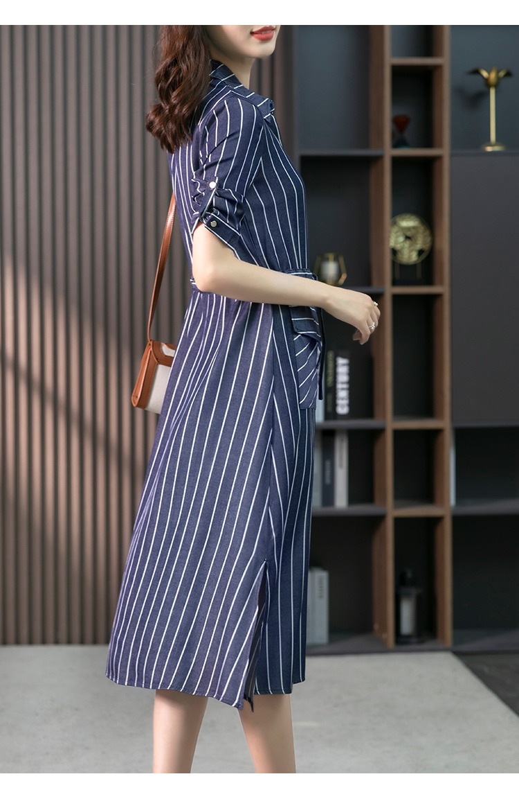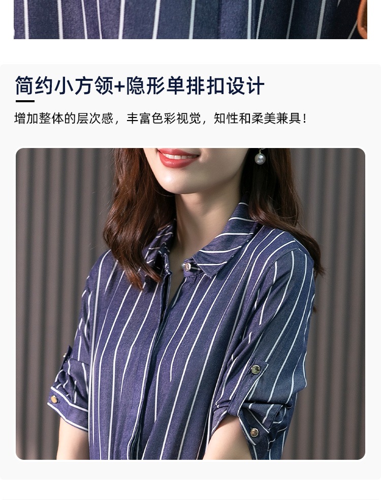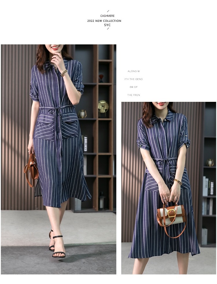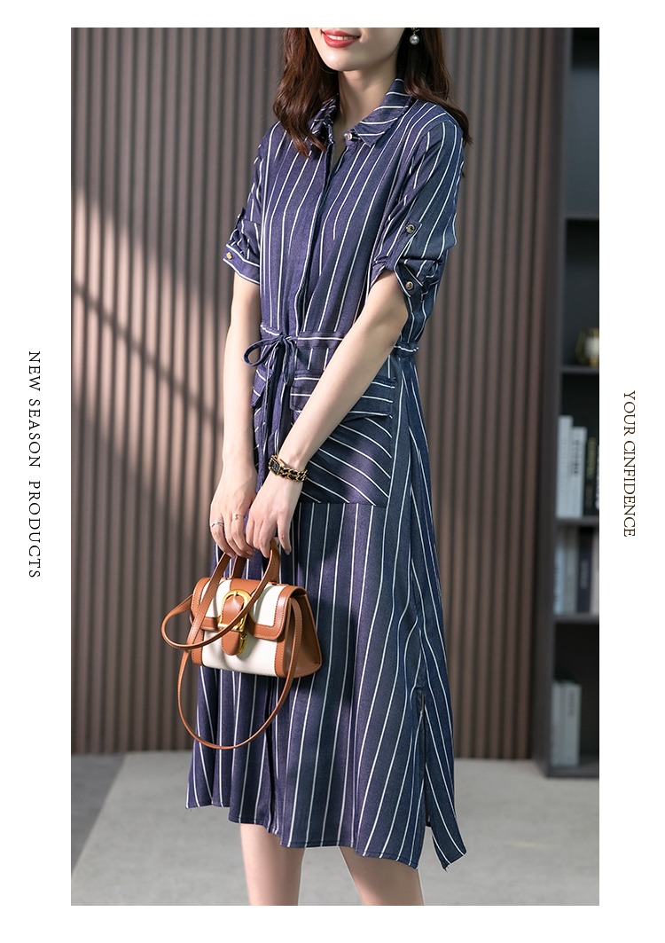 YX【现货7天】竖条纹天丝连衣裙女中长款2024夏季新款韩版通勤减龄衬衫裙子