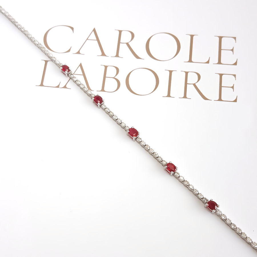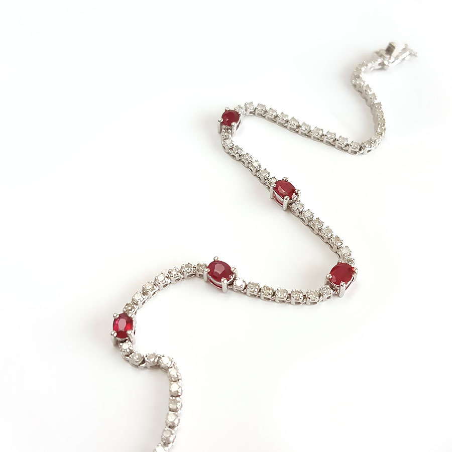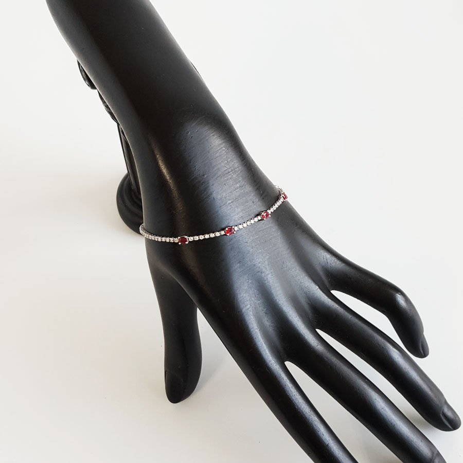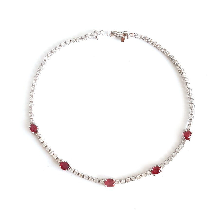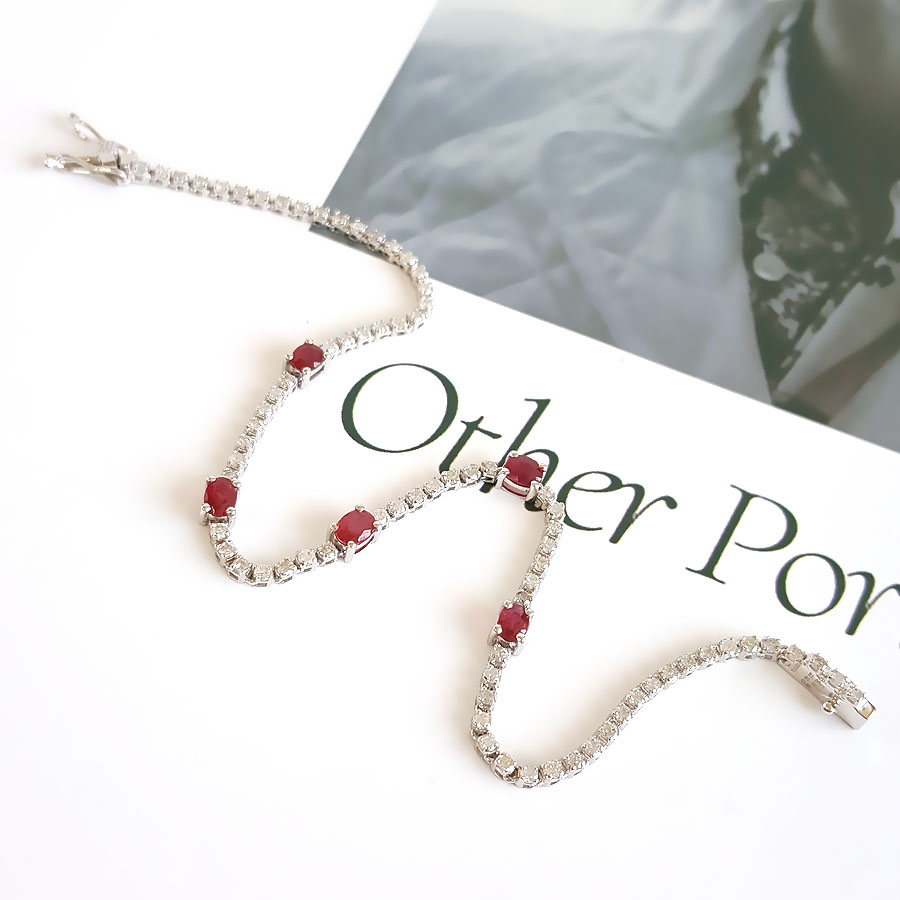 名称 | AU750精品白金镶钻镶5颗约1.0克拉鸽血红红宝石排镶手链 |