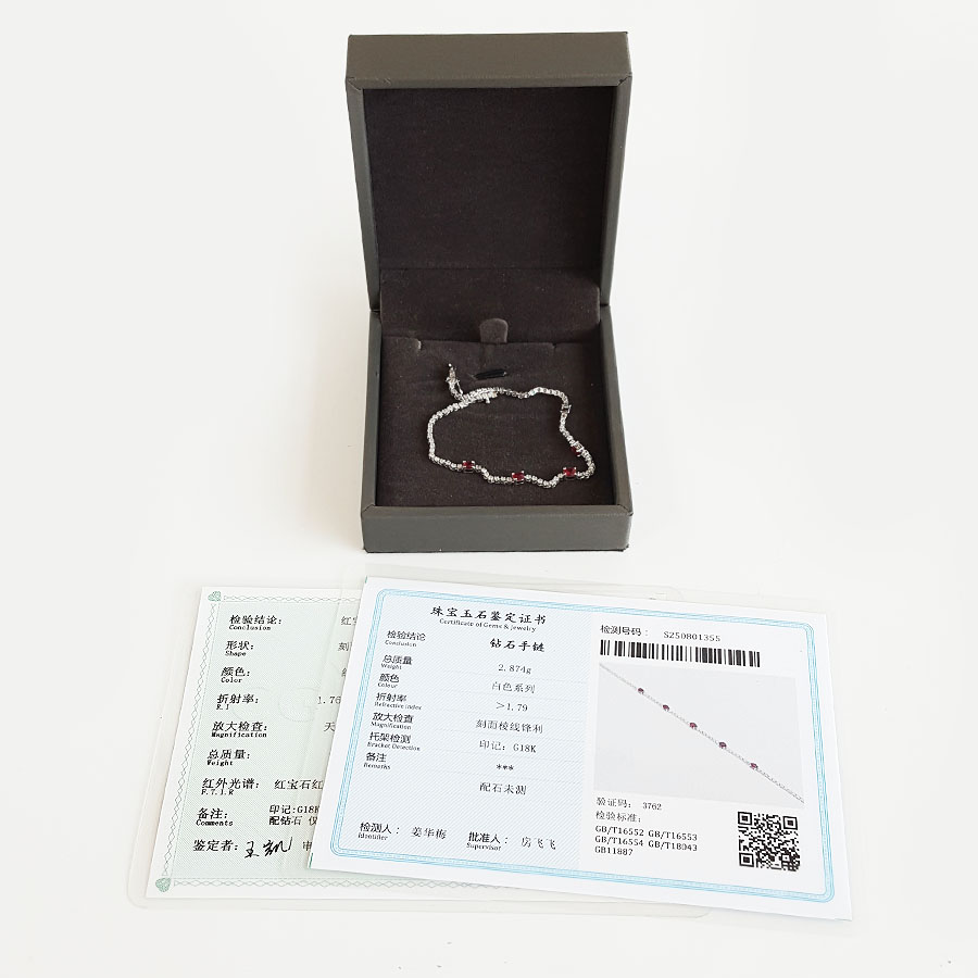 【天然正品】AU750精品白金镶钻镶5颗约1.0克拉鸽血红红宝石排镶手链16CM女士240825NJS10现售价:4580