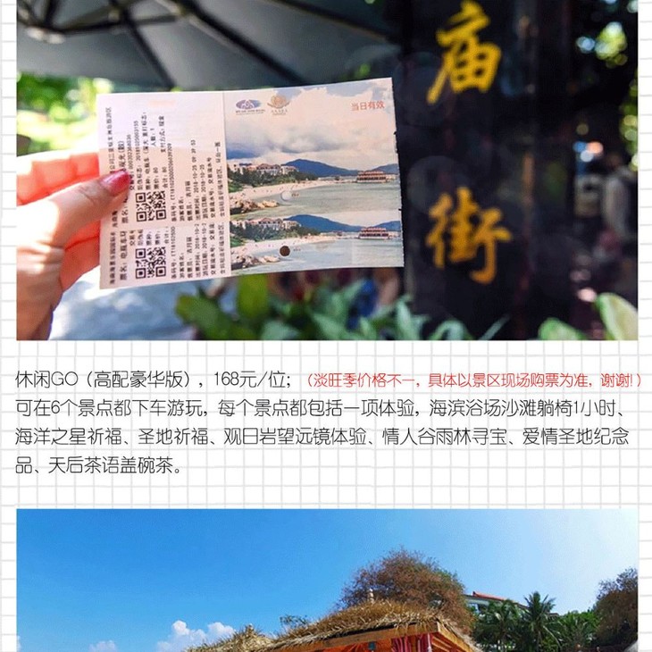 | 交通 | 全程空调旅游巴士:保证一人一座,干净舒适 提供往返接送服务:具体乘车时间及接送地点以导游提前一天与您确认的为准 1,免费赠送免税店一日游,请在出游前一天16:00之前电话预约,必须提供返程航班号和身份证号,若未预约,视为自动放弃。2,旅拍只能在市内酒店或免费沙滩,海棠湾万丽等酒店无法赠送,请知悉,谢谢。 |