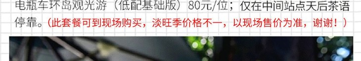 | 门票 | 行程中所列景点的首道大门门票费:因蜈支洲岛景区通知要求,自2019年11月1日起,所有一日游参团游客需提前一天提交正确的出行人身份信息报备团队门票,如出现误报,漏报或报错等情况,游客将不能购买团队门票及享受团队政策。 本行程包含内容:往返大巴车,门票,往返船票,导游服务。!!另:9月1日起,海岛玩家项目变更: 1、海岛玩家(24小时制)费用包含: 门船票、珊瑚酒店自助午餐、趣玩潜水、海底漫步、彩虹拖伞、小飞鱼、动感飞艇、摩托艇、半潜观光船、平台海钓、大飞鱼、香蕉船、豪华环岛游套票、滑板冲浪、鱼疗; 赠送项目:欢乐海滩、海棠游、沙滩躺椅1小时、游泳圈、冲淡及储物柜 2、产品24小时制,除门船票外,其他项目仅限体验一次; 谢谢大家! |