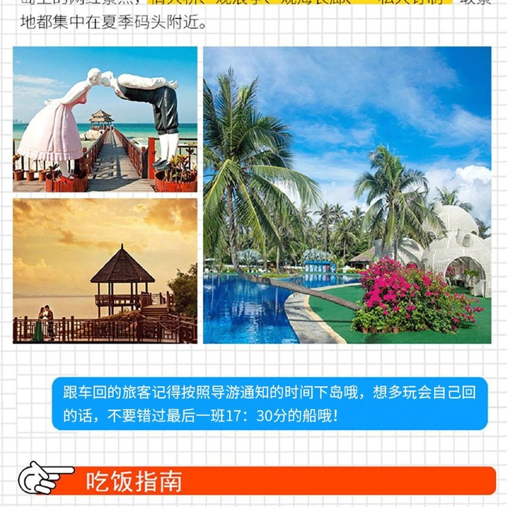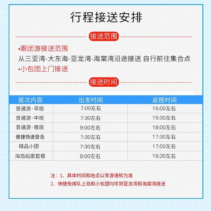 非海岛玩家套餐:三亚湾/市区/大东海/亚龙湾/海棠湾区域,由远及近逐一出发,沿路上门接客人,下单后出游前一天晚上22点前会有导游、司机确认接您的时间,出游前1天22点后下单的游客会有客服联系,如无法安排车上门接,可报销打车费用到指定点集合。1日游早上7点,8点,8:20 有三趟班车可选,往返时间不同。如有需求可联系客服备注,具体集合时间及地点将由导游出游前一晚通知为准,谢谢 套餐6海岛玩家套餐:当天11点前可下单,下单后第一时间会有售后及时联系安排出游时间及交通(项目较多,游玩项目及时间会受一定影响,可提前咨询,谢谢)。 【温馨提示】:目前属于旺季期间,团位紧张,如果亲喜欢请不要犹豫,不要观望,看好既定,以免错过团位,错过美好的行程。(下单时如发现团位显示灰色不可下单,可通过“在线客服”咨询我们)