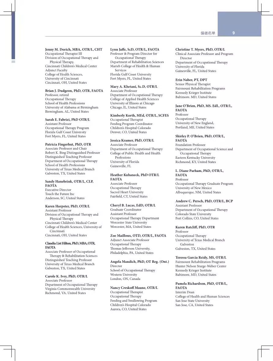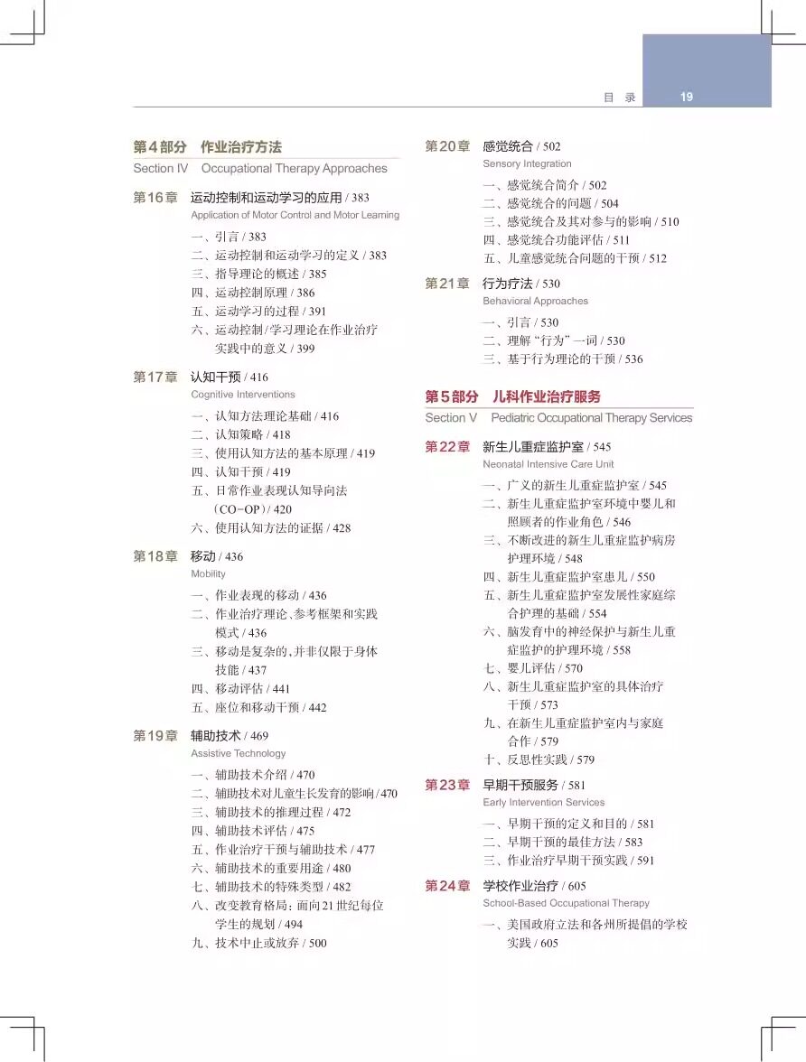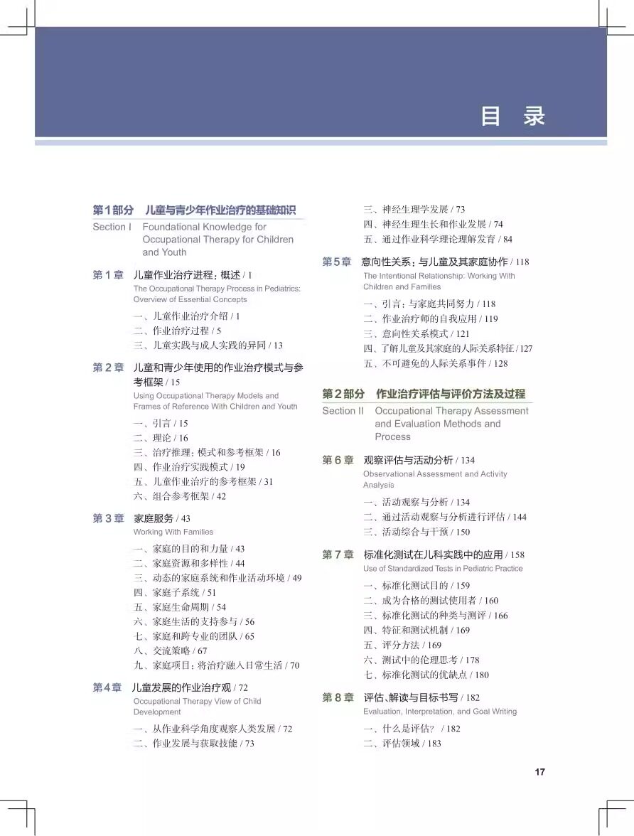 本书原著是美国儿童和青少年作业治疗专业教学的权威参考书。全书从婴幼儿到青少年阶段人体发育的特点出发,充分考虑环境因素对儿童发育的影响,通过详细阐述各个维度的作业评估方法,结合儿童常见致残性疾病,指导读者制订作业治疗方案和辅具评估方案。全书共分6部分,包括儿童与青少年作业治疗的基础知识、作业治疗评估与评价方法及过程、作业活动的评估与治疗、作业治疗方法、具体疾病的作业治疗。