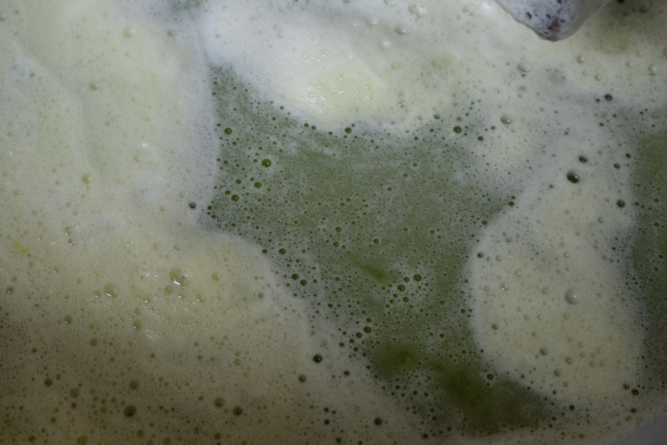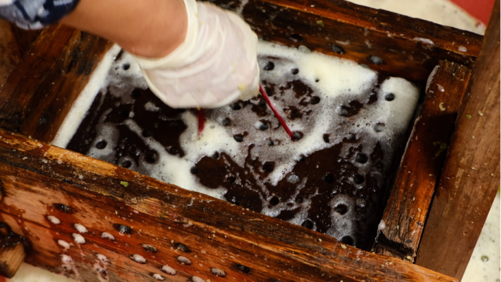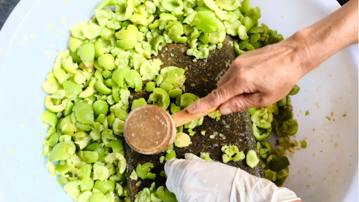 村民先用流溪河水源保护区的山泉水将青梅洗净,用传统木棒和改造后的木制机器打碎梅肉,随后用木制的榨汁篮(捣碎、挤压重复两次以获得更多汁液),最后通过2-3次过滤得到青梅原液。