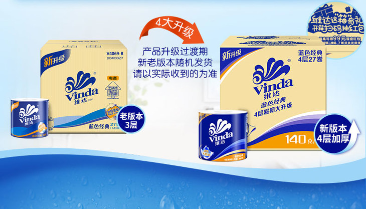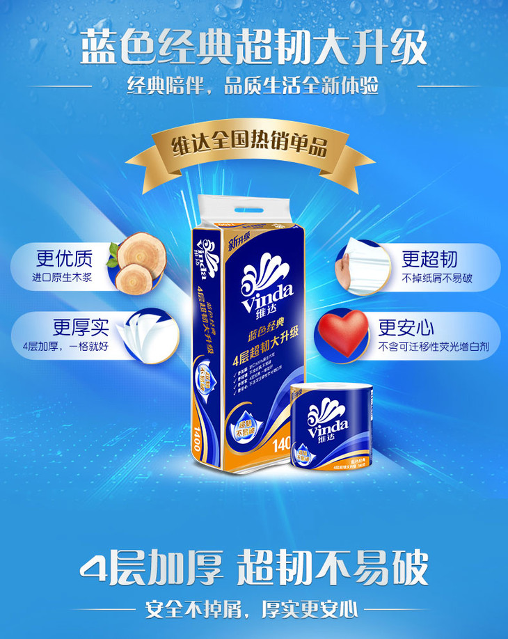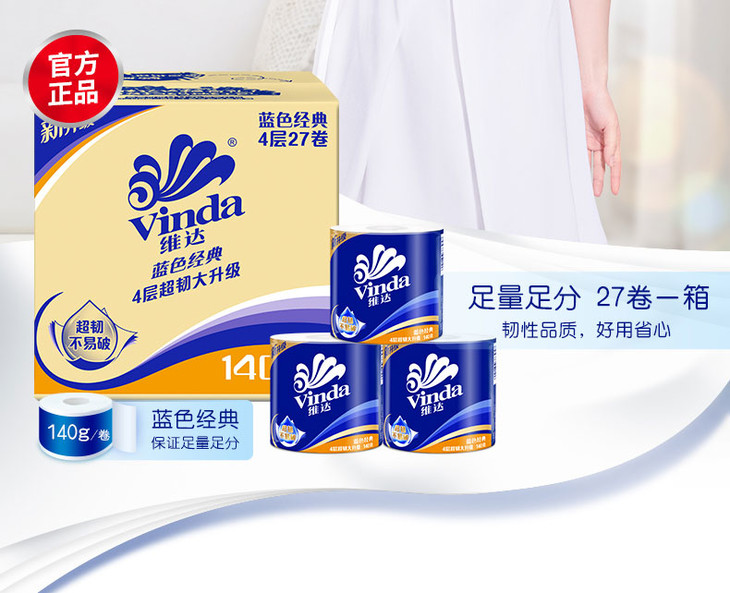 【维达·蓝色经典】卷纸 蓝色经典4层140g 手纸 卫生纸 纸巾 27卷/箱