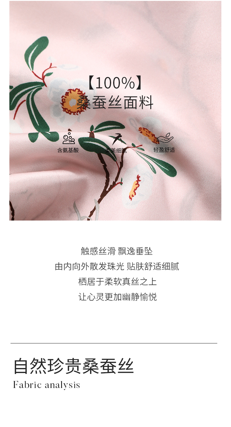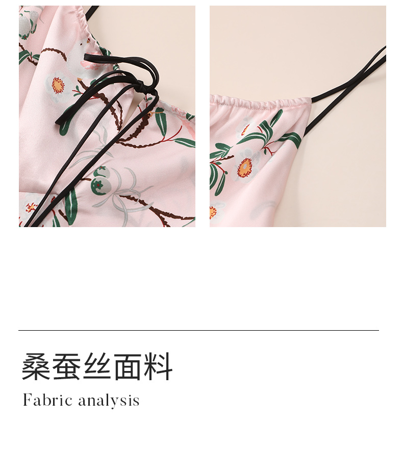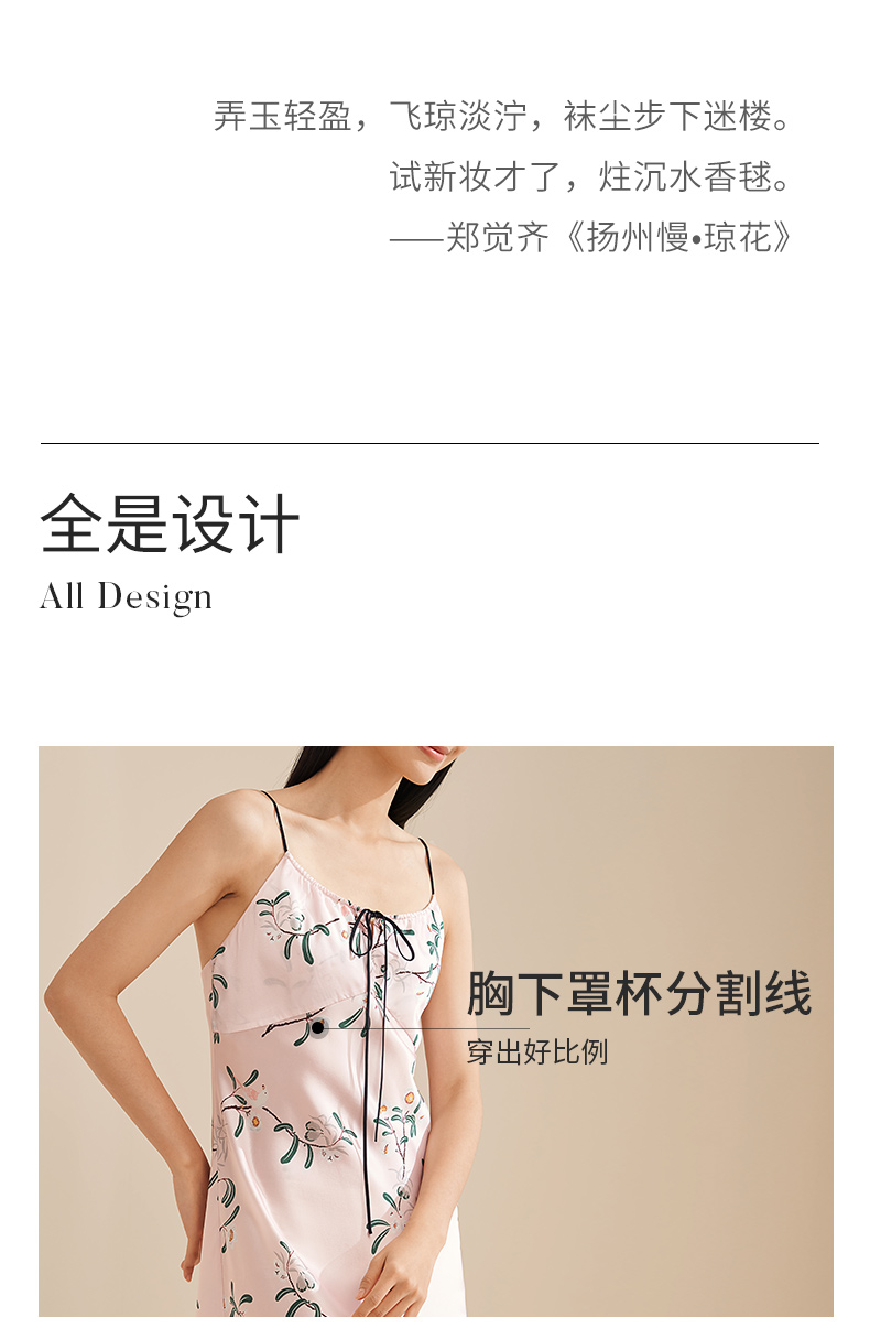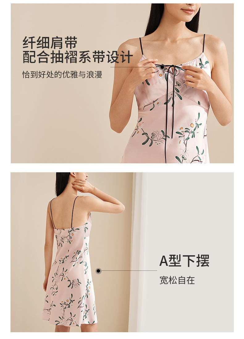 【琼花与玉叶】真丝睡裙女100%桑蚕丝抽褶系带印花吊带裙家居服金三塔 YSFEA315
