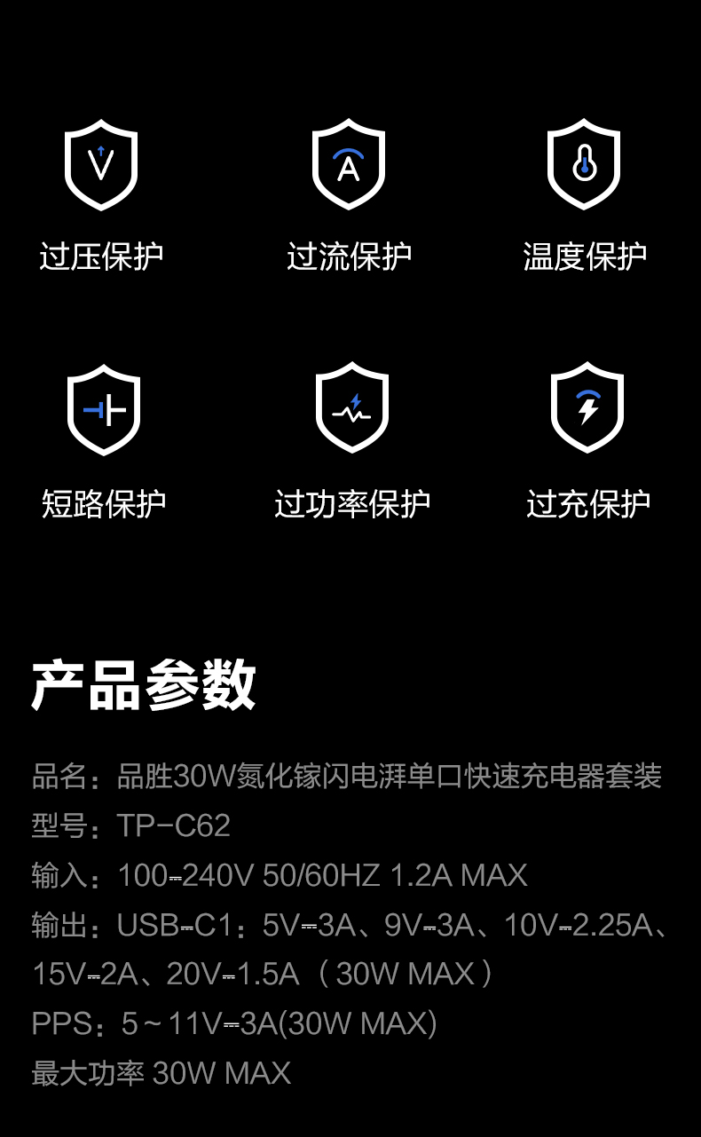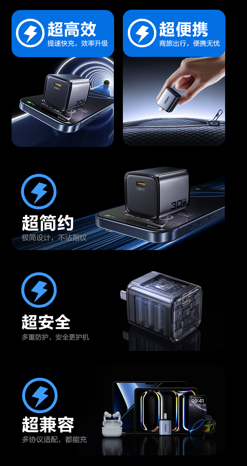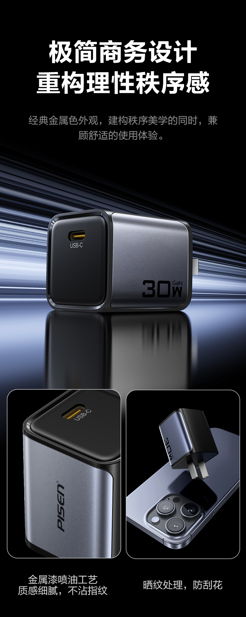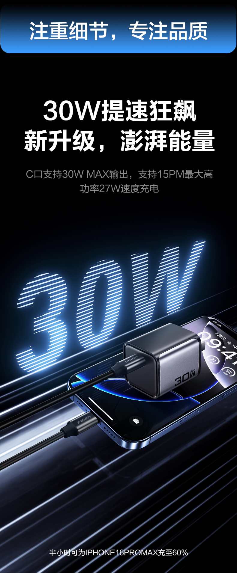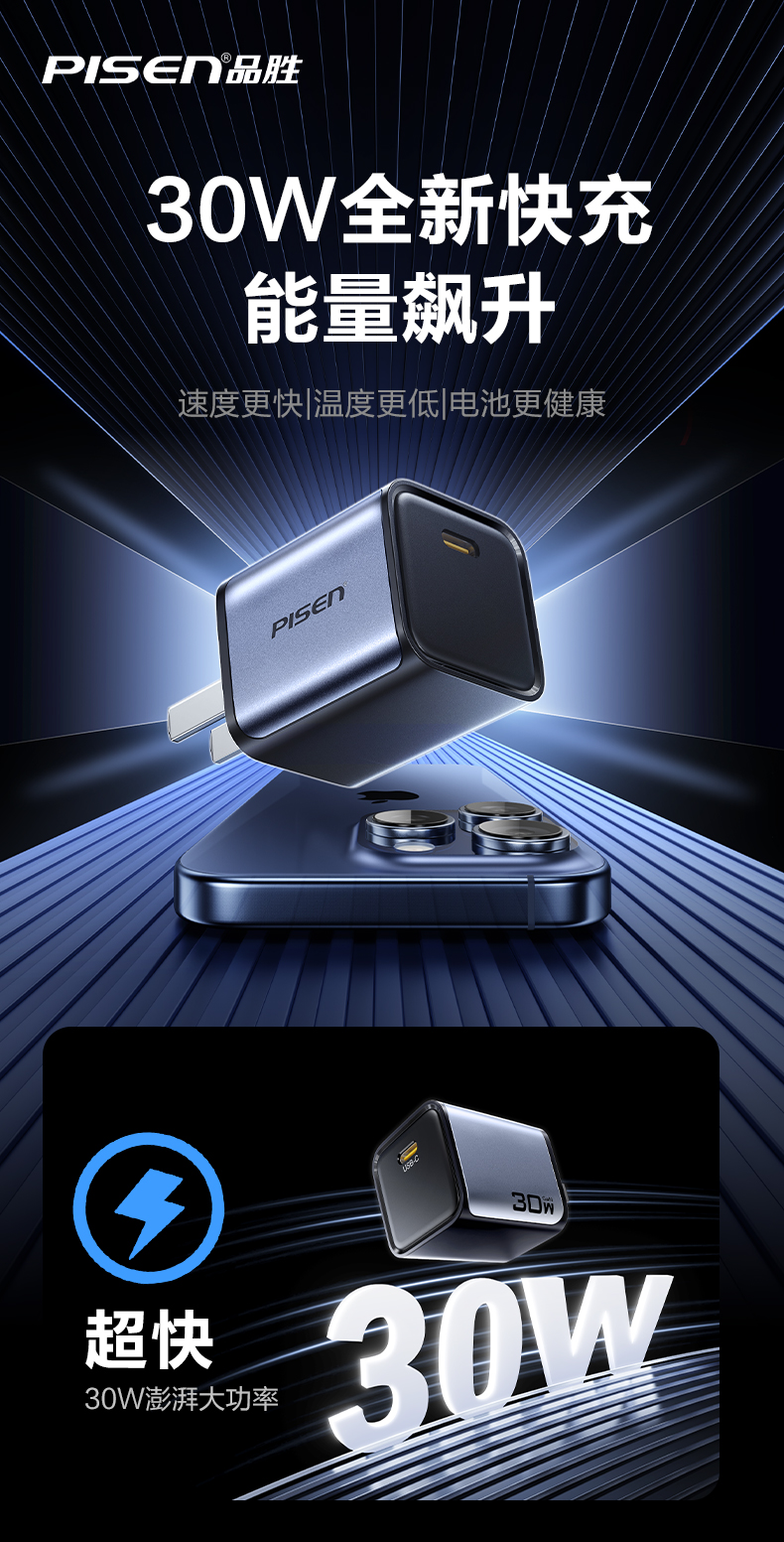 品胜 30W氮化镓闪电湃单口快速充电器苹果16充电头30W快充插头Type-c适用iPhone16/15/14华为小米手机平板小巧