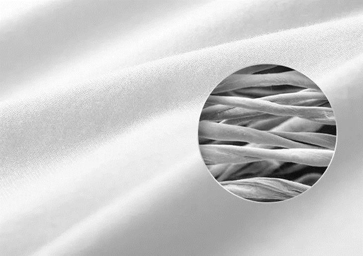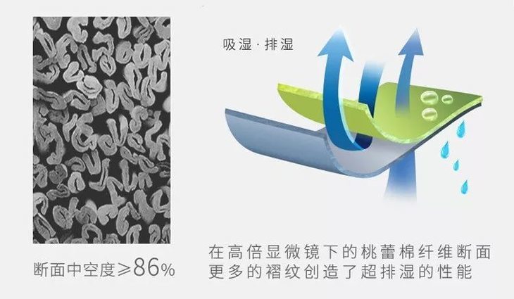 ▲ 这是因为桃蕾棉纤维断面褶皱很多,且断面中空度高达86%,面料表面形成许多小凹槽,这既能保证快速吸收体表汗液,又能将汗液蒸发排出。