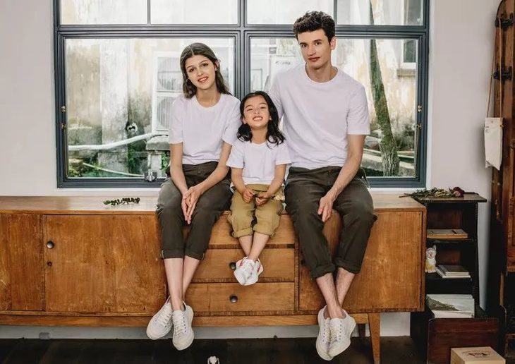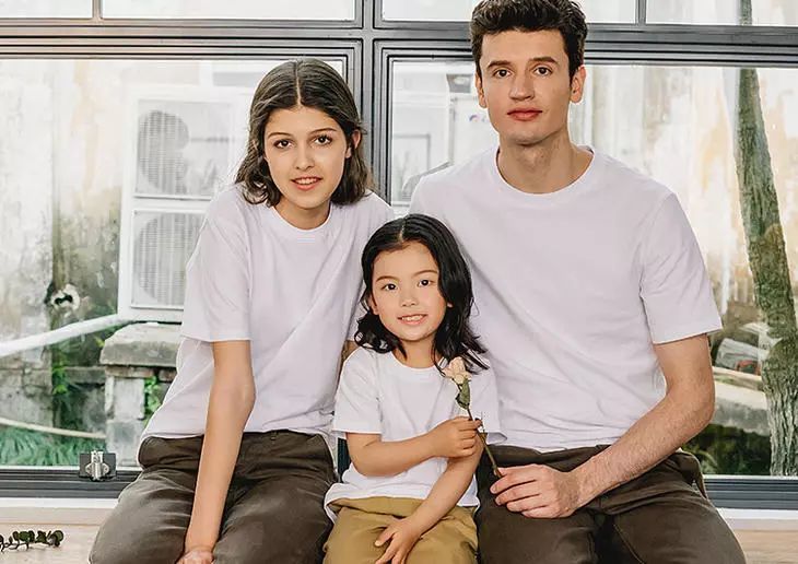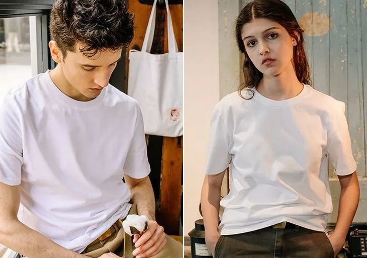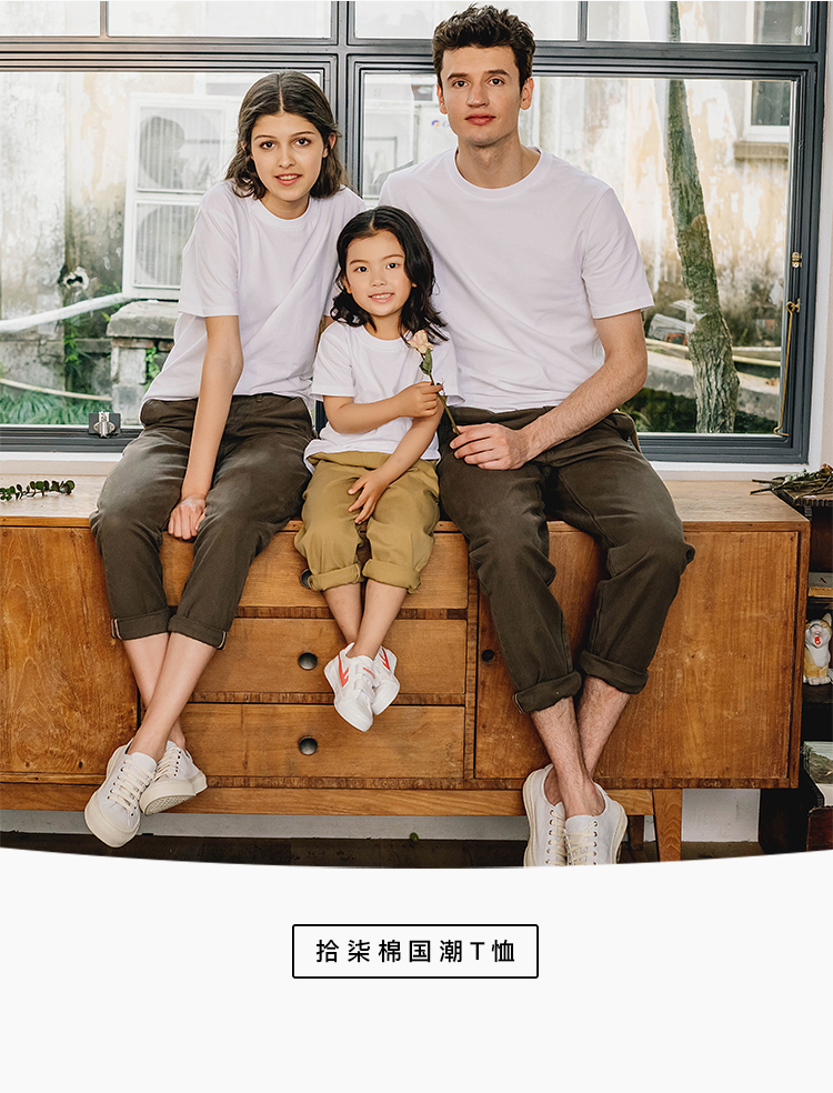 男女款、儿童都是同款白T,男生穿显挺拔,女生穿显得苗条,小孩穿清纯可爱。