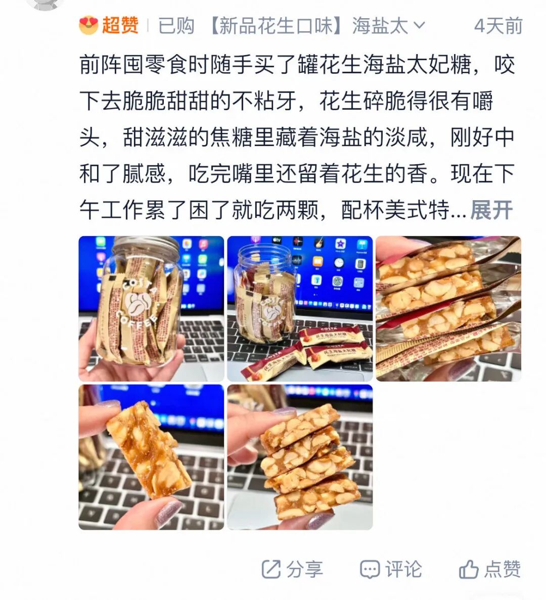 尤其推荐吃糖配咖啡,不管是巴旦木配咖啡,还是花生配咖啡,都能碰撞出绝妙口感,实测两款都不踩雷,闭眼入就对了