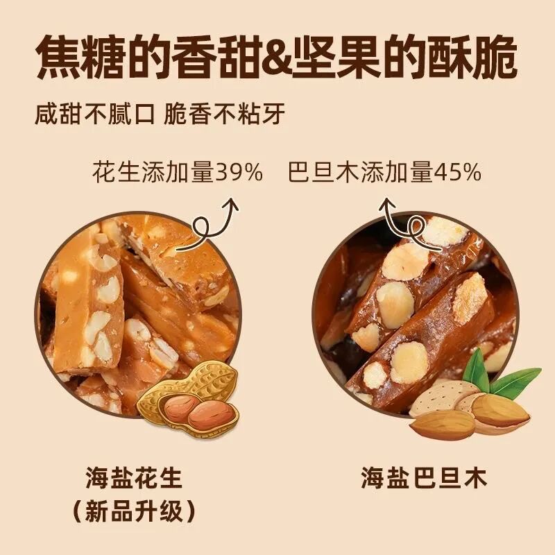 独立包装的太妃糖,甜咸口感唤醒味蕾、补充能量,坚果脆感让大脑清醒;