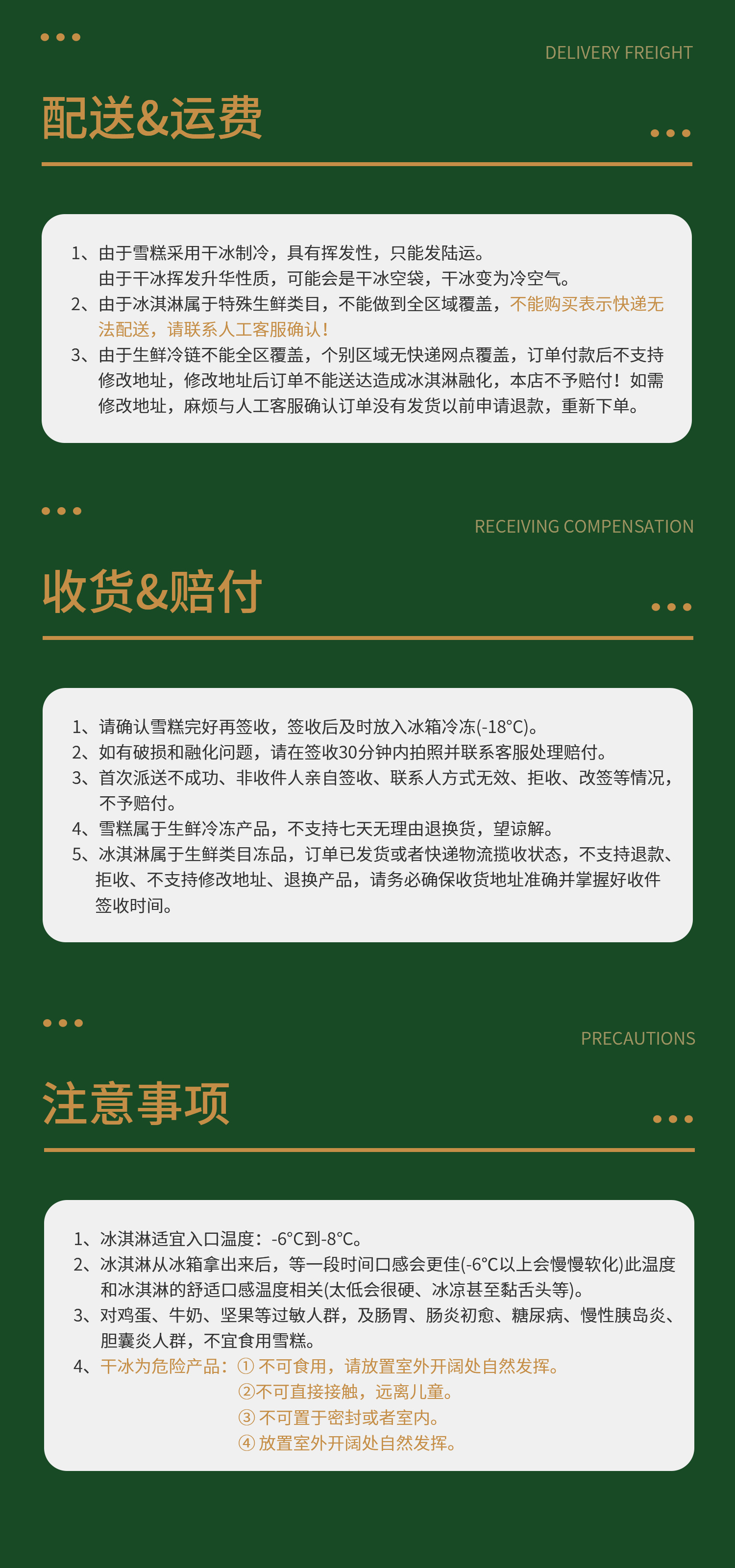 | 售后标准 | 【冷链商品非质量问题不支持退款、不支持拦截、拒收、改地址】 【售后说明】收件人保持电话畅通及时签收,签收后立即放入冰箱冷冻-18度。如发现质量问题,请收到后30分钟内反馈客服处理,未及时签收以及超时反馈无法理赔。 |