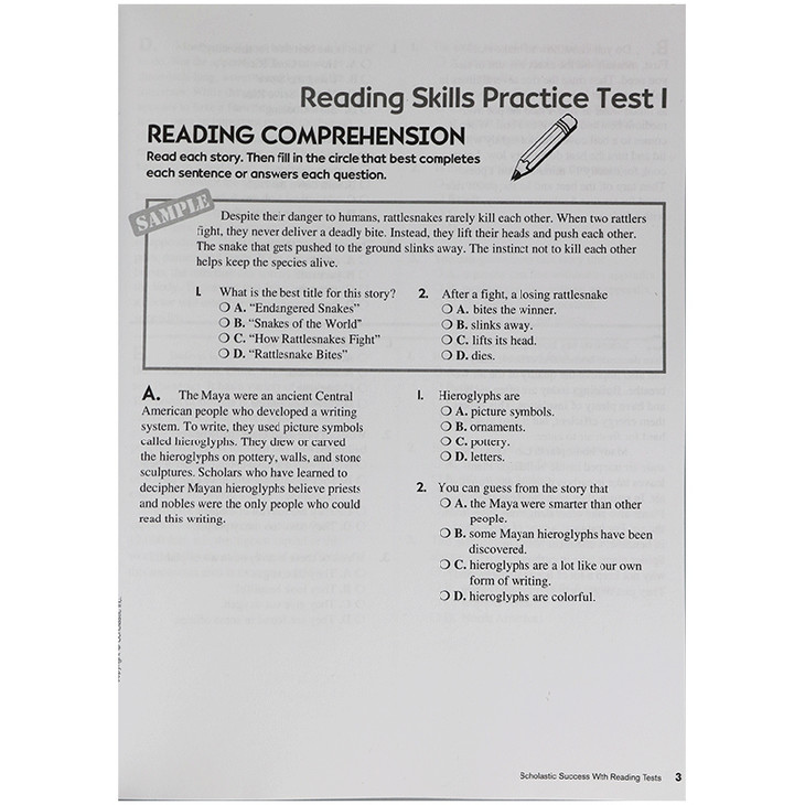 TheScholastic Success With Reading Tests series is designed to help you help students succeed on standardized tests. In this workbook for third grade, the 15, four-page test are culled from the reading skills practice tests provided three times a year to Scholastic News Edition 3 subscribers, with some new and revised material. By familiarizing children with the skills, language, and formats they will encounter on state and national test, these practice tests will boost confidence and help raise scores.