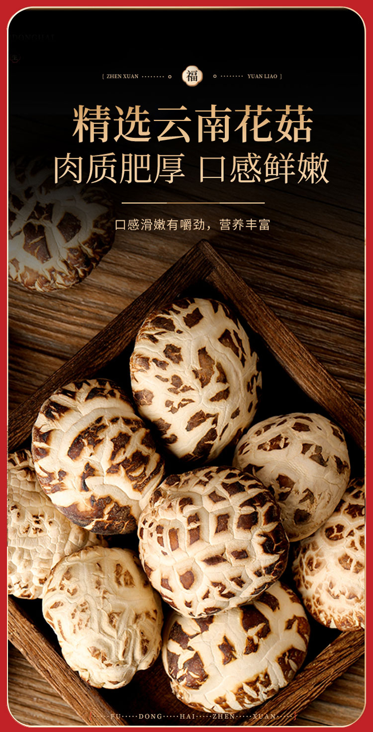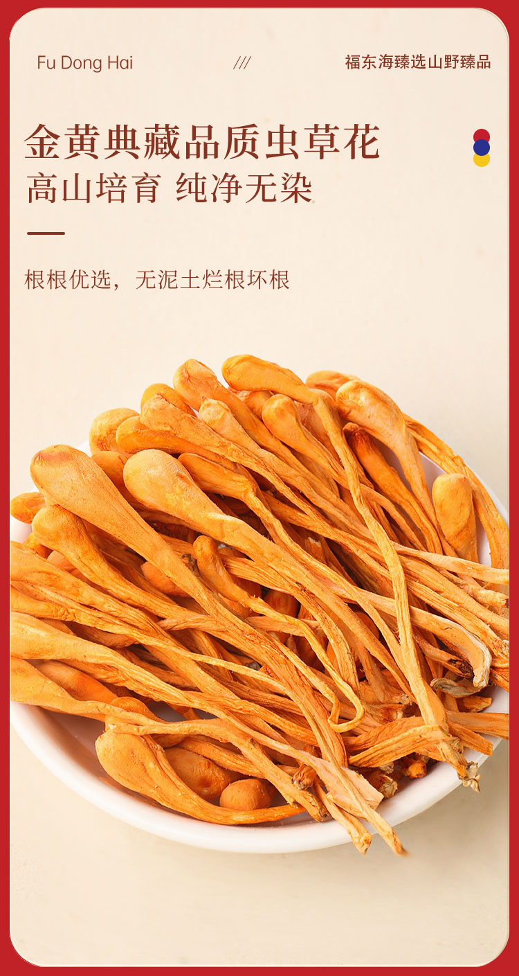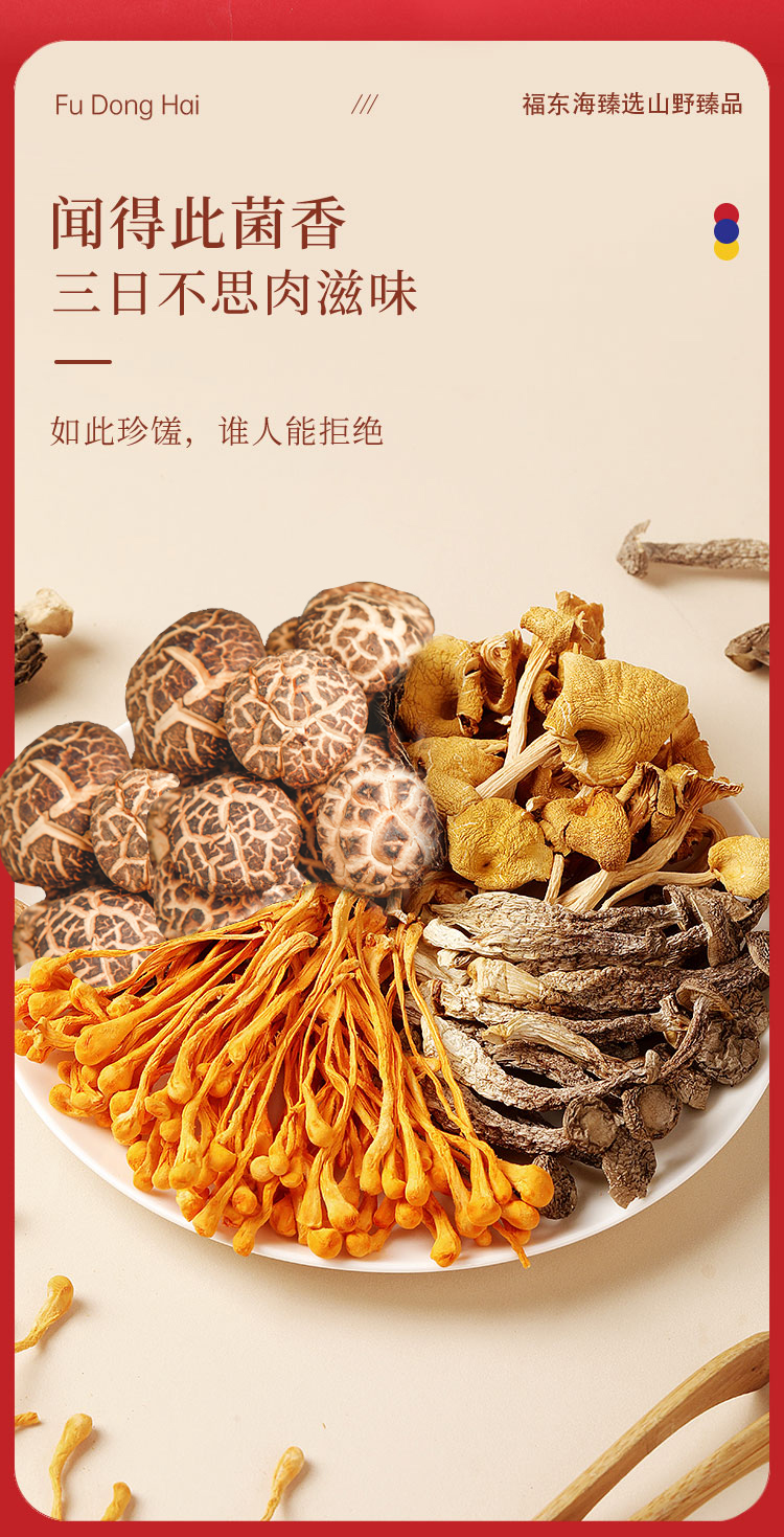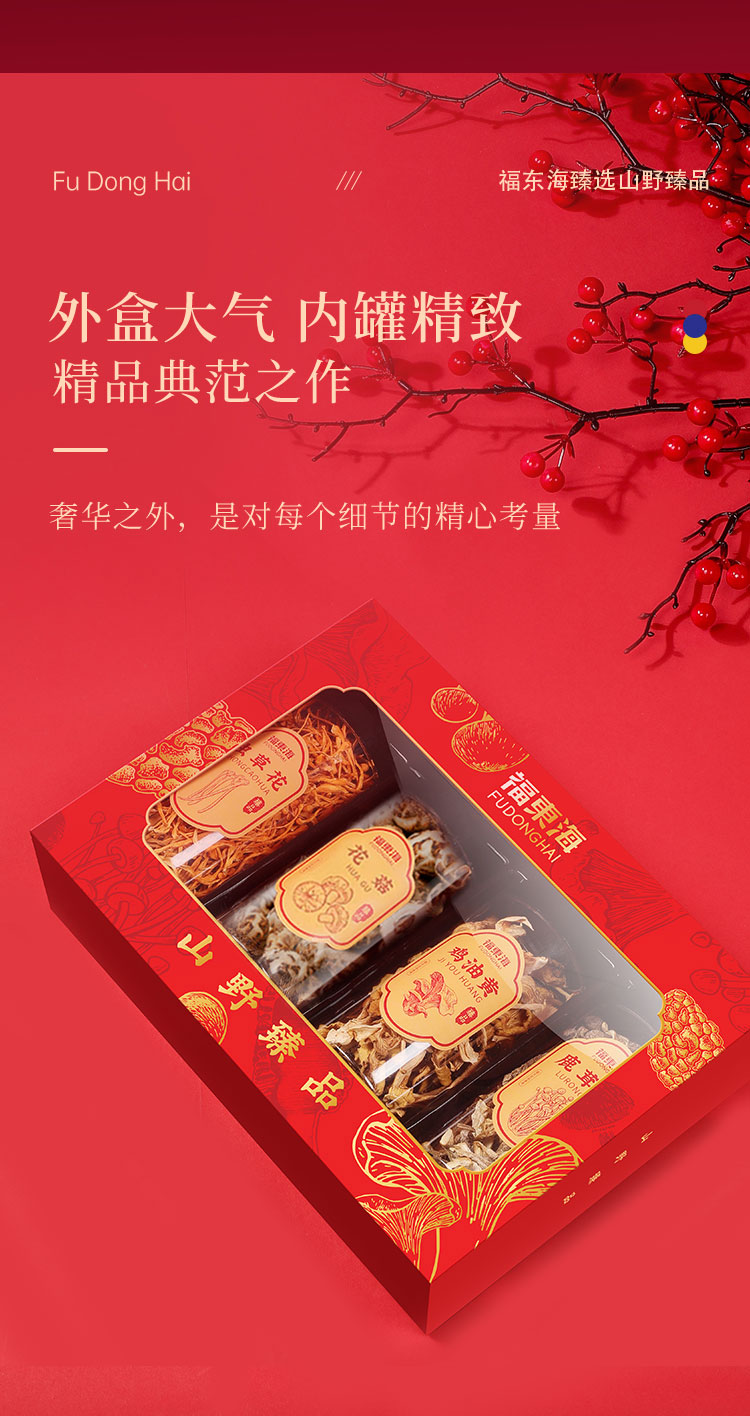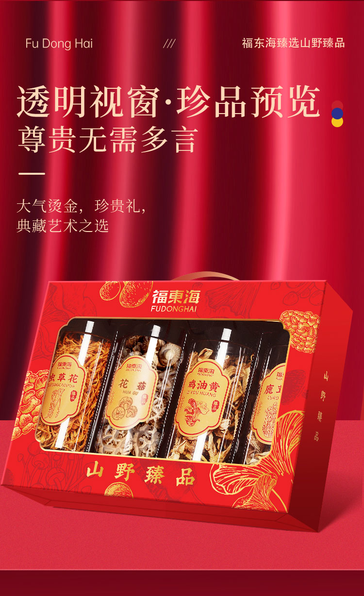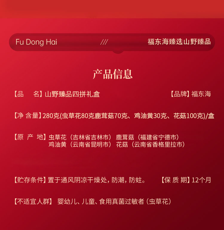 【福东海】山野臻品四拼礼盒280克(虫草花80克、鹿茸菇70克、鸡油黄30克、花菇100克)/盒 菌菇汤包 虫草花姬松茸 花菇 鸡油黄 滋补煲汤汤料材料420克