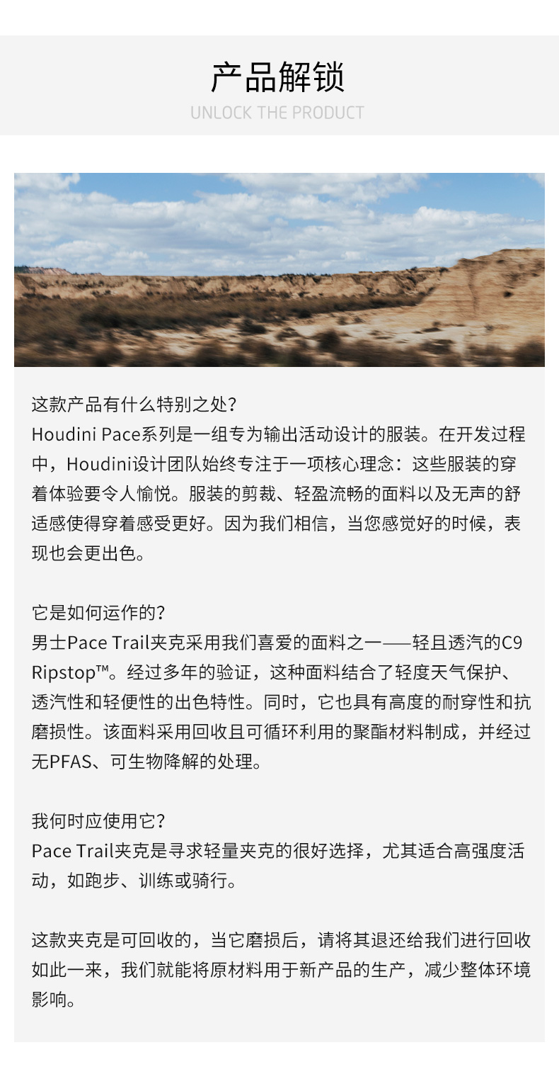 HOUDINI胡丁尼PaceTrail疾速户外26春夏新男立领骑行跑步防风夹克 810058
