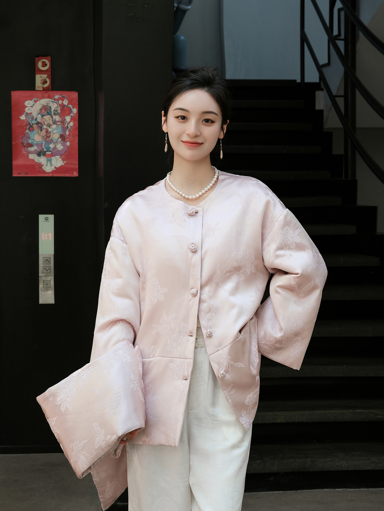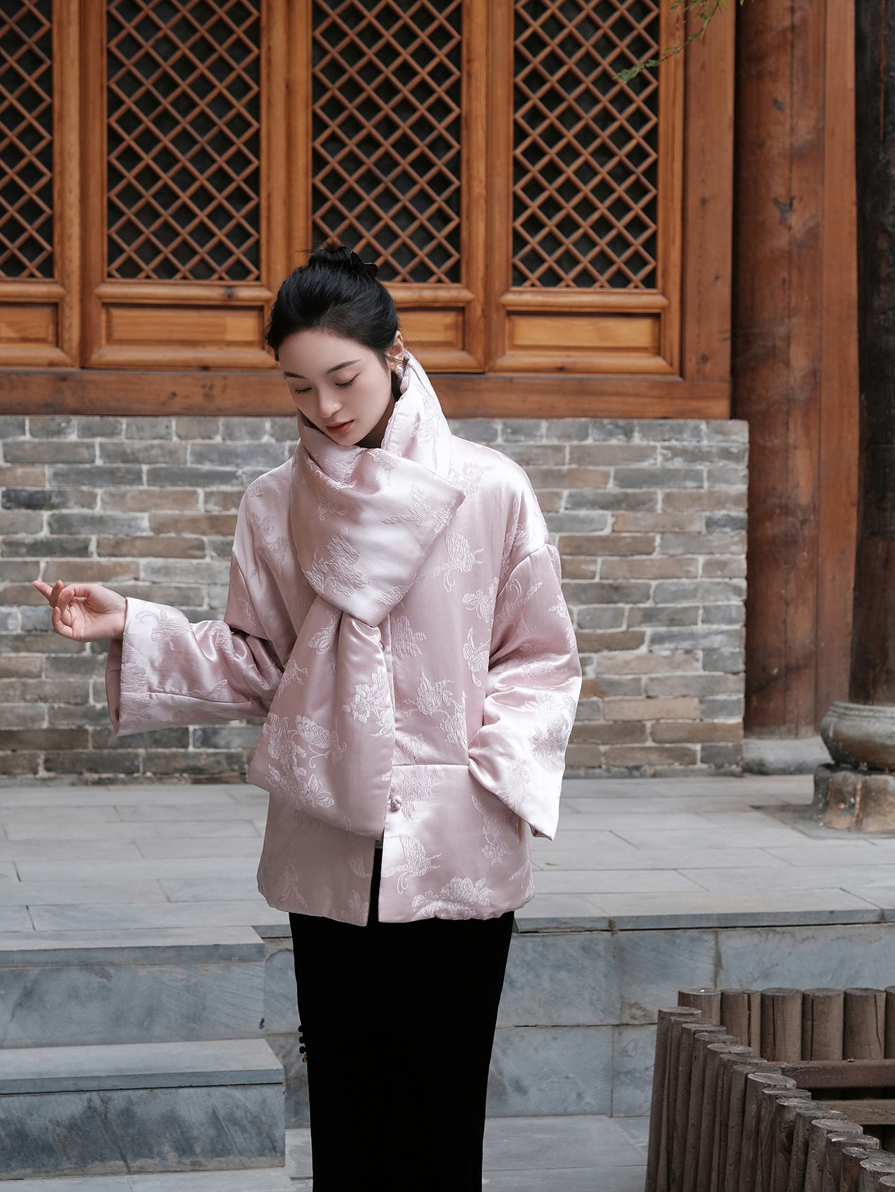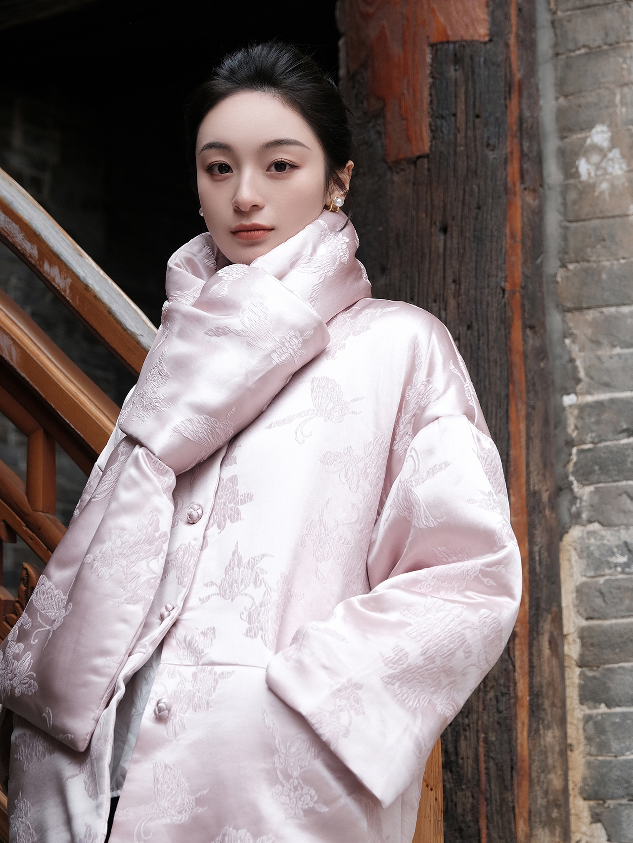 盛唐牡丹|银粉色冠乐绉蝶恋花棉服 (配围巾)