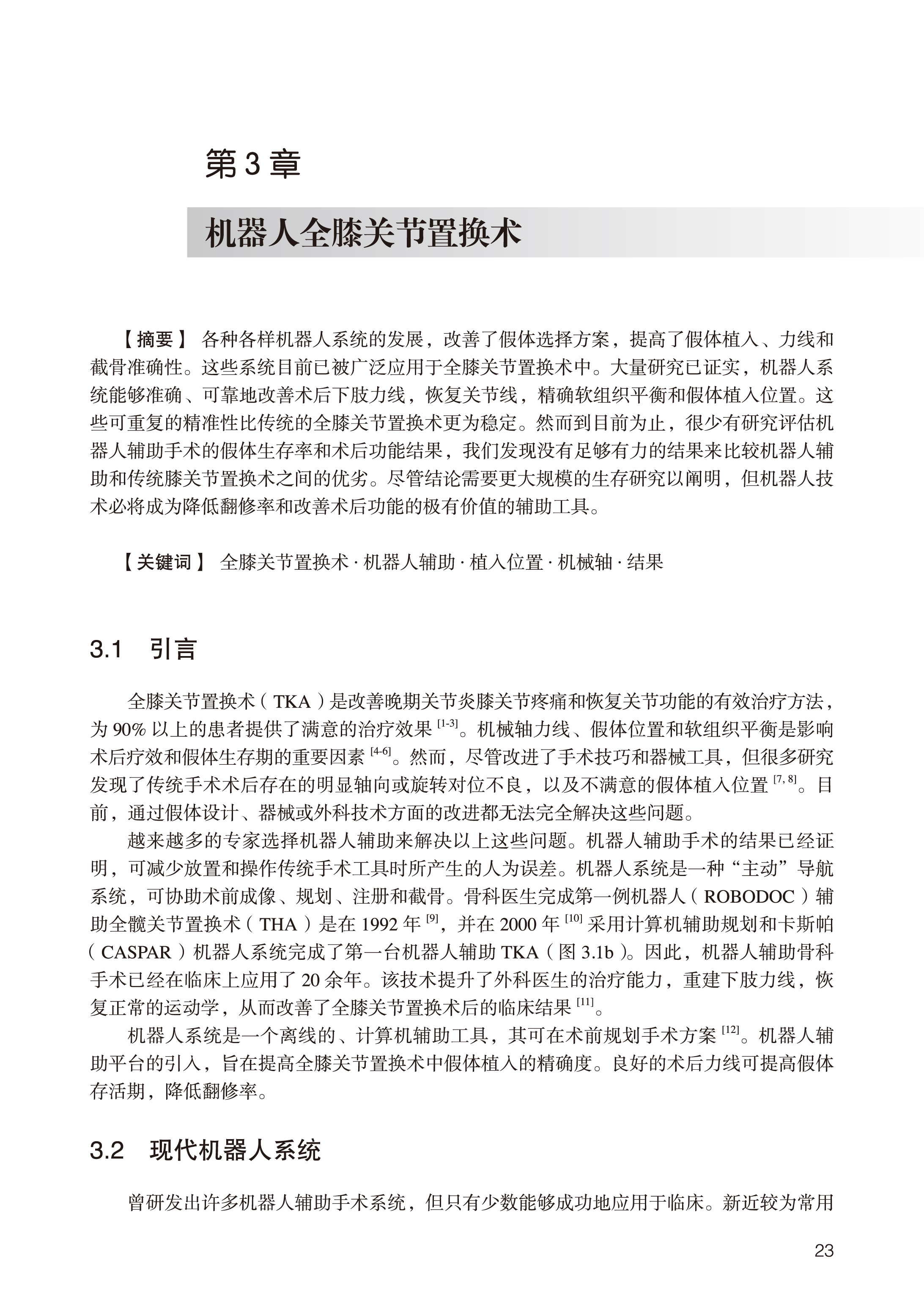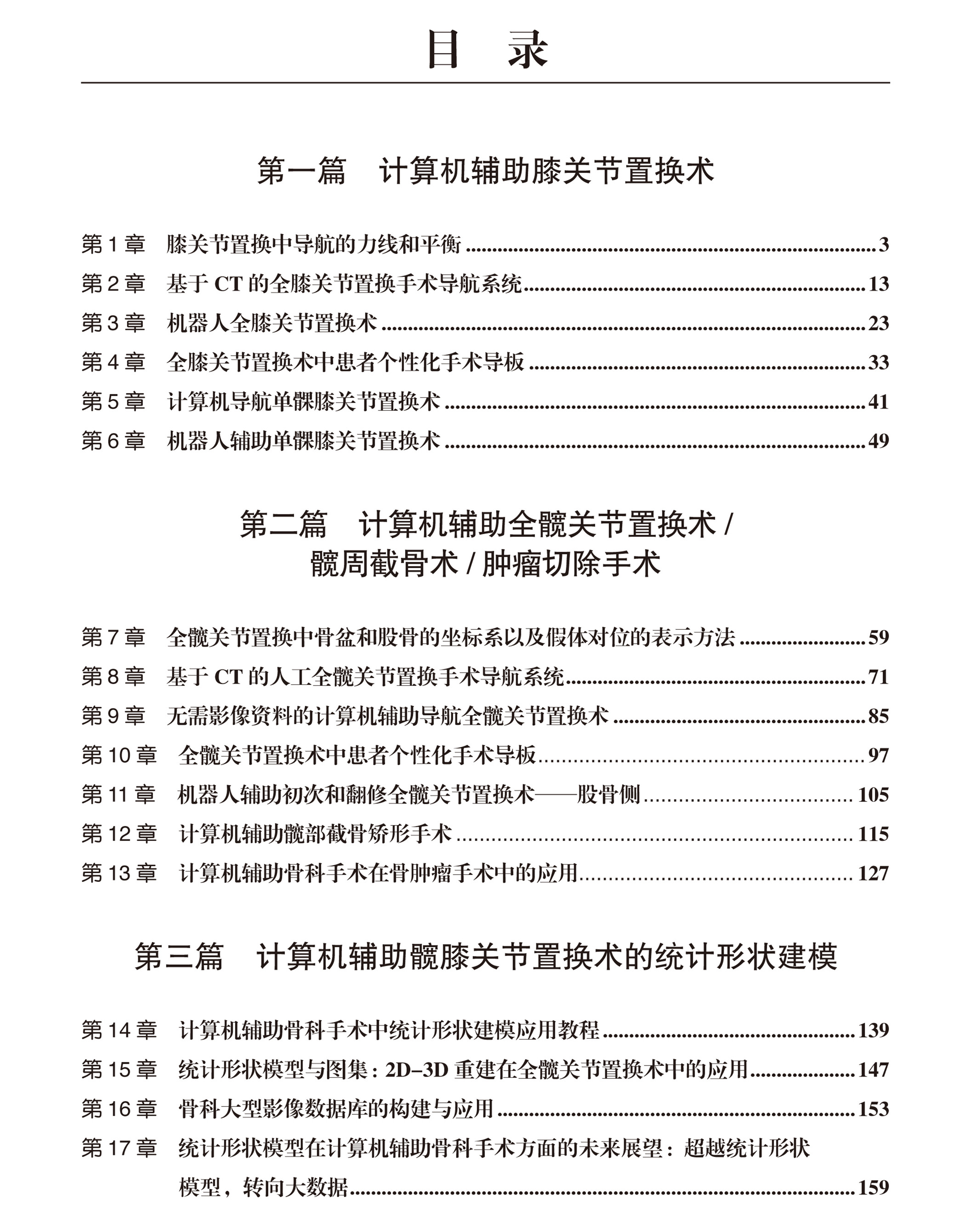 书中聚焦热点话题,内容数据翔实,图文并茂,使读者可以系统了解到当今CAOS的先进理念和具体技术细节,无论是对各年资骨科医生,还是临床技术专家,都是难能可贵的学习佳作。全书分为三个部分,第一部分关注计算机辅助全膝关节置换术,包括了导航辅助软组织平衡、全膝及单髁置换术,也涉及了个性化术前规划的内容。第二部分围绕计算机辅助全髋关节置换、髋周截骨以及肿瘤手术进行了论述。第三部分则从基础算法入手,介绍了数学模型等核心技术在计算机辅助膝髋关节手术中的意义。