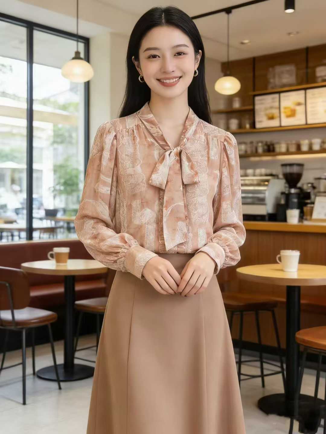 SC1F06 如梦令衬衫 定制高支雪纺面料,加入暗纹肌理,轻薄透气且自带垂坠感,不易透肉气质,法式飘带领结、复古图腾印花,飘带可自由系成蝴蝶结 / 平结,领口微泡泡袖,袖口做同印花荷叶边收口。