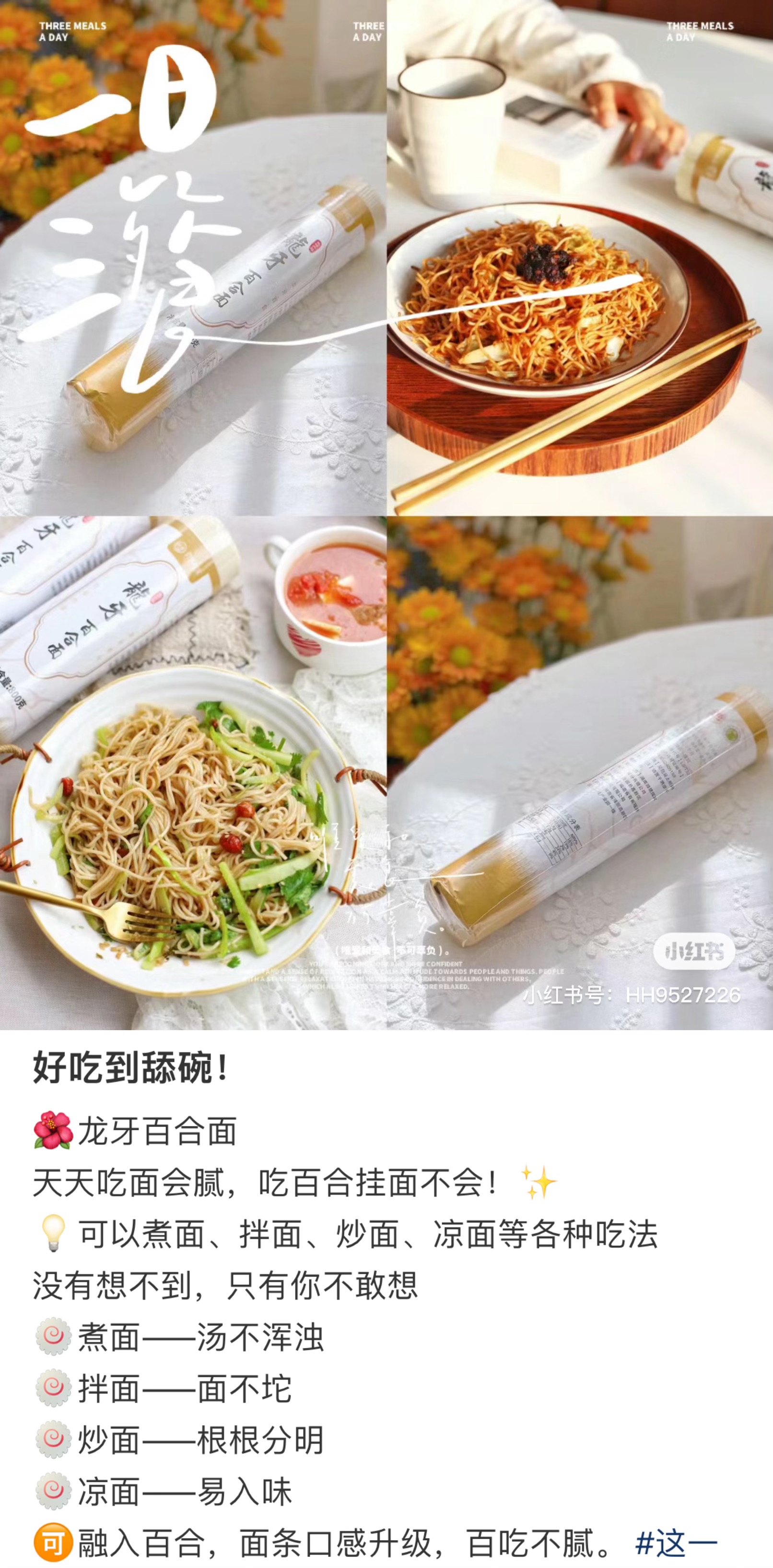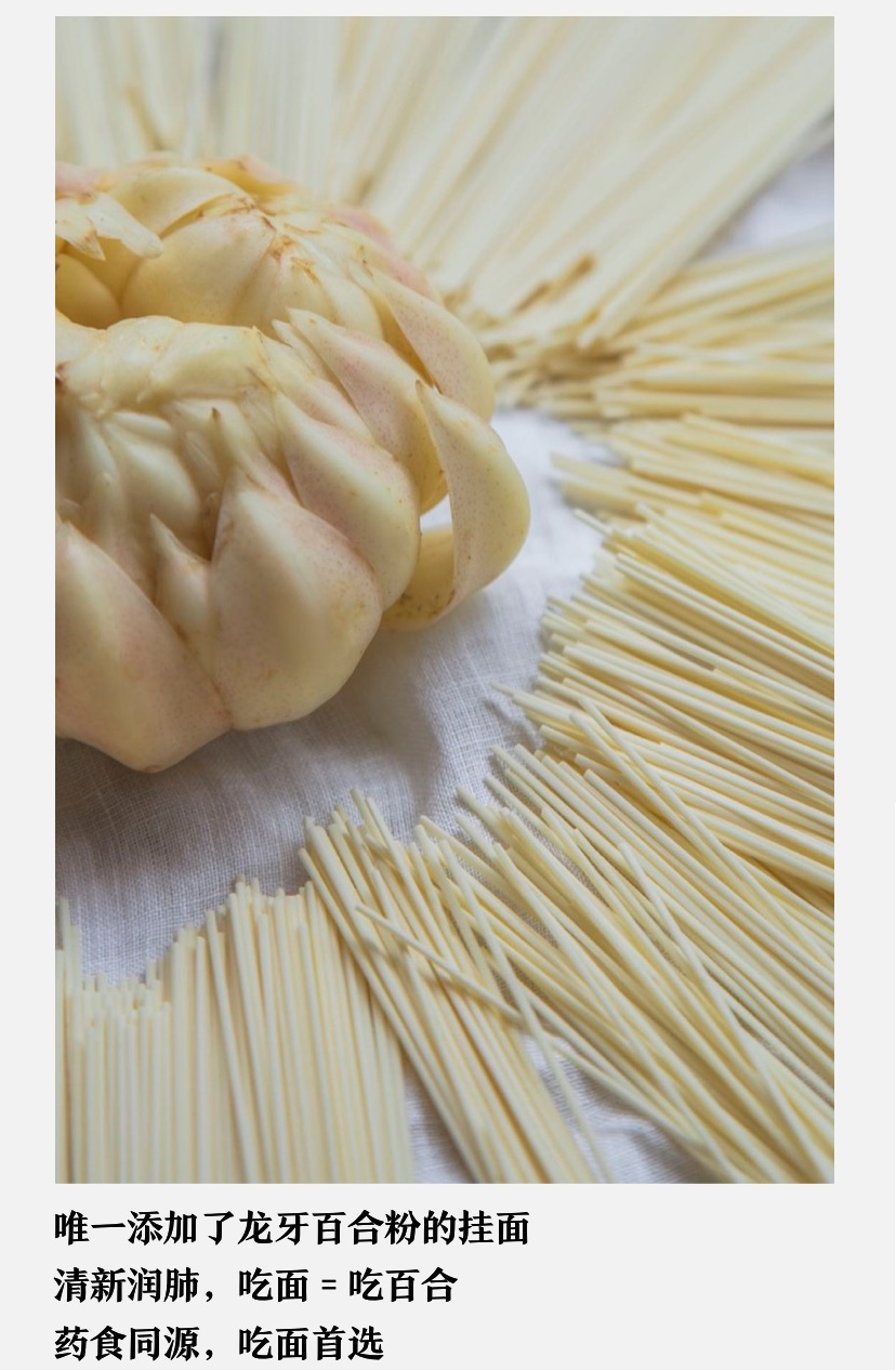 龙牙百合美名“南方人参”,富含蛋白质、钙、铁及各种维生素等。品牌是精选地理标志性农产品隆回龙牙百合,当季由人工采摘筛选后,再磨成粉,200g鲜百合只能得到50g百合粉哦!再用优质高筋小麦粉为基础原料,添加上高达20%的隆回龙牙百合粉,确保面条口感细腻且富有弹性。同时坚持传统晾晒成型工艺,避免机器烘干,让每一根面条都能充分吸收阳光和空气,保持其天然的爽滑劲道。而儿童款挂面则是添加了高达27%的龙牙百合粉,并做成了无盐配方,更营养健康!两款百合面都没有其它多余添加剂,放心吃!
