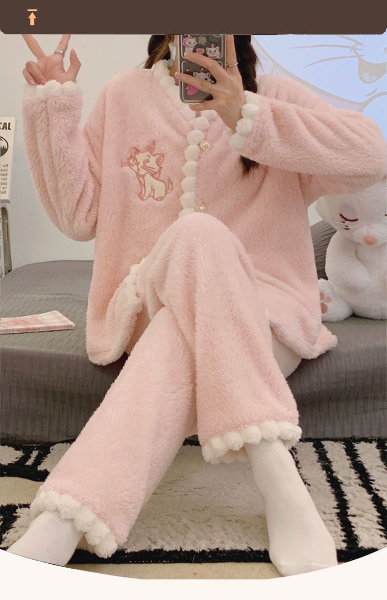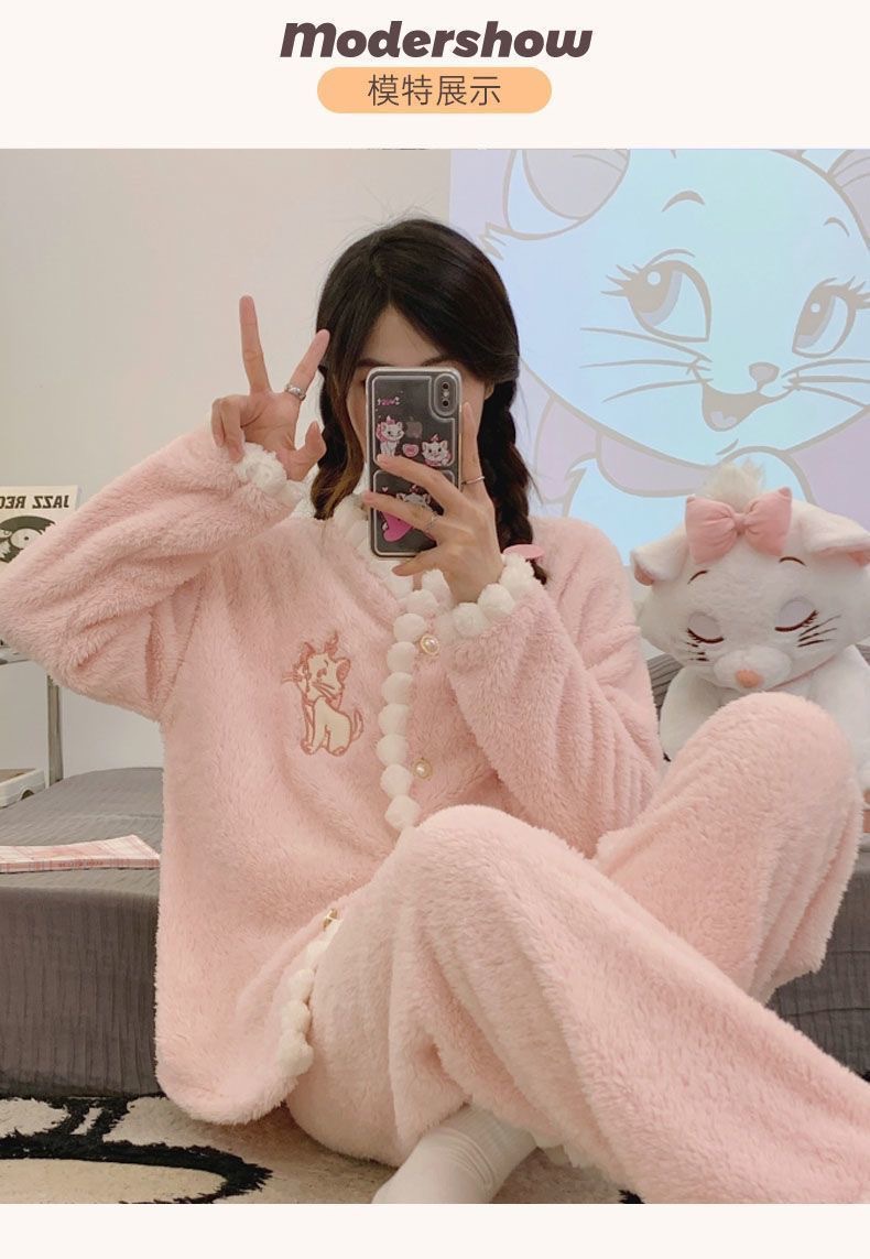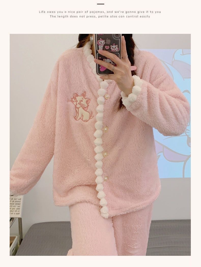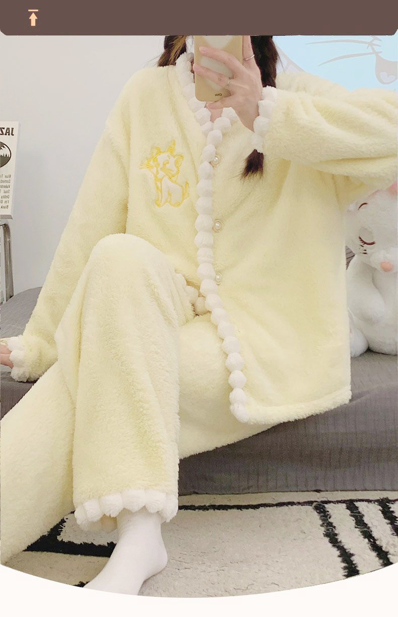 【双面加绒❗️刺绣法兰绒睡衣】冬季加绒加厚睡衣,胸前刺绣精致可爱,法兰绒家居服套装甜美可爱风女士睡衣