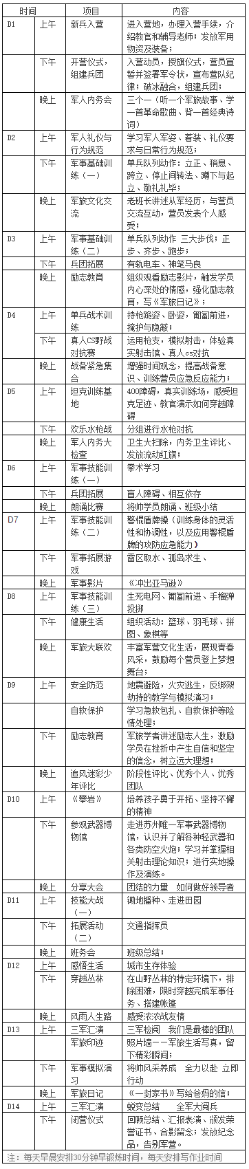 营地、训练、课程、教具、设备、服装两套、帽子、背包、全餐、拓展、教官、保险、送往大巴车、陪护(期间无需缴费)