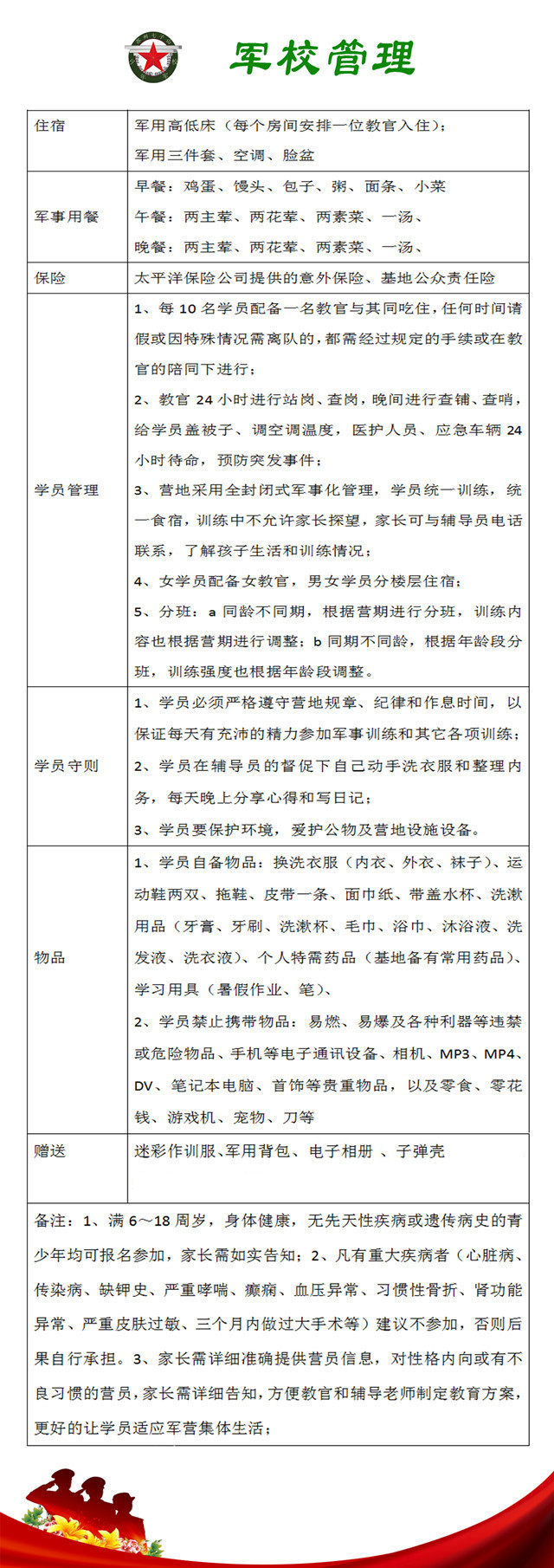 1、全封闭式管理,训练、活动场所设置明显安全提示,24小时守位站岗、巡逻,营地安全部门全程活动监控把关。