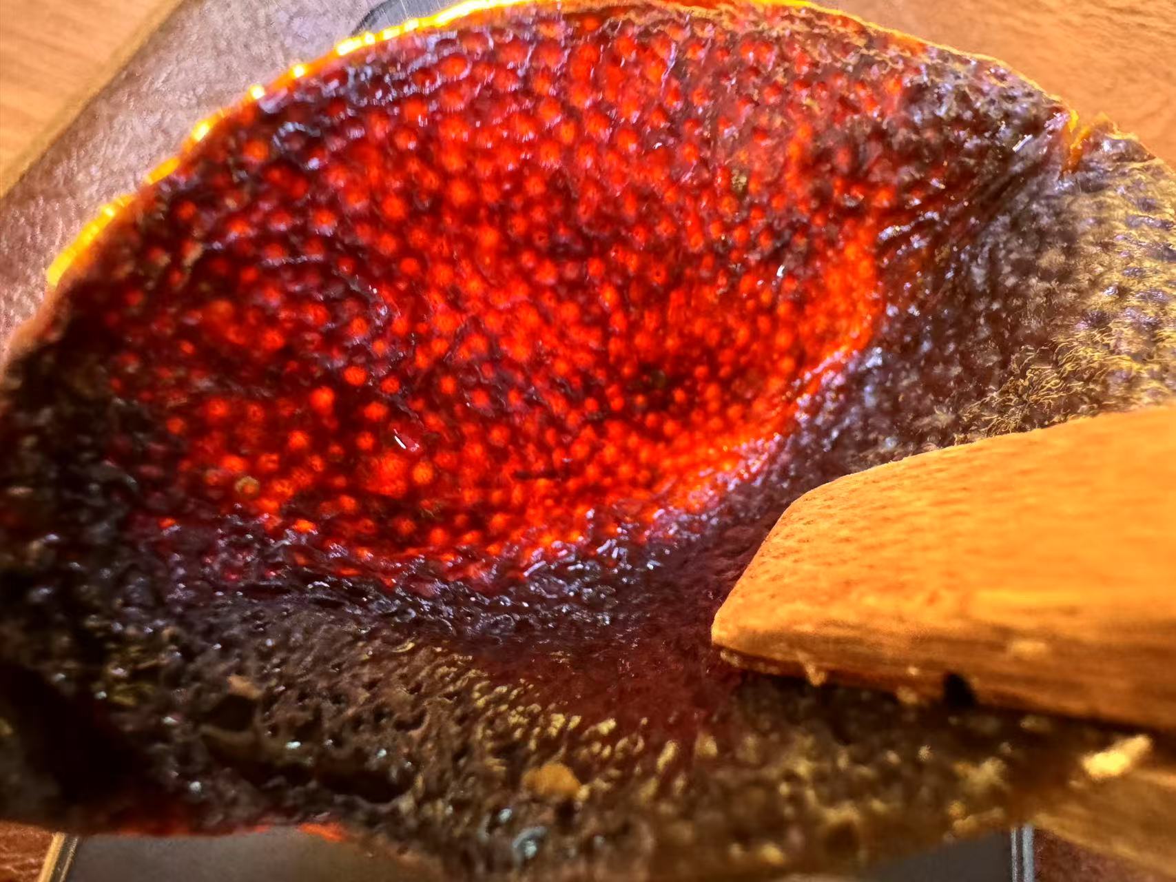 甜感很足,冲泡后香气进一步激发,红皮的甜香与陈化后的复合香气交融,尾调带一丝焦糖甜韵,彰显老陈皮的“越陈越醇”特质。