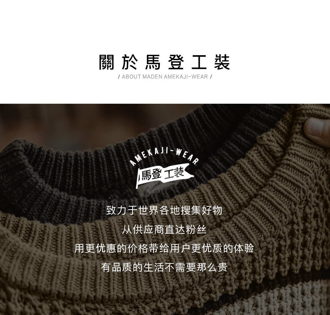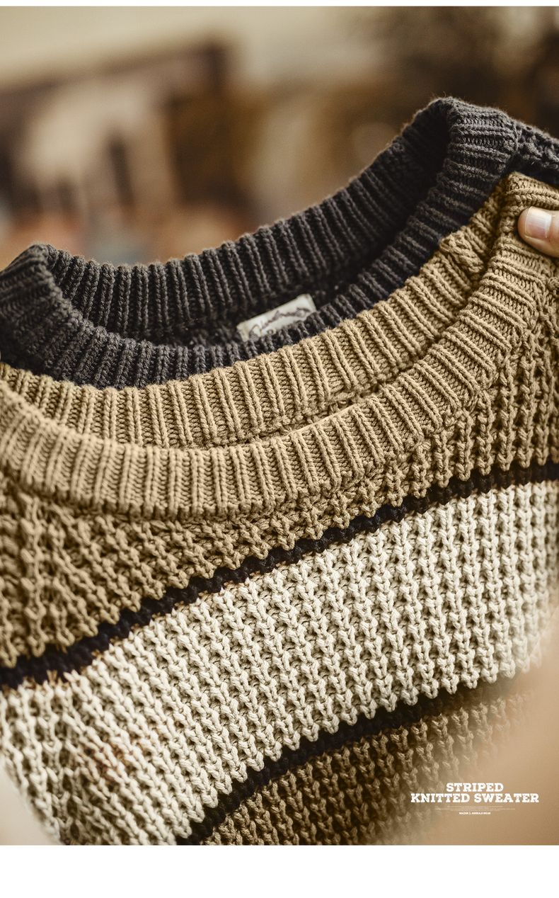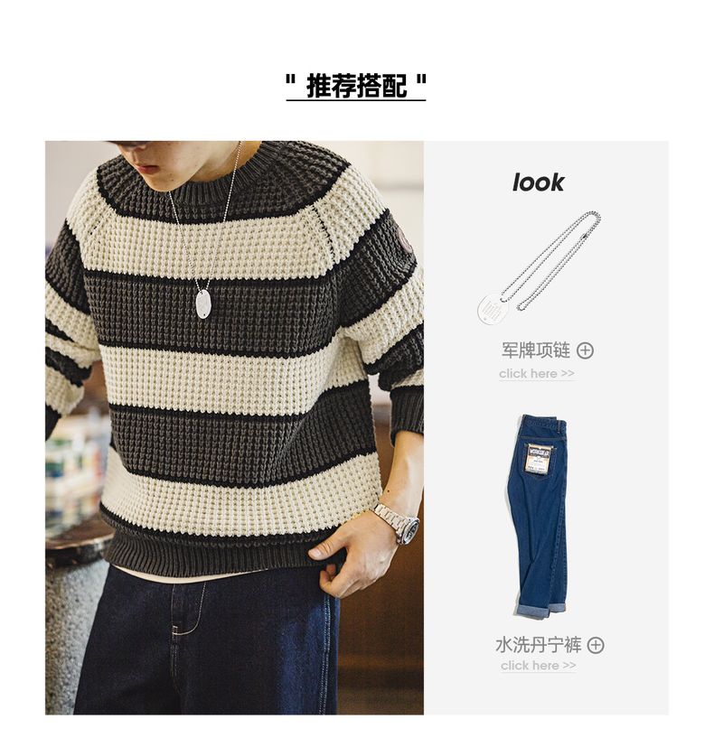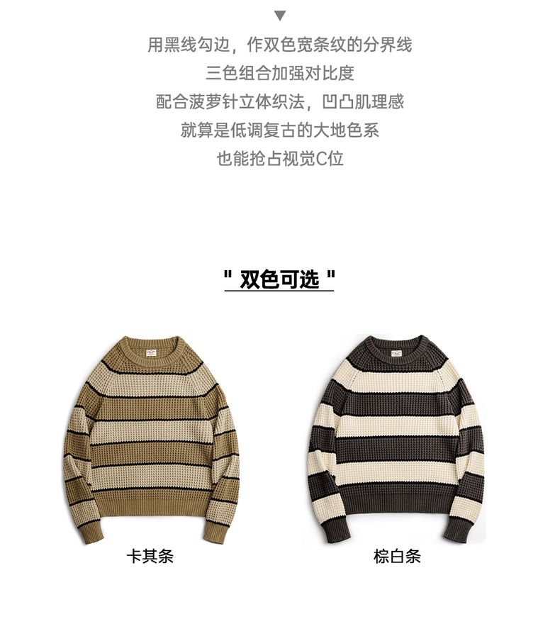 工装优选美式复古撞色菠萝条纹毛衣肌理感套头圆领打底针织衫男秋