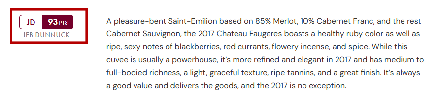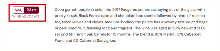 “深层石榴色的2017年份Faugeres,从杯中溢出漂亮车厘子、黑森林蛋糕和巧克力气息,随后是多汁玫瑰果茶,鲜切绿叶和丁香的暗示。中等酒体,味觉有如天鹅绒般丝滑的质地和一袋如香水般的果实,在50%新和50%填充法国橡木桶中陈酿15个月,85%梅洛、10%赤霞珠和5%其他赤霞珠。”