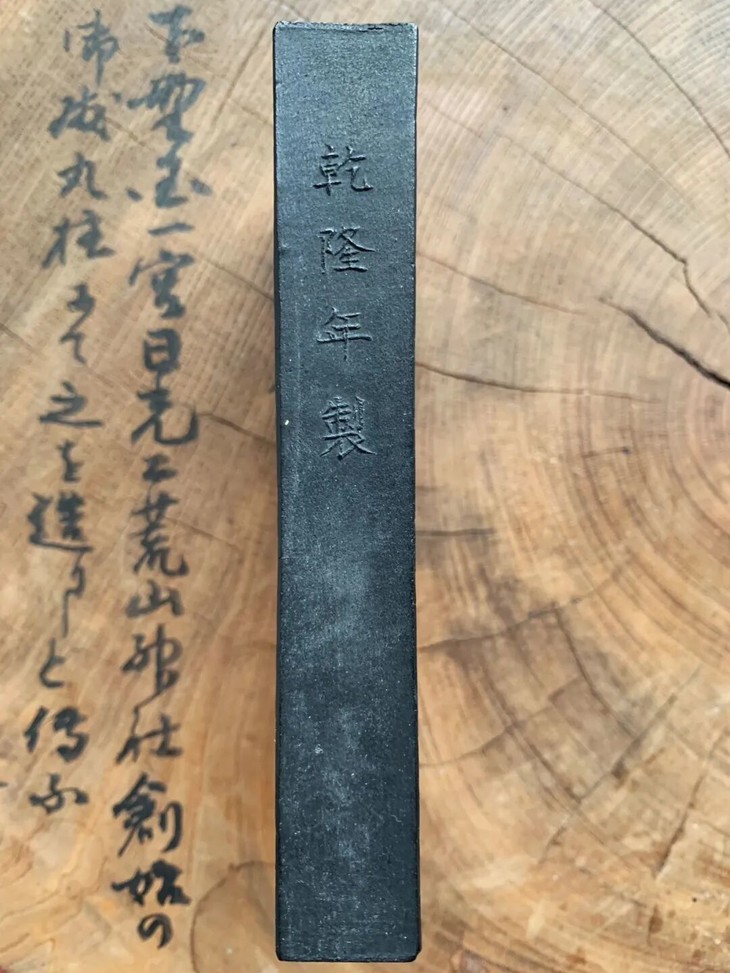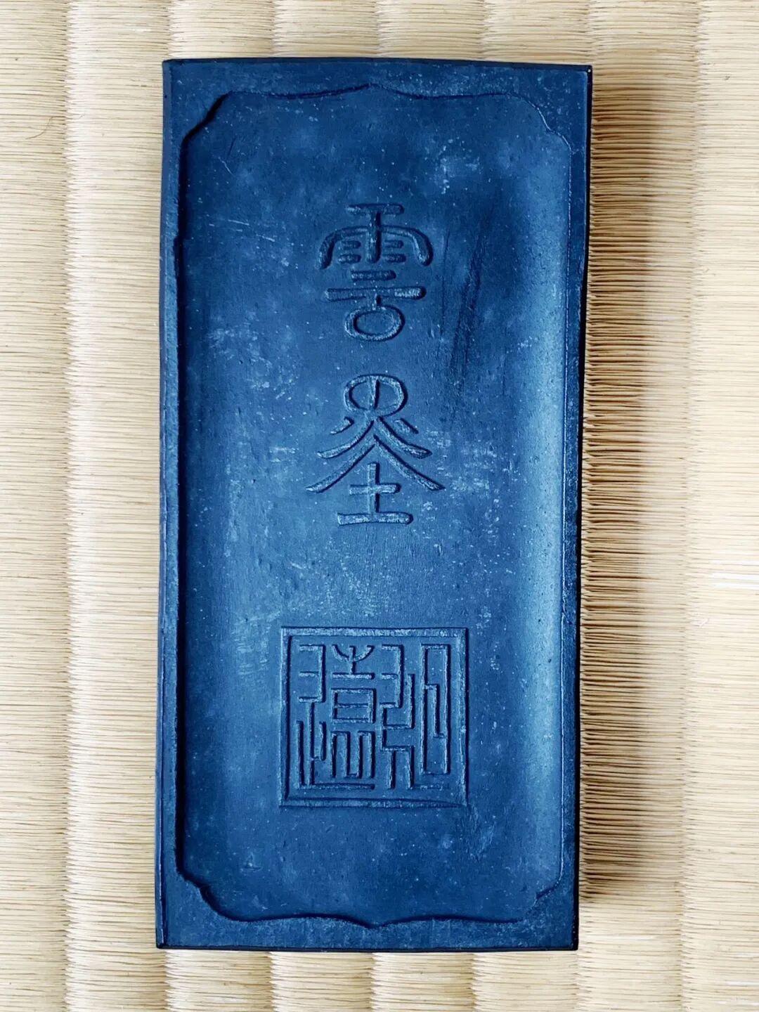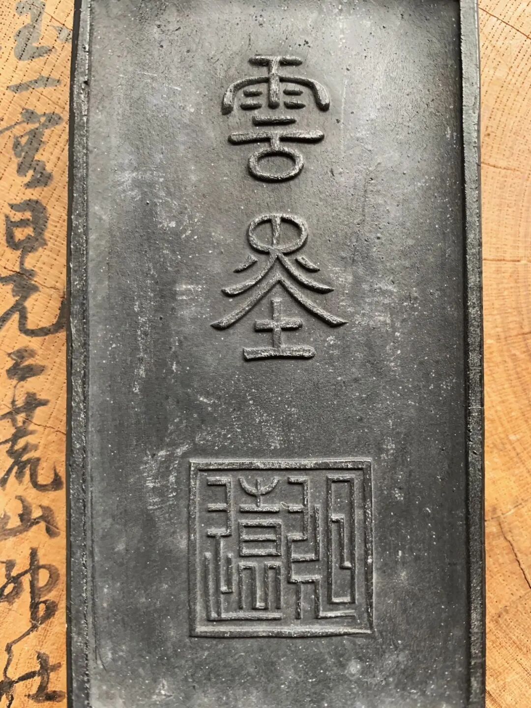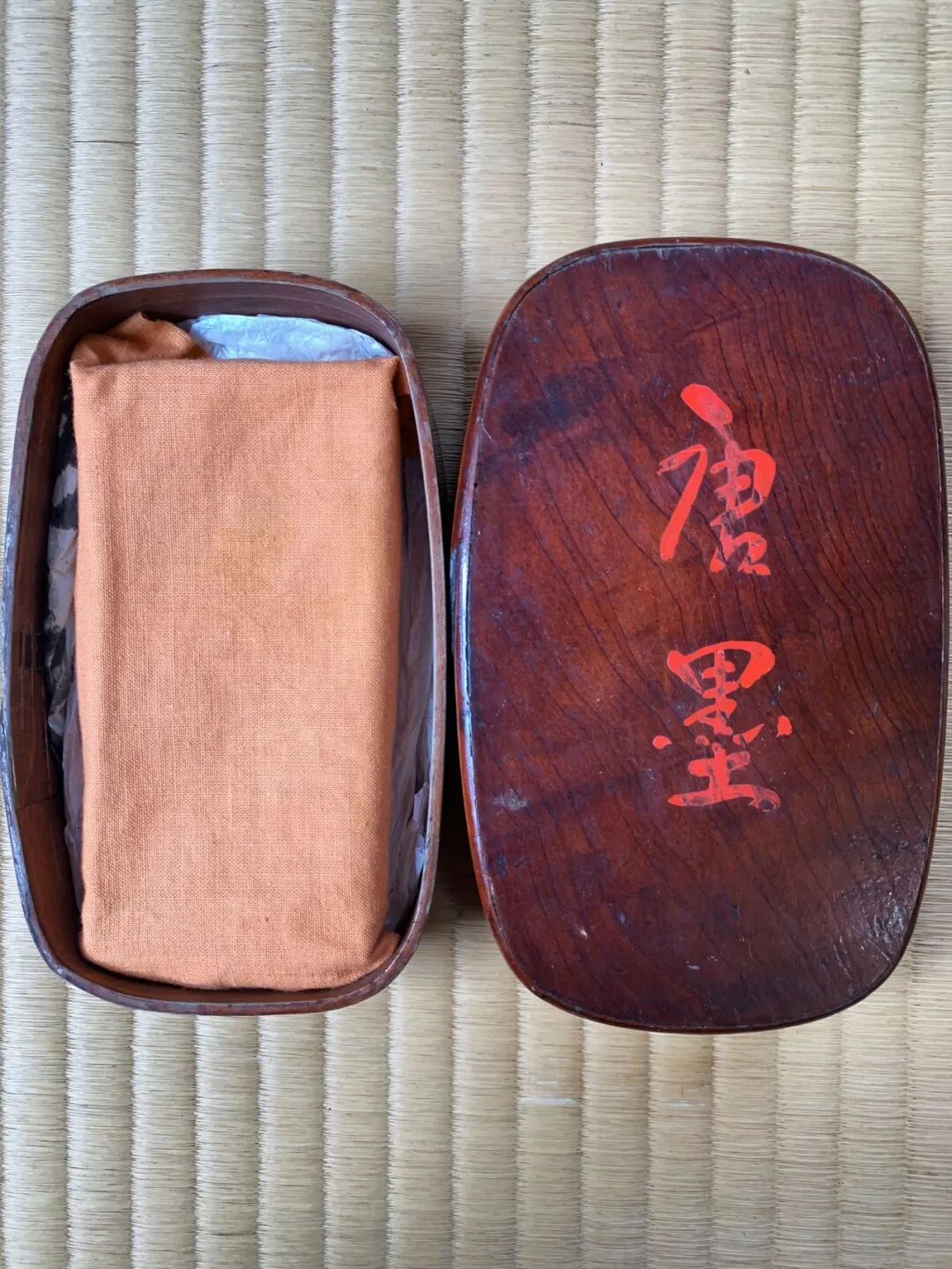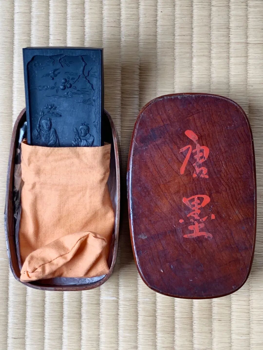这是一件年代老制作精美的老长方形墨条,厚块长方墨条,正面浅浮雕童子仙桃树下嬉戏图,背面阳刻减地浮雕篆体“雲墨“ 与篆体方章“胡遠”, 侧面阳刻楷书”乾隆年製”,整体风格精緻典雅,保留早期日本藏家搭配的量身定制布套以及木制盖盒,木盒上方朱漆楷书“唐墨”, 整套老墨与精緻收藏盖盒是日本儒学文人珍藏多年的珍品。