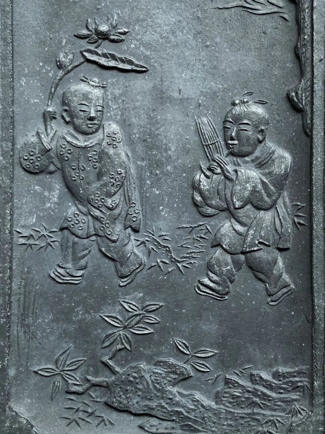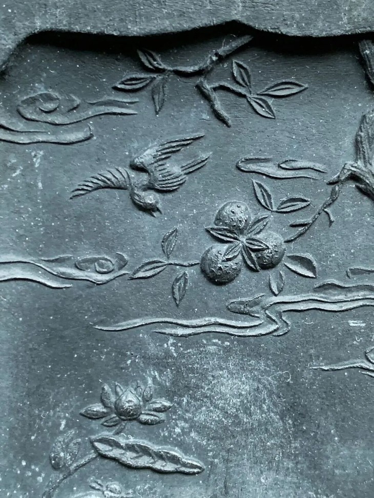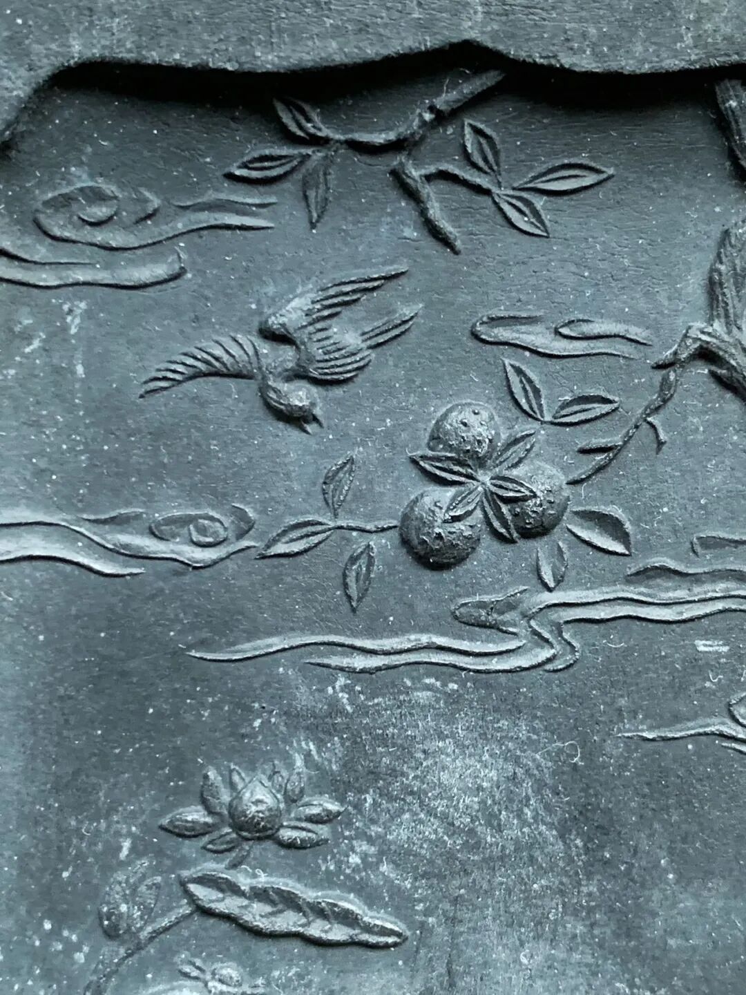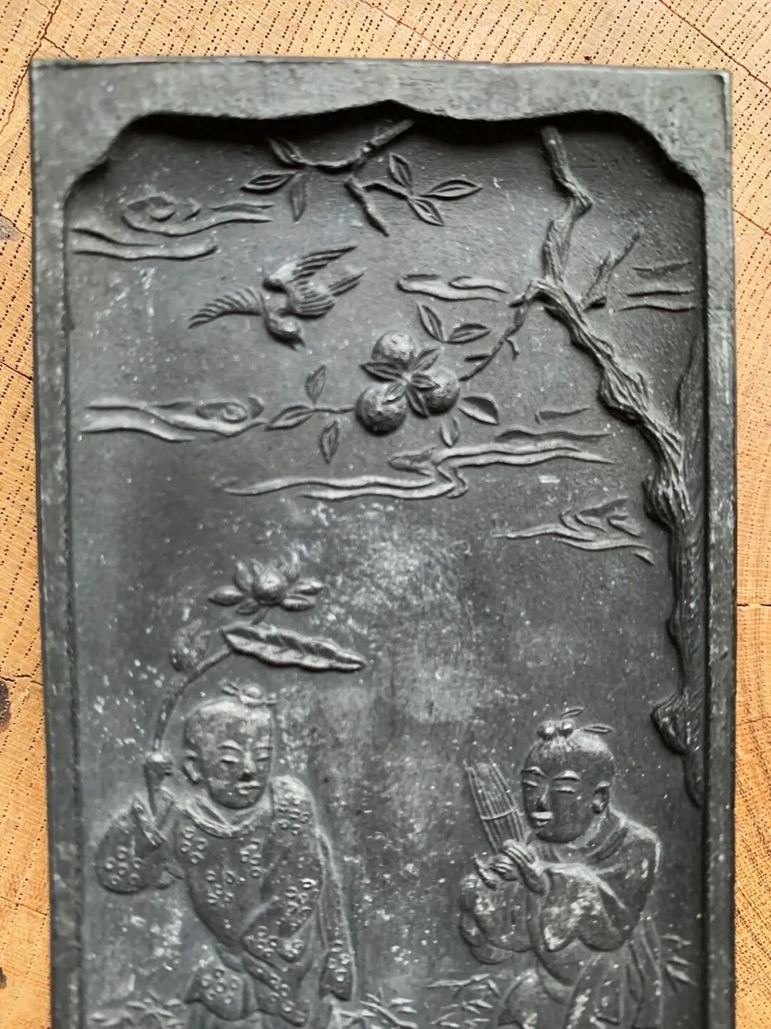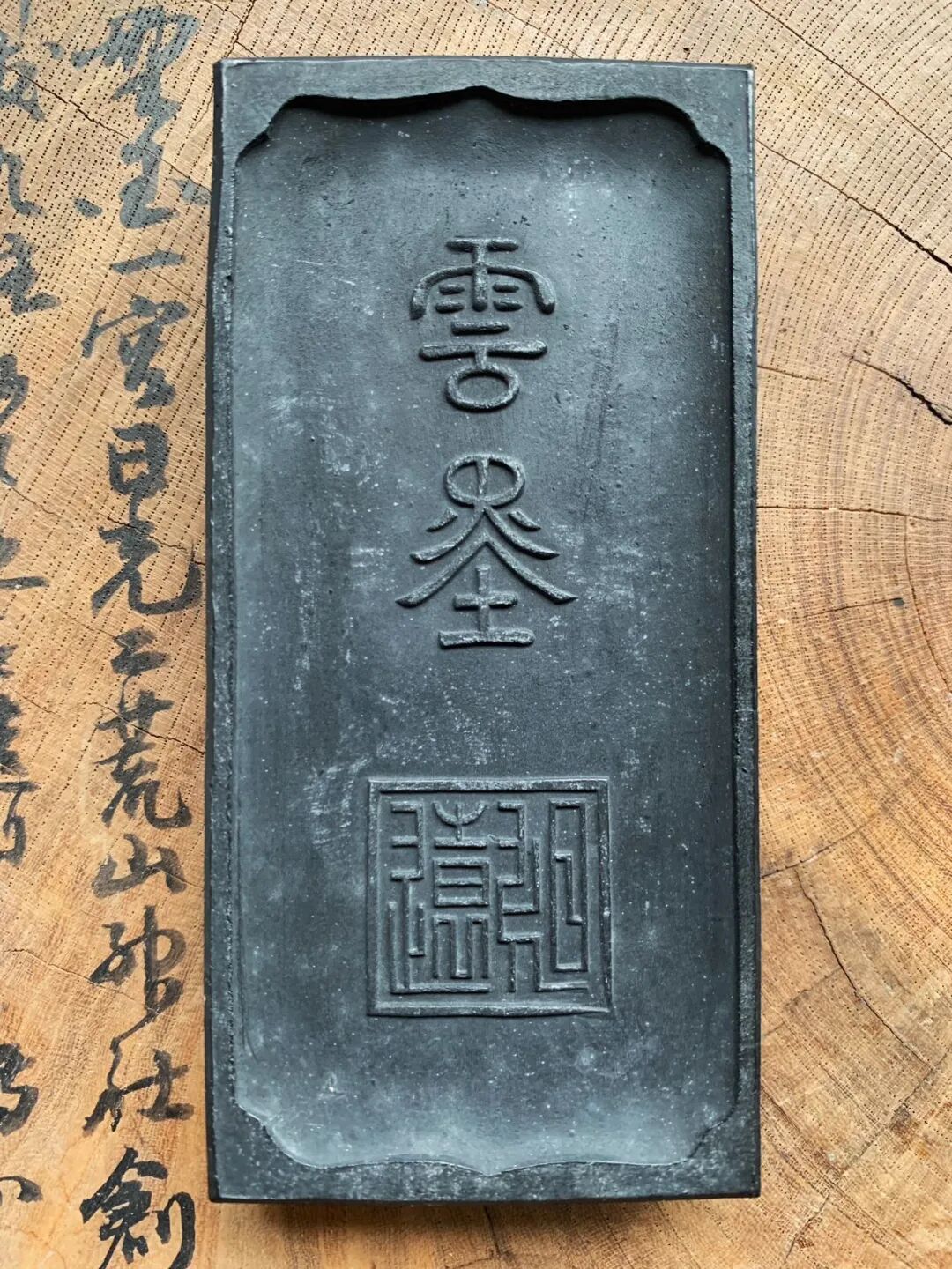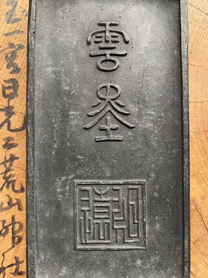 这是一件年代老制作精美的老长方形墨条,厚块长方墨条,正面浅浮雕童子仙桃树下嬉戏图,背面阳刻减地浮雕篆体“雲墨“ 与篆体方章“胡遠”, 侧面阳刻楷书”乾隆年製”,整体风格精緻典雅,保留早期日本藏家搭配的量身定制布套以及木制盖盒,木盒上方朱漆楷书“唐墨”, 整套老墨与精緻收藏盖盒是日本儒学文人珍藏多年的珍品。