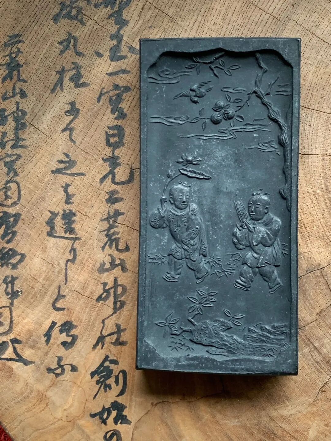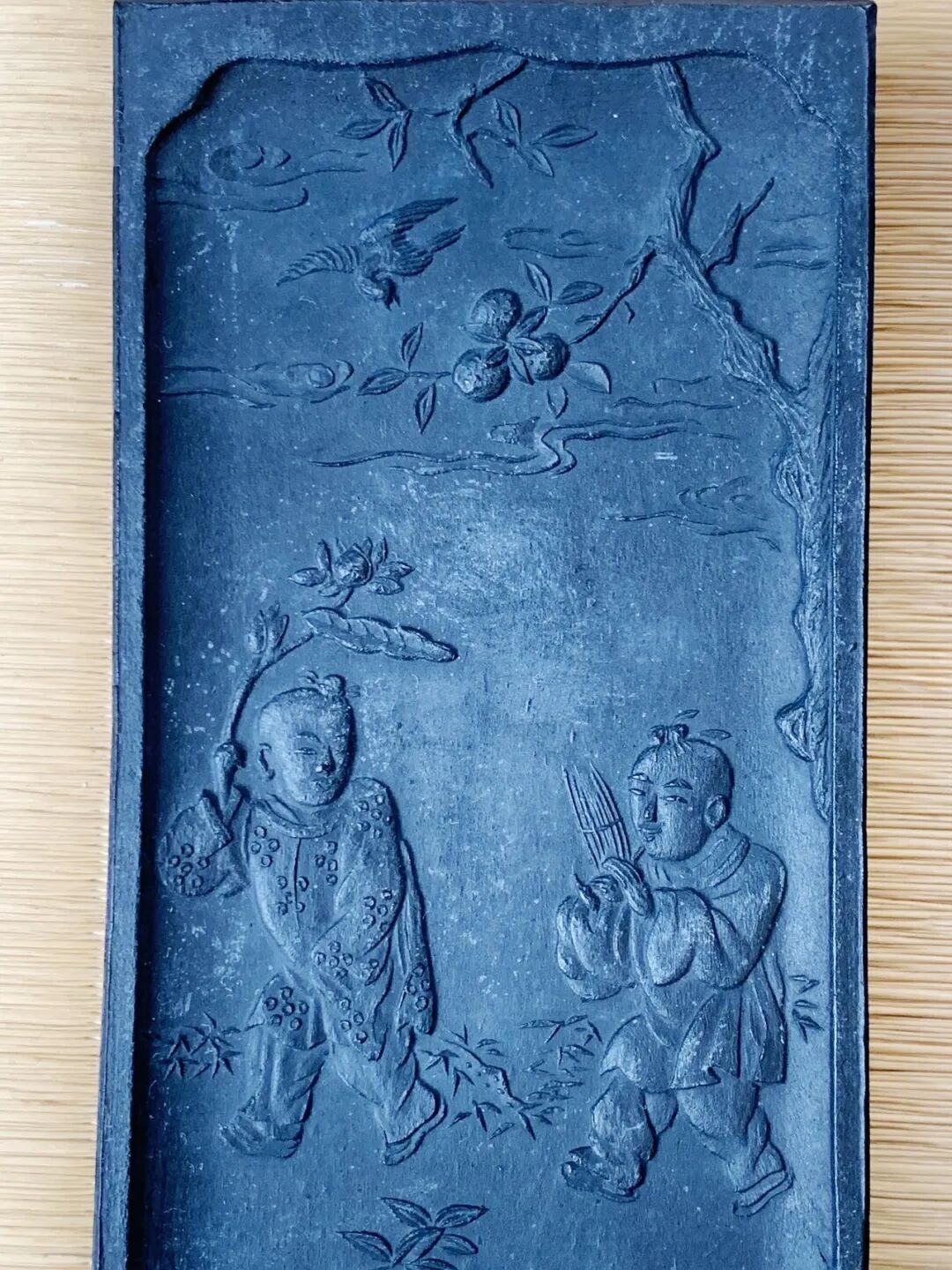 此套童子纹老墨条与木盒形式典雅、制作精美,见证早年日本儒学文人对中国制的文房用具的珍爱与收藏,此童子纹老墨条与木盒,除表面细微刮痕与边缘小磕痕外,保存完好。