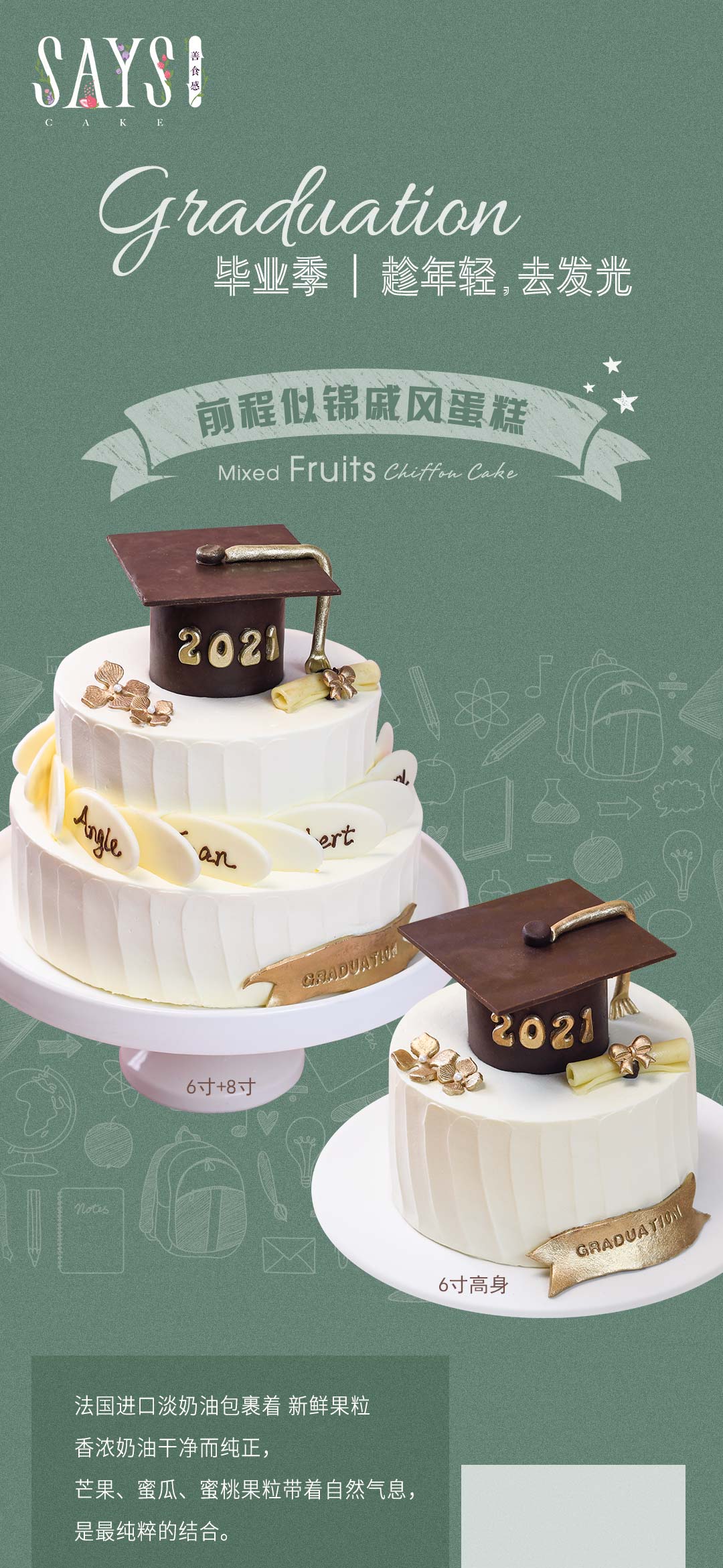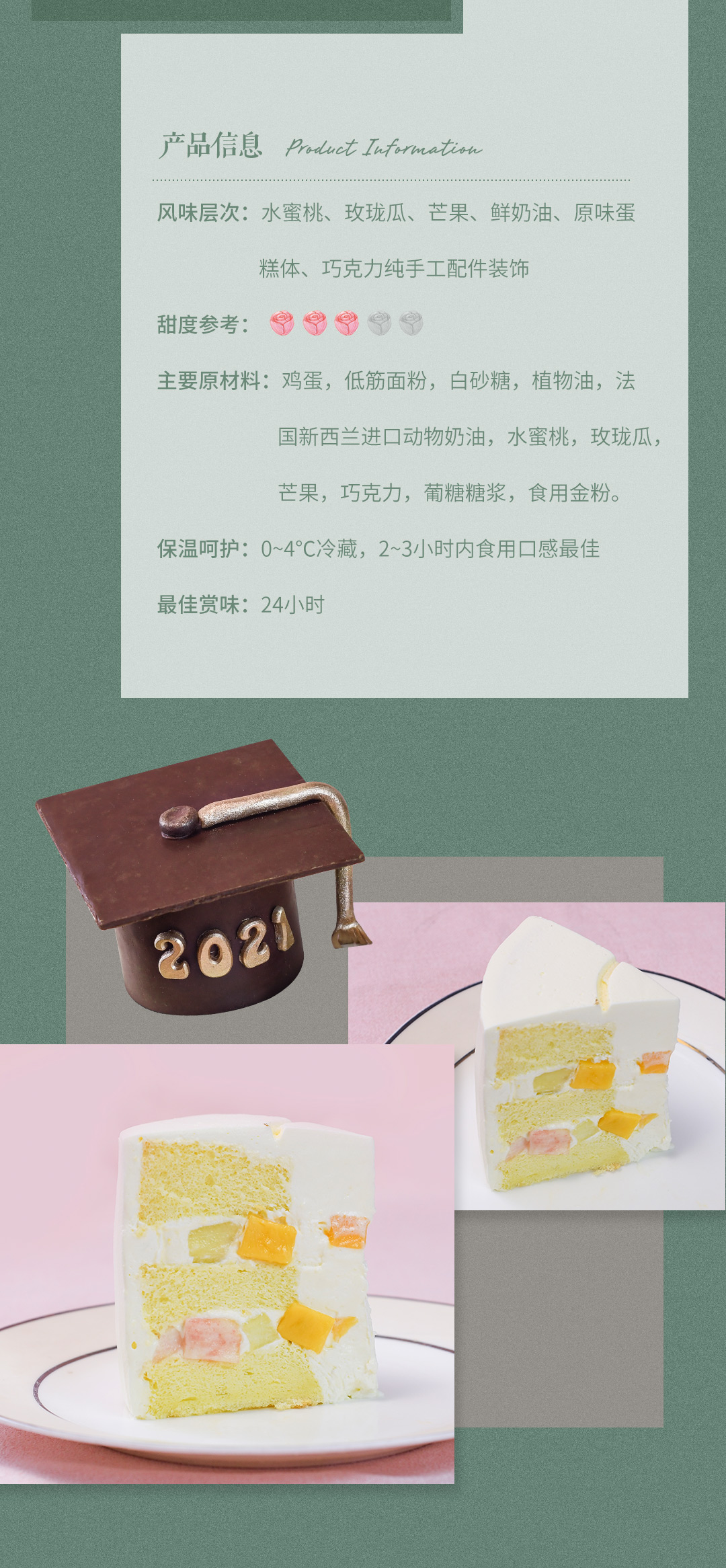 注:不同蛋糕口味选择有不同奶油抹面颜色,与该口味的原版戚风蛋糕颜色一致。蛋糕表面配件装饰统一为“前程似锦毕业帽款”。详情可联系客服微信13002032118咨询。送保温袋!