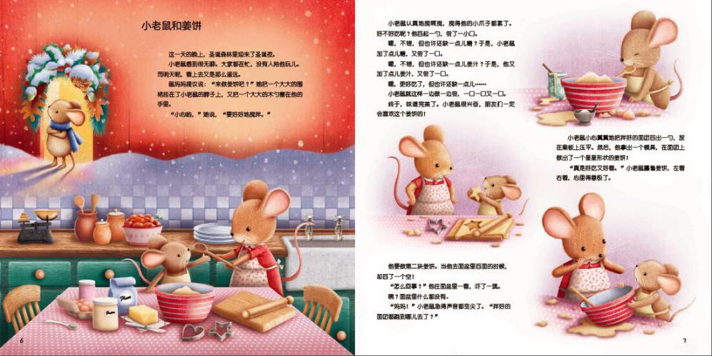 这本书的形象很生动可爱,每一个小动物都有需要面对的小困难:小獾想交朋友,小老鼠想给朋友们做姜饼;知更鸟想成为英雄;小狐狸想来一次冒险;小兔子迷失在雪地里……最终,他们都像一家人一样幸福地生活在圣诞森林里。